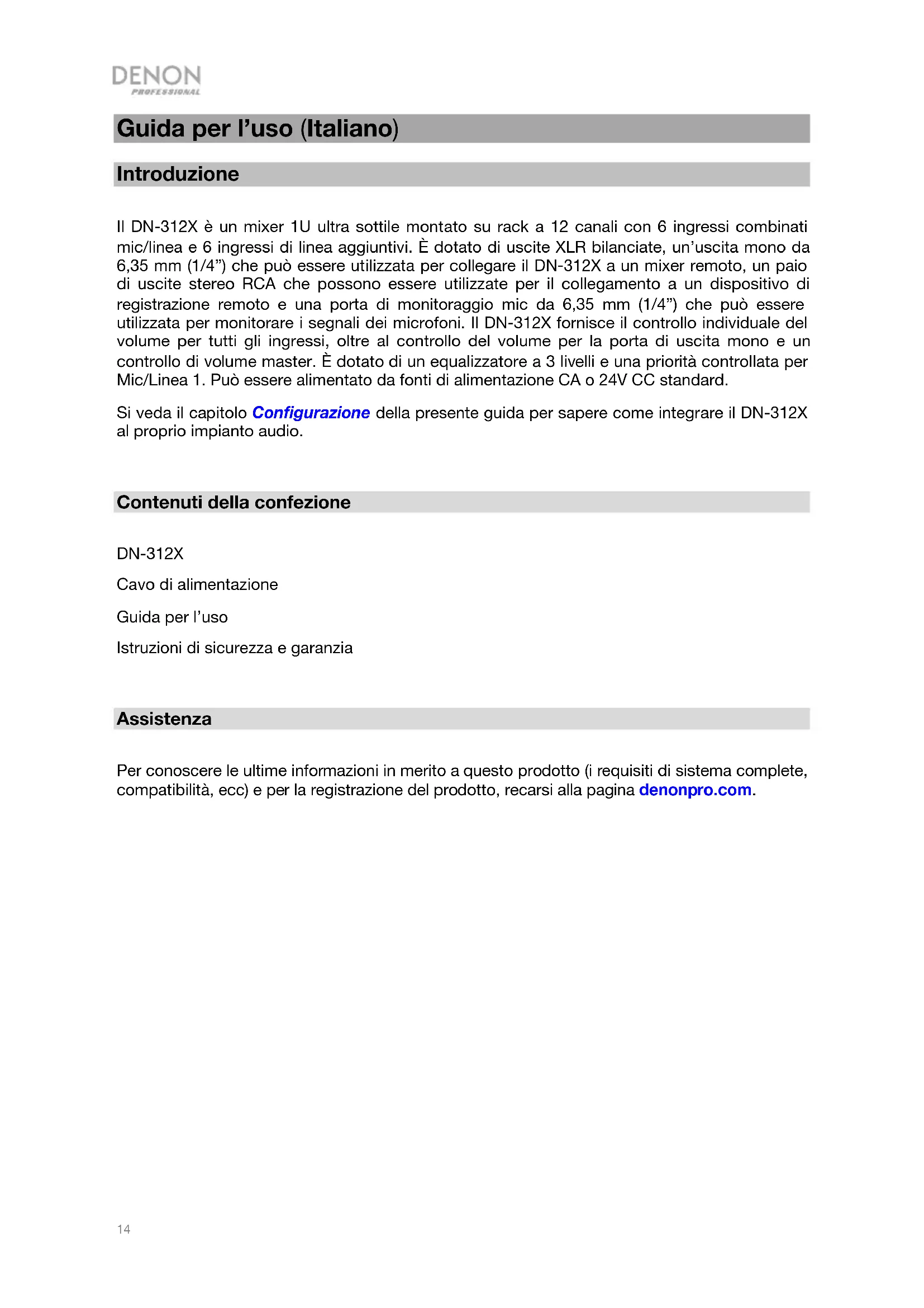 Scarica le istruzioni per il tuo Mixer in formato PDF gratuitamente! Trova il tuo manuale DN312X - DENON e riprendi in mano il tuo dispositivo elettronico. In questa pagina sono pubblicati tutti i documenti necessari per l'utilizzo del tuo dispositivo. DN312X del marchio DENON.
