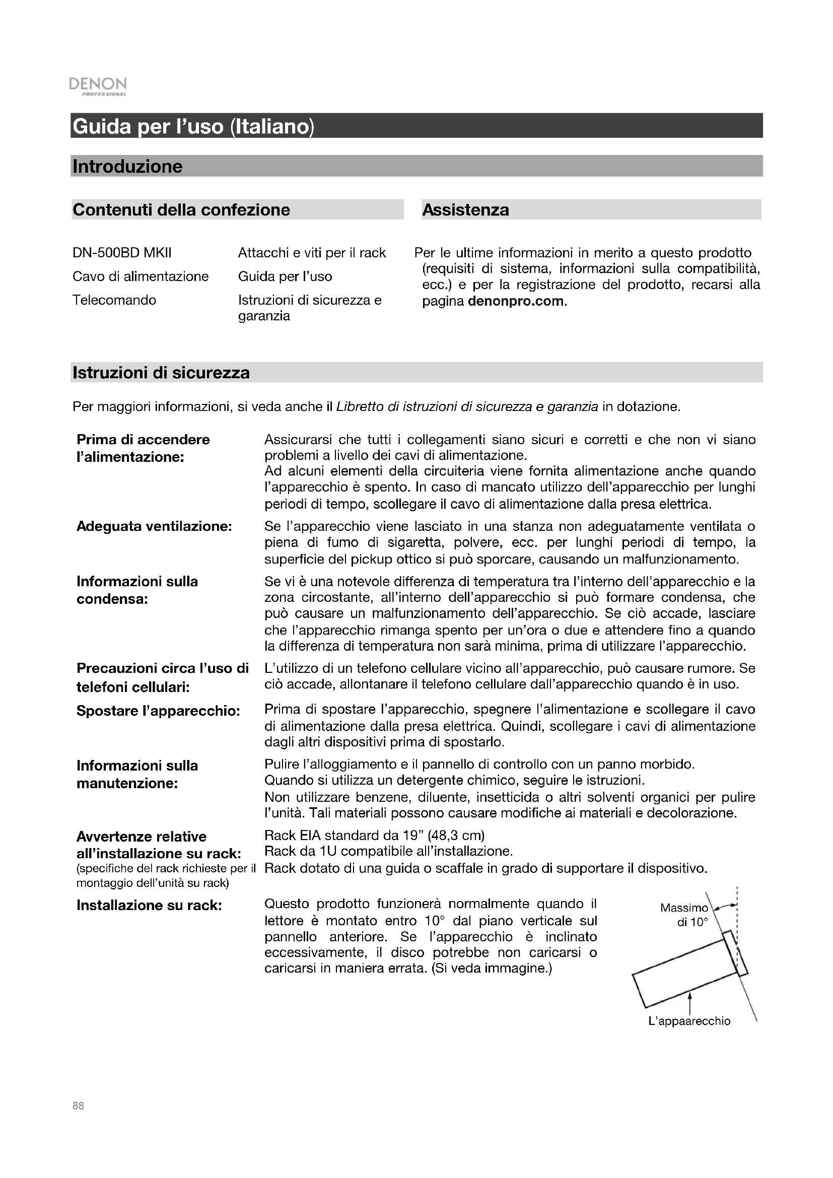 ttacchi e viti per il rack Guida per l’uso Istruzioni di sicurezza e garanzia Per le ultime informazioni in merito a questo prodotto (requisiti di sistema, informazioni sulla compatibilità, ecc.) e per la registrazione del prodotto, recarsi alla pagina denonpro.com. Istruzioni di sicurezza Per maggiori informazioni, si veda anche il Libretto di istruzioni di sicurezza e garanzia in dotazione. Prima di accendere l’alimentazione: