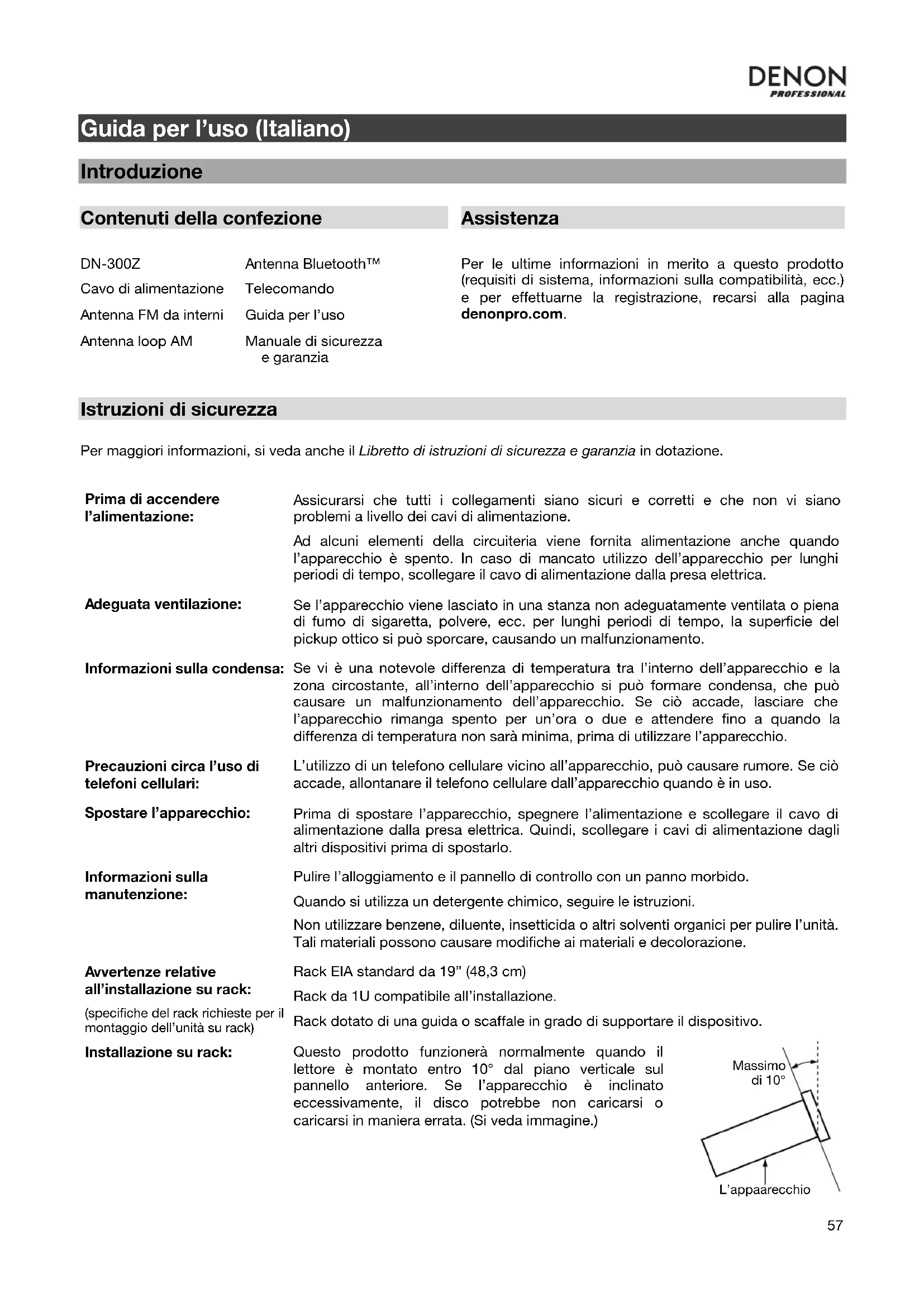 ntenna Bluetooth™ Telecomando Guida per l’uso Manuale di sicurezza e garanzia Per le ultime informazioni in merito a questo prodotto (requisiti di sistema, informazioni sulla compatibilità, ecc.) e per effettuarne la registrazione, recarsi alla pagina denonpro.com. Istruzioni di sicurezza Per maggiori informazioni, si veda anche il Libretto di istruzioni di sicurezza e garanzia in dotazione. Prima di accendere l’alimentazione: