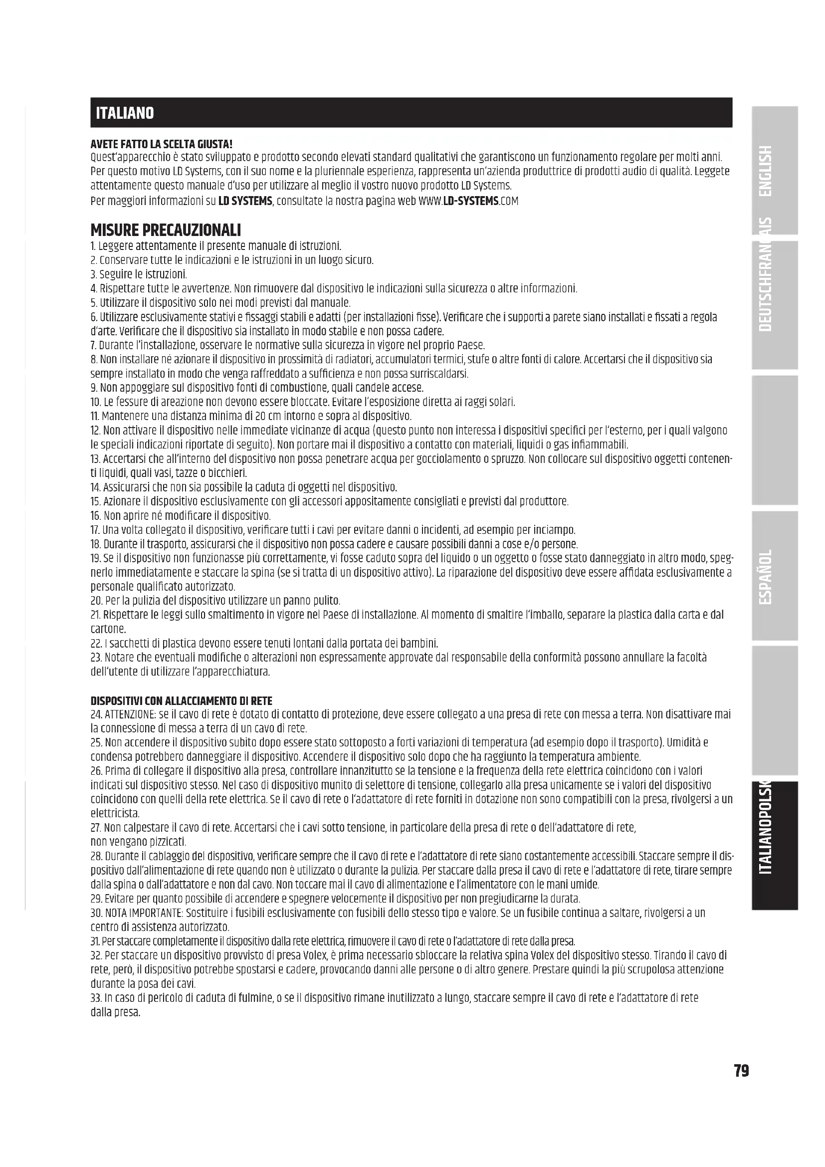 ITALIANO MISURE PRECAUZIONALI 79 INTRODUZIONE 80 CONNETTORI, ELEMENTI DI COMANDO E DI VISUALIZZAZIONE 81