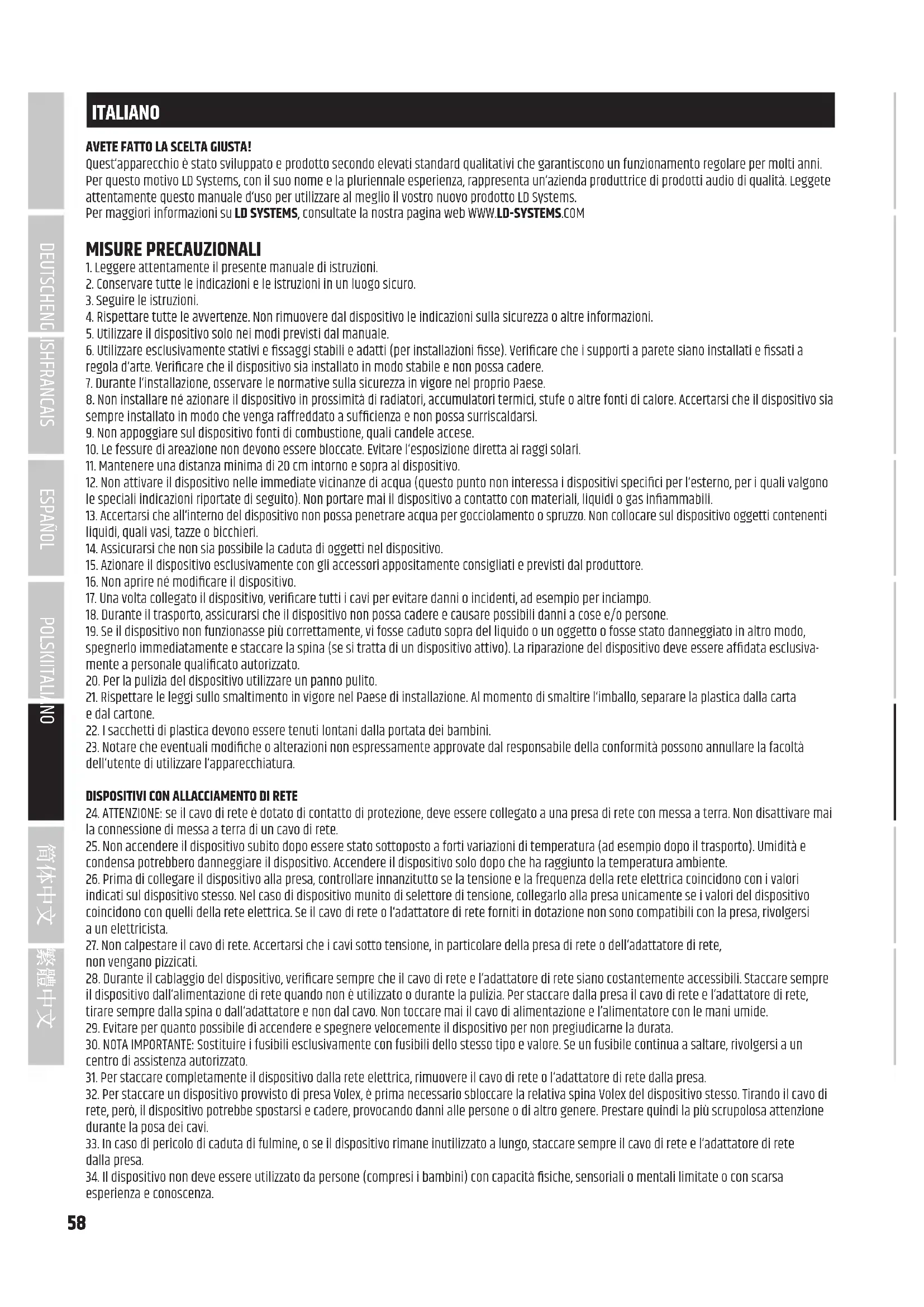 ITALIANO AVETE FATTO LA SCELTA GIUSTA! Quest‘apparecchio è stato sviluppato e prodotto secondo elevati standard qualitativi che garantiscono un funzionamento regolare per molti anni. Per questo motivo LD Systems, con il suo nome e la pluriennale esperienza, rappresenta un‘azienda produttrice di prodotti audio di qualità. Leggete attentamente questo manuale d‘uso per utilizzare al meglio il vostro nuovo prodotto LD Systems. Per maggiori informazioni su LD SYSTEMS, consultate la nostra pagina web WWW.LD-SYSTEMS.COM MISURE PRECAUZIONALI