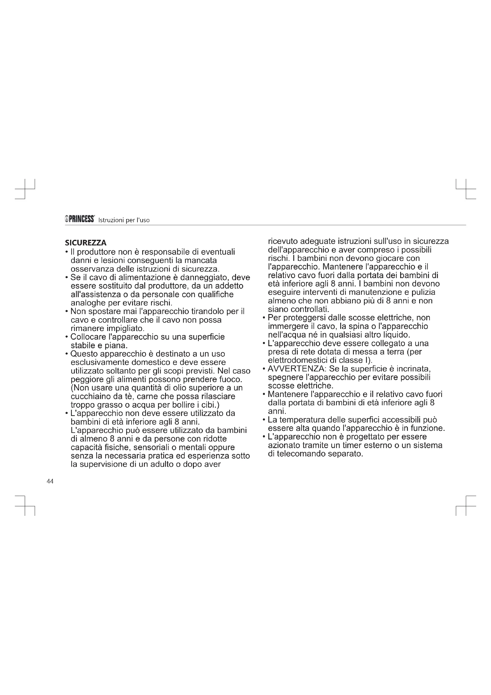 - L'apparecchio non deve essere utilizzato da bambini di età inferiore agli 8 anni. L'apparecchio può essere utilizzato da bambini di almeno 8 anni e da persone con ridotte capacità fisiche, sensoriali o mentali oppure senza la necessaria pratica ed esperienza sotto la supervisione di un adulto o dopo aver ricevuto adeguate istruzioni sull'uso in sicurezza dell'apparecchio e aver compreso i possibili rischi. I bambini non devono giocare con l'apparecchio. Mantenere l'apparecchio e il relativo cavo fuori dalla portata dei bambini di età inferiore agli 8 anni. I bambini non devono eseguire interventi di manutenzione e pulizia almeno che non abbiano più di 8 anni e non siano controllati.
