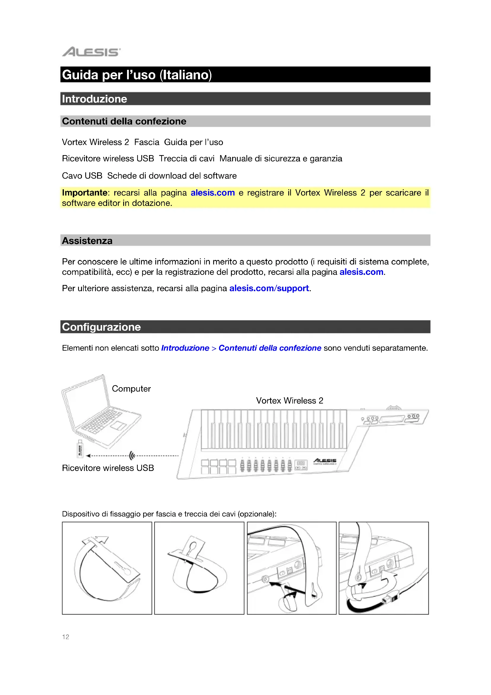 Guida per l’uso (Italiano) Introduzione Contenuti della confezione Vortex Wireless 2 Fascia Guida per l’uso Ricevitore wireless USB Treccia di cavi Manuale di sicurezza e garanzia Cavo USB Schede di download del software Importante: recarsi alla pagina alesis.com e registrare il Vortex Wireless 2 per scaricare il software editor in dotazione.