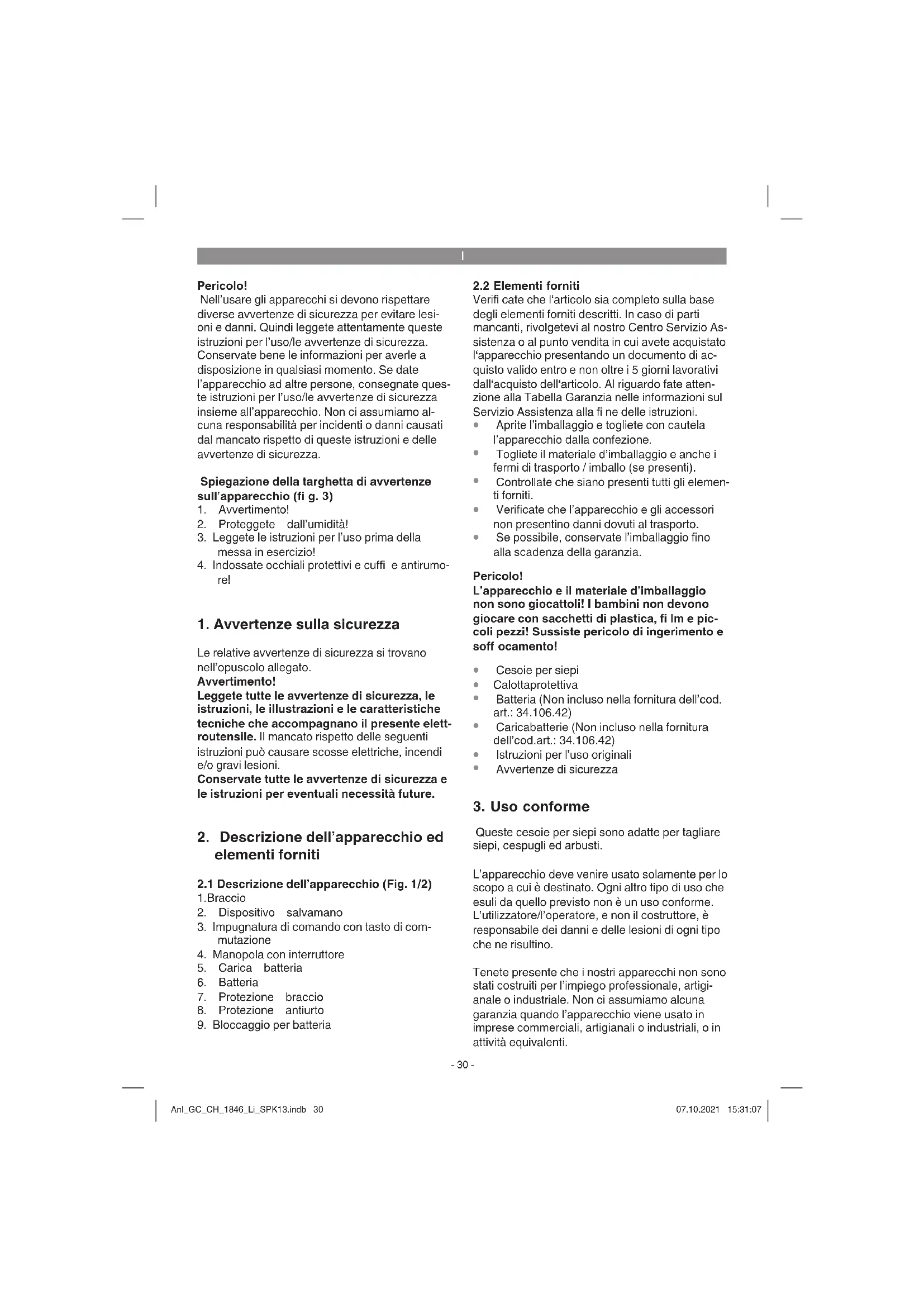 Queste cesoie per siepi sono adatte per tagliare siepi, cespugli ed arbusti. L’apparecchio deve venire usato solamente per lo scopo a cui è destinato. Ogni altro tipo di uso che esuli da quello previsto non è un uso conforme. L’utilizzatore/l’operatore, e non il costruttore, è responsabile dei danni e delle lesioni di ogni tipo che ne risultino. Tenete presente che i nostri apparecchi non sono stati costruiti per l’impiego professionale, artigi- anale o industriale. Non ci assumiamo alcuna garanzia quando l’apparecchio viene usato in imprese commerciali, artigianali o industriali, o in attività equivalenti. Anl_GC_CH_1846_Li_SPK13.indb 30Anl_GC_CH_1846_Li_SPK13.indb 30 07.10.2021 15:31:0707.10.2021 15:31:07I