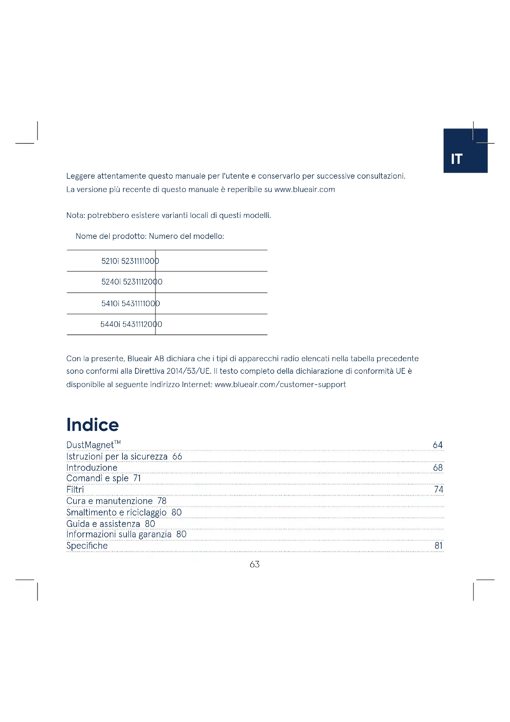 DustMagnet 64 Istruzioni per la sicurezza 66 Introduzione 68 Comandi e spie 71 Filtri 74 Cura e manutenzione 78 Smaltimento e riciclaggio 80 Guida e assistenza 80 Informazioni sulla garanzia 80 Specifiche 81 Indice Leggere attentamente questo manuale per l'utente e conservarlo per successive consultazioni. La versione più recente di questo manuale è reperibile su www.blueair.com Nota: potrebbero esistere varianti locali di questi modelli. Con la presente, Blueair AB dichiara che i tipi di apparecchi radio elencati nella tabella precedente sono conformi alla Direttiva 2014/53/UE. Il testo completo della dichiarazione di conformità UE è disponibile al seguente indirizzo Internet: www.blueair.com/customer-support Nome del prodotto: Numero del modello: 5210i 5231111000 5240i 5231112000 5410i 5431111000 5440i 5431112000 TM64 Blueair DustMagnet