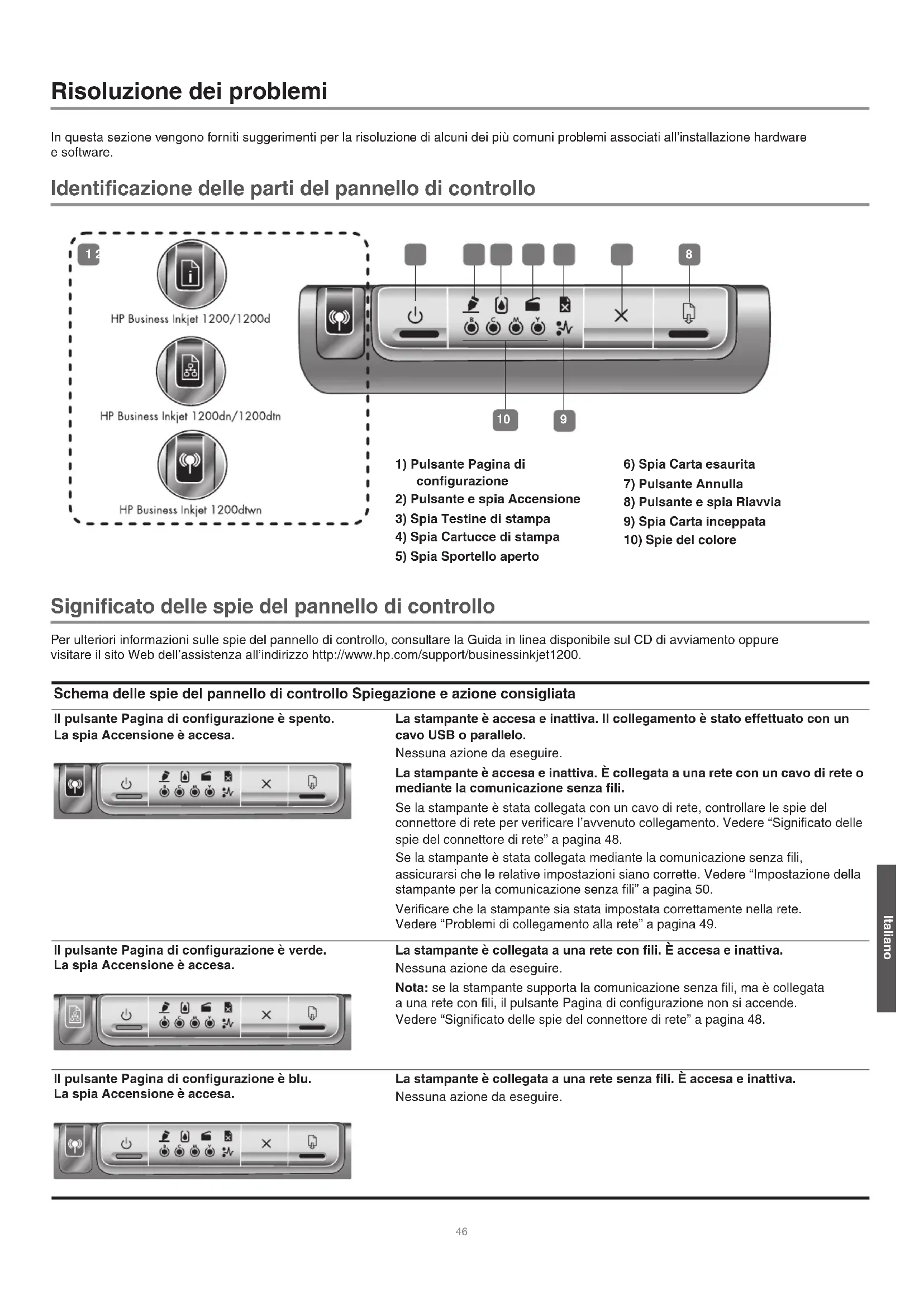 chiudere le finestre di dialogo. Problemi di collegamento a una rete con fili Se la spia Collegamento del connettore di rete non si accende, assicurarsi che le condizioni riportate nella sezione “Risoluzione dei problemi generali di rete” siano state soddisfatte. Benché non sia consigliabile assegnare alla stampante un indirizzo IP statico, con tale procedura si potrebbero risolvere alcuni problemi di installazione, come ad esempio un conflitto con un firewall personalizzato. Per ulteriori informazioni, consultare la Guida in linea. Problemi di impostazione della comunicazione senza fili Se non è possibile stabilire una comunicazione con la stampante dopo avere completato l’installazione del software e avere rimosso il cavo di rete, è possibile che una o più delle seguenti impostazioni di rete della stampante non siano corrette: Nome di rete (SSID) Modalità di comunicazione Canale (solo reti ad hoc) Impostazioni di sicurezza e chiave di crittografia Per informazioni sulla modifica di tali impostazioni, vedere la sezione “Impostazione della stampante per la comunicazione senza fili” a pagina 50. Modifica delle impostazioni di rete della stampante Se non è possibile stabilire una comunicazione fra la rete e la stampante, modificare le impostazioni di rete della stampante: 1 Tenendo premuto il pulsante Pagina di configurazione, premere (pulsante Riavvia) tre volte. 2 Se è stato installato il driver della stampante, disinstallarlo e procedere nuovamente all’installazione. Nota: per informazioni aggiornate, leggere il file Readme o le note di rilascio oppure visitare il sito Web dell’assistenza all’indirizzo http://www.hp.com/support/businessinkjet1200. HPCrickMLK_GSG_UGFDIA.book Page 49 Wednesday, May 19, 2004 4:26 PM50 Risoluzione dei problemi e strumenti di configurazione Per la risoluzione dei problemi o la configurazione della stampante, sono a disposizione i seguenti strumenti. Per ulteriori informazioni su tali strumenti, consultare la Guida in linea sul CD di avviamento. Pagina di configurazione Utilizzare la pagina di configurazione per la visualizzazione delle impostazioni correnti della stampante, la risoluzione dei problemi di stampa e la verifica dell’installazione degli accessori opzionali, come ad esempio i vassoi. La pagina di configurazione include inoltre un registro degli eventi recenti. Se la stampante è collegata a una rete, viene stampata un’ulteriore pagina di configurazione di rete in cui sono indicate le impostazioni di rete della stampante. In caso di necessità, prima di contattare HP, stampare la pagina di configurazione. Per stampare una pagina di configurazione Premere una volta il pulsante Pagina di configurazione. Server Web incorporato Se la stampante è collegata a una rete, è possibile utilizzare il server Web incorporato per visualizzare le informazioni di stato, modificare le impostazioni e gestire la stampante tramite il computer. Per aprire il server Web incorporato In un browser Web supportato, digitare l’indirizzo IP assegnato alla stampante. Ad esempio, se l’indirizzo IP è 123.123.123.123, digitare il seguente indirizzo nel browser Web: http://123.123.123.123. L’indirizzo IP della stampante è visualizzato nella pagina di configurazione. Dopo avere aperto il server Web incorporato, è possibile inserirlo nei segnalibri in modo da potervi accedere con rapidità in futuro. Impostazione della stampante per la comunicazione senza fili La stampante è stata progettata per le reti senza fili 802.11g ed è compatibile con le reti 802.11b. Nota: per un funzionamento ottimale della rete senza fili, è necessario che le seguenti impostazioni siano identiche nel computer e nel dispositivo. Configurazione delle impostazioni di base della comunicazione senza fili Per installare la stampante in una rete senza fili, è necessario conoscere la modalità di comunicazione della rete e il nome di rete (SSID). Controllare la utility di configurazione della scheda di rete del computer o del WAP (Wireless Access Point) della rete. Modalità di comunicazione Sono disponibili due opzioni per la modalità di comunicazione di una rete. Infrastruttura (consigliata) Se la stampante è impostata sulla modalità Infrastruttura, comunica con gli altri dispositivi della rete, a prescindere che questi siano con o senza fili, tramite un WAP. I WAP in genere fungono da router o gateway nelle reti di piccole dimensioni. Ad hoc (solo utenti avanzati) Se la stampante è impostata sulla modalità di comunicazione Ad hoc, comunica direttamente con gli altri dispositivi senza fili senza utilizzare un WAP. Per istruzioni sull’installazione della stampante in una rete Ad hoc esistente, visitare il sito Web HP all’indirizzo http://www.hp.com/support. Nome di rete (SSID) Il nome di rete, definito anche Service Set Identifier (SSID), identifica una particolare rete senza fili. Per funzionare in una rete, è necessario che un dispositivo ne conosca il nome. Configurazione delle impostazioni di sicurezza di una rete senza fili Tipi di sicurezza senza fili È possibile configurare la stampante in modo da utilizzare le seguenti opzioni di sicurezza: Sistema aperto (nessun livello di sicurezza) La rete non richiede misure di sicurezza per l’autorizzazione o la cifratura. Si tratta dell’impostazione predefinita della stampante. La stampante tenta di rilevare e di associarsi automaticamente a una rete senza fili con sistema aperto. Wired Equivalent Privacy (WEP) Il protocollo Wired Equivalent Privacy (WEP) garantisce la sicurezza cifrando i dati inviati tramite onde radio da un dispositivo senza fili a un altro. I dispositivi presenti in una rete compatibile con questo protocollo utilizzano le chiavi WEP per codificare i dati. Se la rete utilizza il protocollo WEP, è necessario conoscere le chiavi WEP utilizzate. Wi-Fi Protected Access (WPA) Lo standard Wi-Fi Protected Access (WPA) garantisce la sicurezza con le modalità indicate di seguito: Cifrando i dati 