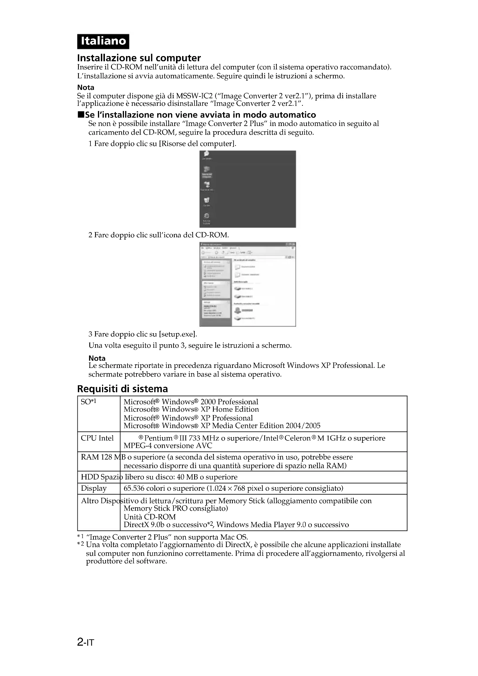 ” no se especifican en este manual.2-IT Italiano Installazione sul computer Inserire il CD-ROM nell’unità di lettura del computer (con il sistema operativo raccomandato). L’installazione si avvia automaticamente. Seguire quindi le istruzioni a schermo. Nota Se il computer dispone già di MSSW-IC2 (“Image Converter 2 ver2.1”), prima di installare l’applicazione è necessario disinstallare “Image Converter 2 ver2.1”. x Se l’installazione non viene avviata in modo automatico Se non è possibile installare “Image Converter 2 Plus” in modo automatico in seguito al caricamento del CD-ROM, seguire la procedura descritta di seguito. 1 Fare doppio clic su [Risorse del computer]. 2 Fare doppio clic sull’icona del CD-ROM. 3 Fare doppio clic su [setup.exe]. Una volta eseguito il punto 3, seguire le istruzioni a schermo. Nota Le schermate riportate in precedenza riguardano Microsoft Windows XP Professional. Le schermate potrebbero variare in base al sistema operativo. Requisiti di sistema SO*