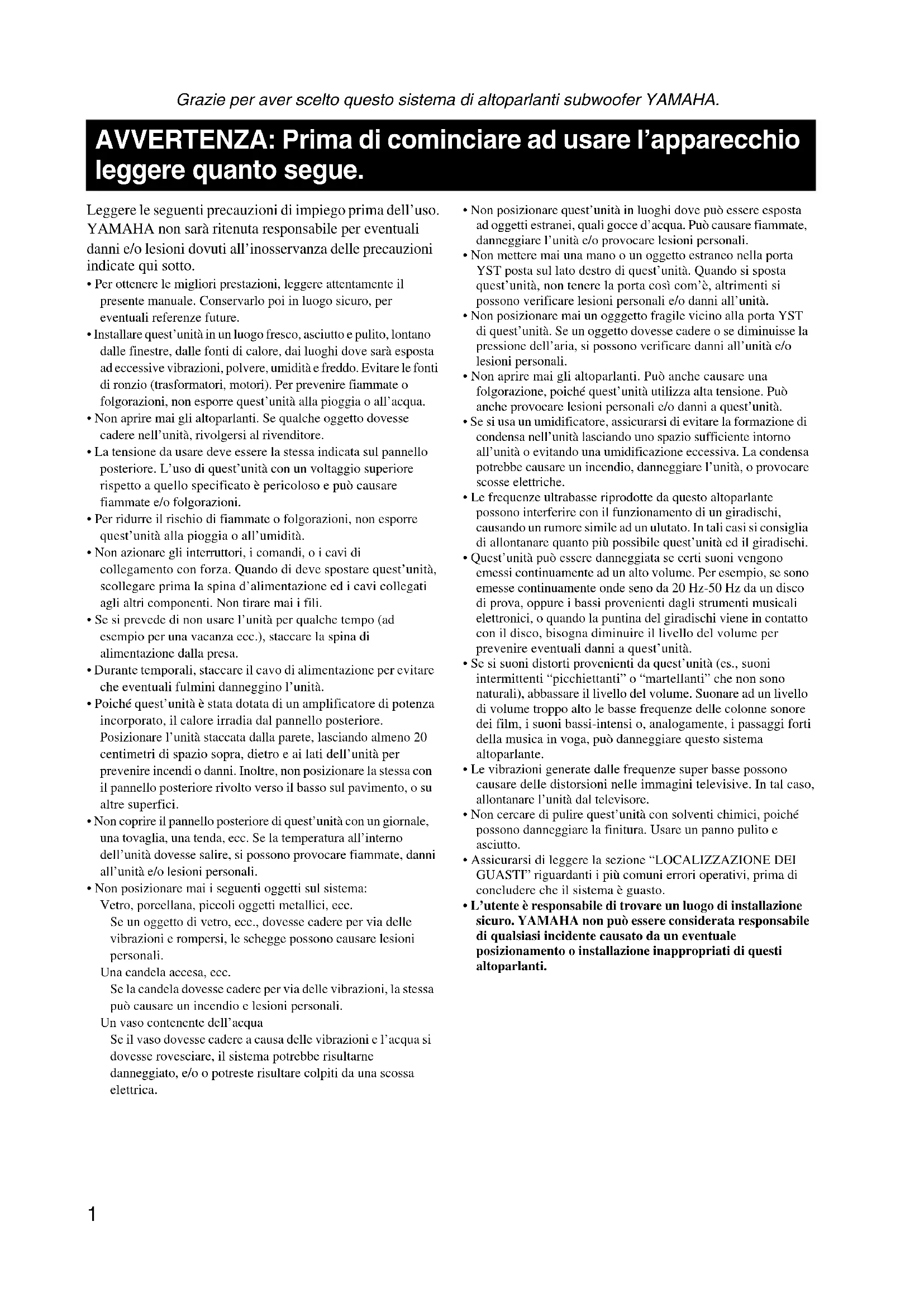 Grazie per aver scelto questo sistema di altoparlanti subwoofer YAMAHA. Leggere le seguenti precauzioni di impiego prima dell’uso. YAMAHA non sarà ritenuta responsabile per eventuali danni e/o lesioni dovuti all’inosservanza delle precauzioni indicate qui sotto.