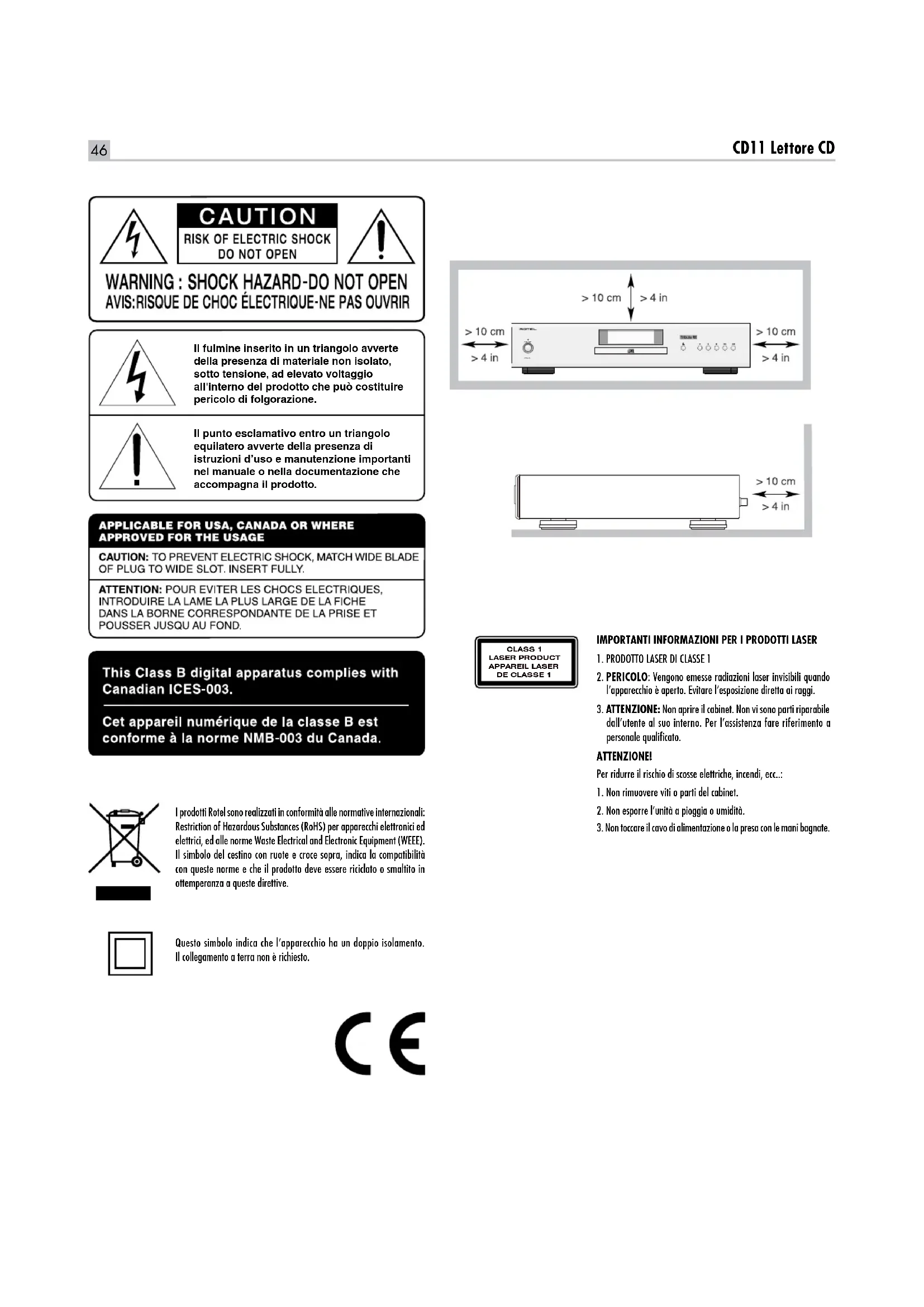 - Consultare il vostro rivenditore o un tecnico specializzato radio/TV per ulteriori consigli. Attenzione Questo dispositivo, in conformità al regolamento FCC Parte, 15 è soggetto alle seguenti condizioni: (1) Questo apparecchio non dovrebbe causare interferenze nocive, e (2) deve poter sopportare interferenze provenienti da altri apparecchi che potrebbero incidere sul suo funzionamento. Importanti informazioni di sicurezza ATTENZIONE: Non vi sono all’interno parti riparabili dall’utente. Per l’assistenza fare riferimento a personale qualificato. ATTENZIONE: Per ridurre il rischio di incendio e di scossa elettrica non esporre l’apparecchio all’umidità o all’acqua. Non posizionare contenitori d’acqua, ad esempio vasi, sull’unità. Evitare che cadano oggetti all’interno del cabinet. Se l’apparecchio è stato esposto all’umidità o un oggetto è caduto all’interno del cabinet, staccare immediatamente il cavo di alimentazione dalla presa elettrica. Portare l’apparecchio ad un centro di assistenza qualificato per i necessari controlli e riparazioni. Leggere attentamente tutte le istruzioni. Conservare questo manuale. Seguire attentamente tutte le avvertenze. Seguire tutte le istruzioni d’uso. Non utilizzare il prodotto vicino all’acqua. Pulire il cabinet solo con un panno asciutto o con un piccolo aspirapolvere. Non posizionare l’apparecchio su un letto, divano, tappeto, o superfici che possano bloccare le aperture di ventilazione. Se l’apparecchio è collocato in una libreria o in mobile apposito, fare in modo che vi sia abbastanza spazio attorno all’unità per consentire la ventilazione ed un adeguato raffreddamento. Tenerlo lontano da fonti di calore come caloriferi, termoconvettori, stufe o altri apparecchi che generano calore. Non cercare di eliminare la messa a terra o la polarizzazione. Se la spina del cavo di alimentazione fornito in dotazione non corrisponde allo standard delle vostra presa consultate un elettricista per la sostituzione di quest’ultima. Non far passare il cavo di alimentazione dove potrebbe venir schiacciato, pizzicato, piegato eccessivamente, esposto al calore o danneggiato. Fare particolare attenzione al posizionamento del cavo di alimentazione in corrispondenza della presa elettrica e nel punto in cui esce dalla parte posteriore dell’apparecchio. Usare esclusivamente accessori indicati dal produttore. Utilizzare solo stand, scaffali o supporti abbastanza forte per sostenere la prodotto. Prestare molta cautela nel muoverlo quando si trova su un supporto o uno scaffale per evitare di ferirvi o danni al la prodotto in caso di caduta. Il cavo di alimentazione deve essere scollegato dalla presa elettrica durante forti temporali con fulmini e quando l’apparecchiatura rimane inutilizzata per un lungo periodo di tempo. L’apparecchio non deve più essere utilizzato e fatto ispezionare da personale qualificato quando: il cavo di alimentazione o la spina sono stati danneggiati; sono caduti oggetti o liquidi all’interno dell’apparecchio; è stato esposto alla pioggia; non sembra funzionare in modo normale; è caduto o è stato in qualche modo danneggiato. L’apparecchio deve essere usato in clima non tropicali. La ventilazione non dovrebbe essere impedita coprendo le aperture di ventilazione con oggetti come giornali, tovaglie, tende, ecc. Nessuna fonte di fiamme libere, come candele accese, dovrebbe essere collocata sull’apparecchio. Il contatto con terminali o cavi non isolati può provocare una sensazione spiacevole. Lasciare almeno 10 cm di spazio libero su tutti i lati del prodotto. ATTENZIONE: La presa del cavo di alimentazione sul pannello posteriore è il mezzo principale per scollegare l’apparecchio dall’alimentazione. Posizionarlo quindi in modo tale che la presa sia sempre facilmente accessibile. L’apparecchio deve essere collegato esclusivamente ad un’alimentazione elettrica del tipo indicato sul pannello posteriore. (USA:120V/60Hz, CE: 230V/50Hz). Collegare l’unità alla presa di alimentazione solo con il cavo fornito o con un esatto equivalente. Non modificare il cavo in dotazione in alcun modo. Non cercare di eliminare la messa a terra o la polarizzazione. Non utilizzare prolunghe. La presa del cavo di alimentazione sul pannello posteriore è il mezzo principale per scollegarlo dall’alimentazione. Per scollegare completamente il prodotto, è necessario staccare fisicamente il cavo di alimentazione dalla presa elettrica e prodotto. Questo è l’unico modo per rimuovere completamente l’alimentazione dal la prodotto. Le batterie del telecomando non devono essere esposte ad eccessivo calore come raggi di sole, fuoco o simili. Le batterie devono essere riciclati o smaltiti secondo le linee guida statali e locali.48 CD11 Lettore CD Sommario Figura 1: Controlli e connessioni 4 Figura 2: Telecomando RR-D99 5 Figura 3: Collegamenti 6 Note importanti 7 Importanti informazioni di sicurezza ....................................47 Alcune informazioni su Rotel ..........................................48 Il vostro CD11 ....................................................48 Per Cominciare ....................................................49 Alcune precauzioni 49 Posizionamento 49 Identicazione dei comandi 49 Alimentazione AC e comandi ..........................................49 Ingresso alimentazione