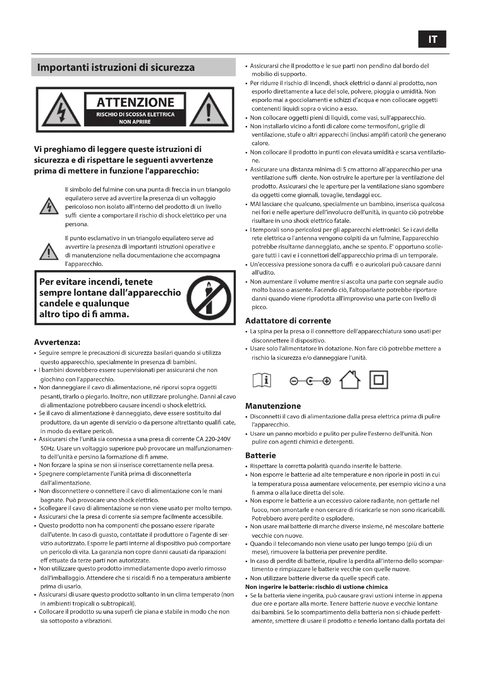 Vi preghiamo di leggere queste istruzioni di sicurezza e di rispettare le seguenti avvertenze prima di mettere in funzione l'apparecchio: Il simbolo del fulmine con una punta di freccia in un triangolo equilatero serve ad avvertire la presenza di un voltaggio pericoloso non isolato all’interno del prodotto di un livello su ciente a comportare il rischio di shock elettrico per una persona.Il punto esclamativo in un triangolo equilatero serve ad avvertire la presenza di importanti istruzioni operative e di manutenzione nella documentazione che accompagna l’apparecchio. Per evitare incendi, tenete sempre lontane dall’apparecchio candele e qualunque altro tipo di amma. Avvertenza: