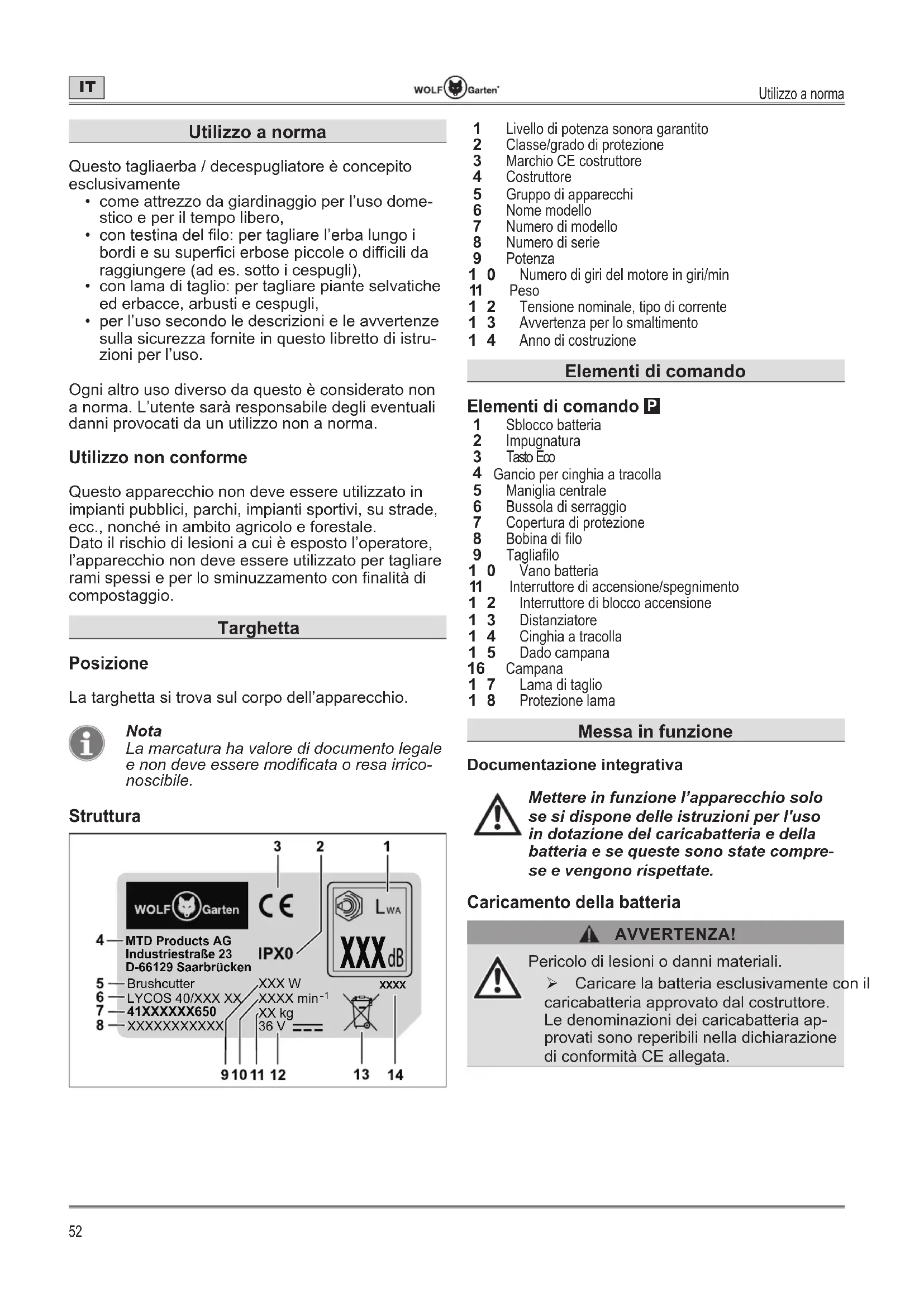 - per l’uso secondo le descrizioni e le avvertenze sulla sicurezza fornite in questo libretto di istru- zioni per l’uso. Ogni altro uso diverso da questo è considerato non a norma. L’utente sarà responsabile degli eventuali danni provocati da un utilizzo non a norma. 8WLOL]]RQRQFRQIRUPH Questo apparecchio non deve essere utilizzato in impianti pubblici, parchi, impianti sportivi, su strade, ecc., nonché in ambito agricolo e forestale. Dato il rischio di lesioni a cui è esposto l’operatore, l’apparecchio non deve essere utilizzato per tagliare UDPLVSHVVLHSHUORVPLQX]]DPHQWRFRQ¿QDOLWjGL compostaggio. 7DUJKHWWD 3RVL]LRQH La targhetta si trova sul corpo dell’apparecchio. Nota La marcatura ha valore di documento legale HQRQGHYHHVVHUHPRGL¿FDWDRUHVDLUULFR- noscibile. 6WUXWWXUD XXX W XX kg XXXX min