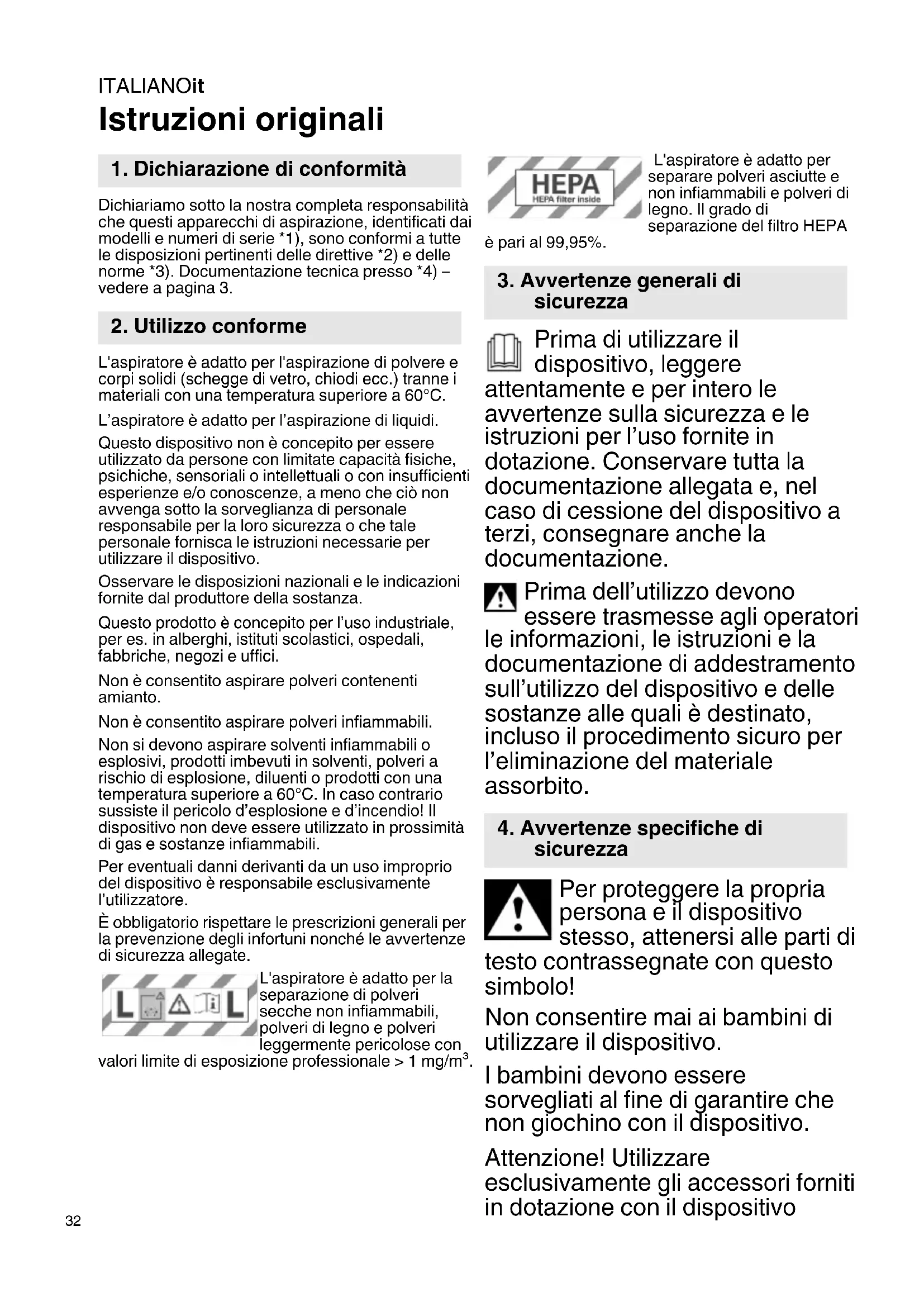 Istruzioni originali Dichiariamo sotto la nostra completa responsabilità che questi apparecchi di aspirazione, identificati dai modelli e numeri di serie *1), sono conformi a tutte le disposizioni pertinenti delle direttive *2) e delle norme *3). Documentazione tecnica presso *4) – vedere a pagina 3. L'aspiratore è adatto per l'aspirazione di polvere e corpi solidi (schegge di vetro, chiodi ecc.) tranne i materiali con una temperatura superiore a 60°C. L’aspiratore è adatto per l’aspirazione di liquidi. Questo dispositivo non è concepito per essere utilizzato da persone con limitate capacità fisiche, psichiche, sensoriali o intellettuali o con insufficienti esperienze e/o conoscenze, a meno che ciò non avvenga sotto la sorveglianza di personale responsabile per la loro sicurezza o che tale personale fornisca le istruzioni necessarie per utilizzare il dispositivo. Osservare le disposizioni nazionali e le indicazioni fornite dal produttore della sostanza. Questo prodotto è concepito per l’uso industriale, per es. in alberghi, istituti scolastici, ospedali, fabbriche, negozi e uffici. Non è consentito aspirare polveri contenenti amianto. Non è consentito aspirare polveri infiammabili. Non si devono aspirare solventi infiammabili o esplosivi, prodotti imbevuti in solventi, polveri a rischio di esplosione, diluenti o prodotti con una temperatura superiore a 60°C. In caso contrario sussiste il pericolo d’esplosione e d’incendio! Il dispositivo non deve essere utilizzato in prossimità di gas e sostanze infiammabili. Per eventuali danni derivanti da un uso improprio del dispositivo è responsabile esclusivamente l’utilizzatore. È obbligatorio rispettare le prescrizioni generali per la prevenzione degli infortuni nonché le avvertenze di sicurezza allegate. L'aspiratore è adatto per la separazione di polveri secche non infiammabili, polveri di legno e polveri leggermente pericolose con valori limite di esposizione professionale > 1 mg/m³. L'aspiratore è adatto per separare polveri asciutte e non infiammabili e polveri di legno. Il grado di separazione del filtro HEPA è pari al 99,95%. Prima di utilizzare il dispositivo, leggere attentamente e per intero le avvertenze sulla sicurezza e le istruzioni per l’uso fornite in dotazione. Conservare tutta la documentazione allegata e, nel caso di cessione del dispositivo a terzi, consegnare anche la documentazione. Prima dell’utilizzo devono essere trasmesse agli operatori le informazioni, le istruzioni e la documentazione di addestramento sull’utilizzo del dispositivo e delle sostanze alle quali è destinato, incluso il procedimento sicuro per l’eliminazione del materiale assorbito. Per proteggere la propria persona e il dispositivo stesso, attenersi alle parti di testo contrassegnate con questo simbolo! Non consentire mai ai bambini di utilizzare il dispositivo. I bambini devono essere sorvegliati al fine di garantire che non giochino con il dispositivo. Attenzione! Utilizzare esclusivamente gli accessori forniti in dotazione con il dispositivo
