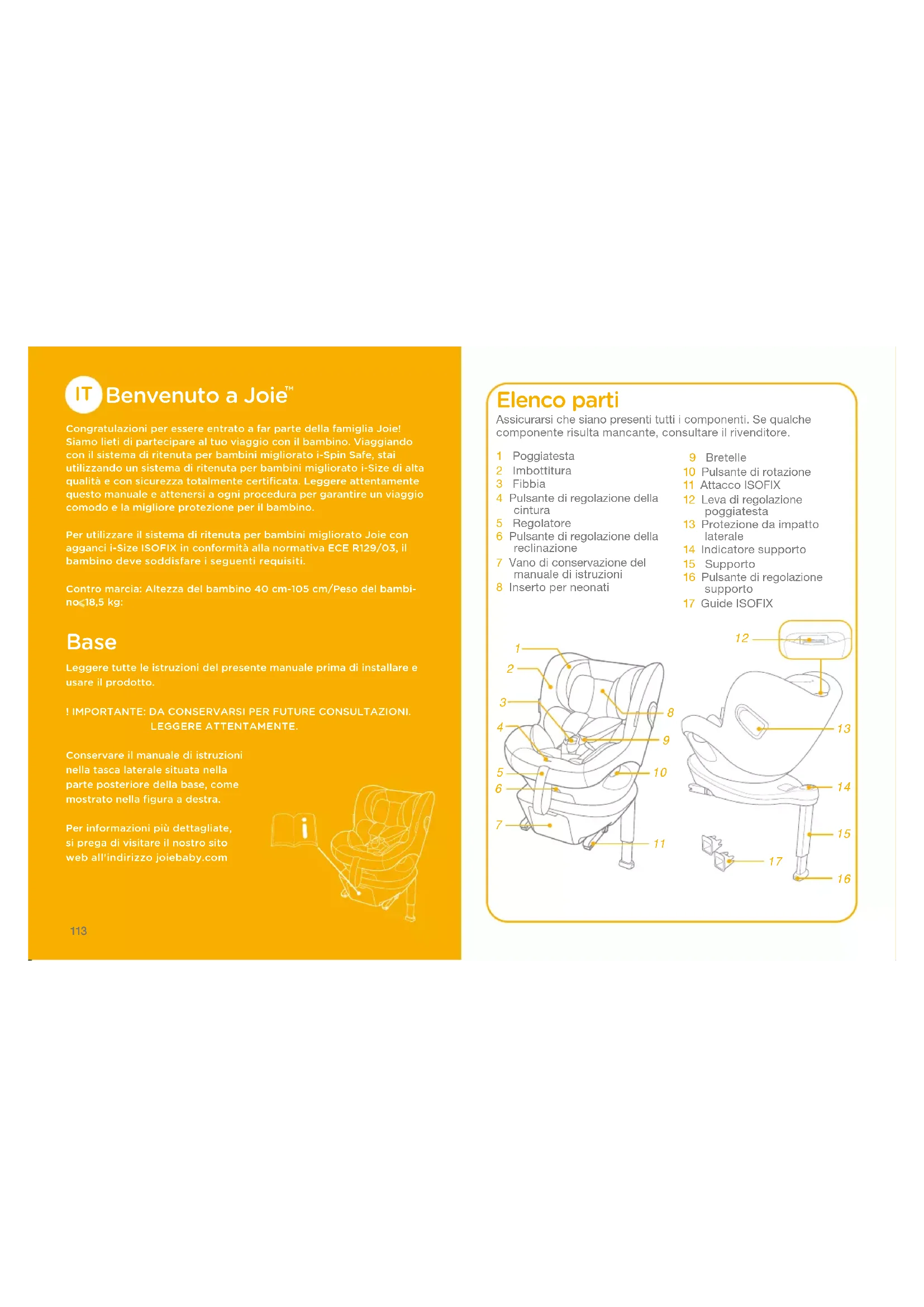 Congratulazioni per essere entrato a far parte della famiglia Joie! Siamo lieti di partecipare al tuo viaggio con il bambino. Viaggiando con il sistema di ritenuta per bambini migliorato i-Spin Safe, stai utilizzando un sistema di ritenuta per bambini migliorato i-Size di alta qualità e con sicurezza totalmente certificata. Leggere attentamente questo manuale e attenersi a ogni procedura per garantire un viaggio comodo e la migliore protezione per il bambino.Per utilizzare il sistema di ritenuta per bambini migliorato Joie con agganci i-Size ISOFIX in conformità alla normativa ECE R129/03, il bambino deve soddisfare i seguenti requisiti.Contro marcia: Altezza del bambino 40 cm-105 cm/Peso del bambi- 18,5 kg: Base Leggere tutte le istruzioni del presente manuale prima di installare e usare il prodotto.! IMPORTANTE: DA CONSERVARSI PER FUTURE CONSULTAZIONI.LEGGERE ATTENTAMENTE.Conservare il manuale di istruzioni nella tasca laterale situata nella parte posteriore della base, come mostrato nella figura a destra.Per informazioni più dettagliate, si prega di visitare il nostro sito web all'indirizzo joiebaby.com Elenco parti 1 Poggiatesta2 Imbottitura3 Fibbia4 Pulsante di regolazione della cintura5 Regolatore6 Pulsante di regolazione della reclinazione7 Vano di conservazione del manuale di istruzioni8 Inserto per neonati 9 Bretelle10 Pulsante di rotazione11 Attacco ISOFIX12 Leva di regolazione poggiatesta13 Protezione da impatto laterale14 Indicatore supporto15 Supporto16 Pulsante di regolazione supporto17 Guide ISOFIXAssicurarsi che siano presenti tutti i componenti. Se qualche componente risulta mancante, consultare il rivenditore.