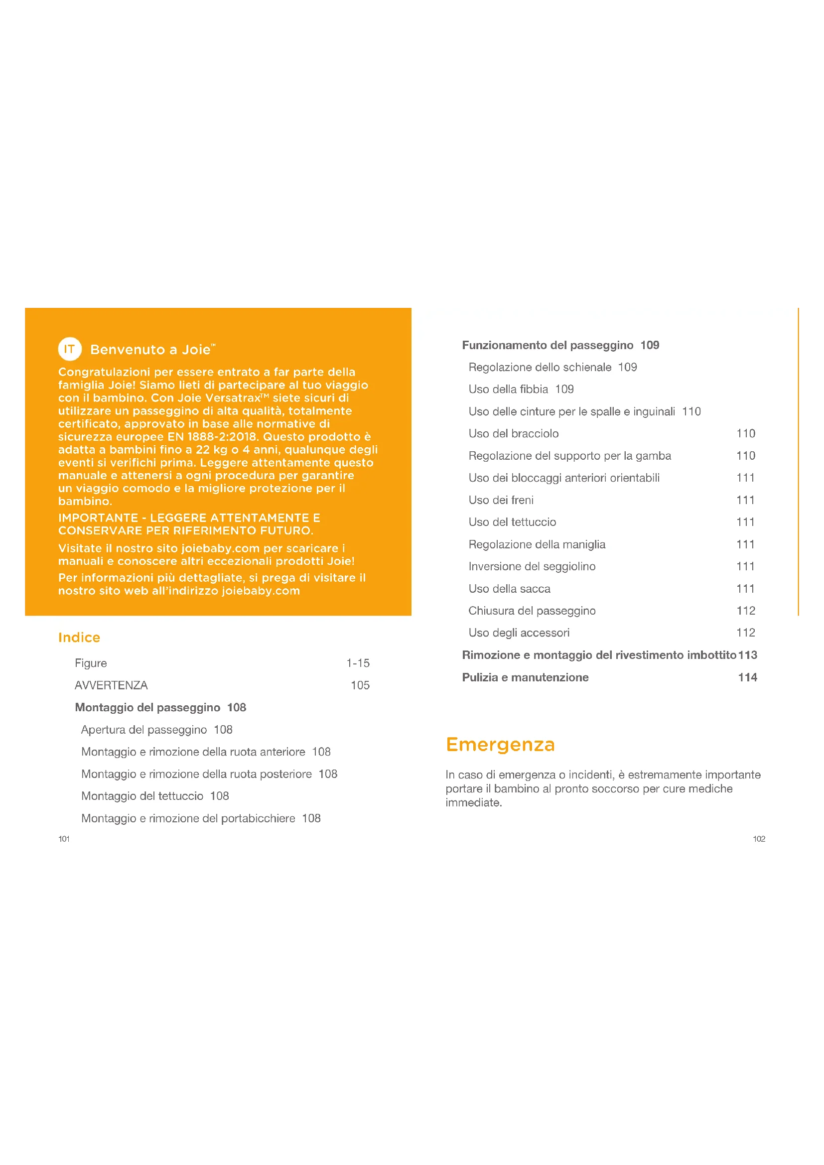 CONSERVARE PER RIFERIMENTO FUTURO. Visitate il nostro sito joiebaby.com per scaricare i manuali e conoscere altri eccezionali prodotti Joie! Per informazioni più dettagliate, si prega di visitare il nostro sito web all’indirizzo joiebaby.com Indice Figure 1-15 AVVERTENZA 105 Montaggio del passeggino 108 Apertura del passeggino 108 Montaggio e rimozione della ruota anteriore 108 Montaggio e rimozione della ruota posteriore 108 Montaggio del tettuccio 108 Montaggio e rimozione del portabicchiere 108 Funzionamento del passeggino 109 Regolazione dello schienale 109 Uso della fibbia 109 Uso delle cinture per le spalle e inguinali 110 Uso del bracciolo 110 Regolazione del supporto per la gamba 110 Uso dei bloccaggi anteriori orientabili 111 Uso dei freni 111 Uso del tettuccio 111 Regolazione della maniglia 111 Inversione del seggiolino 111 Uso della sacca 111 Chiusura del passeggino 112 Uso degli accessori 112 Rimozione e montaggio del rivestimento imbottito 113 Pulizia e manutenzione 114 Emergenza In caso di emergenza o incidenti, è estremamente importante portare il bambino al pronto soccorso per cure mediche immediate.103