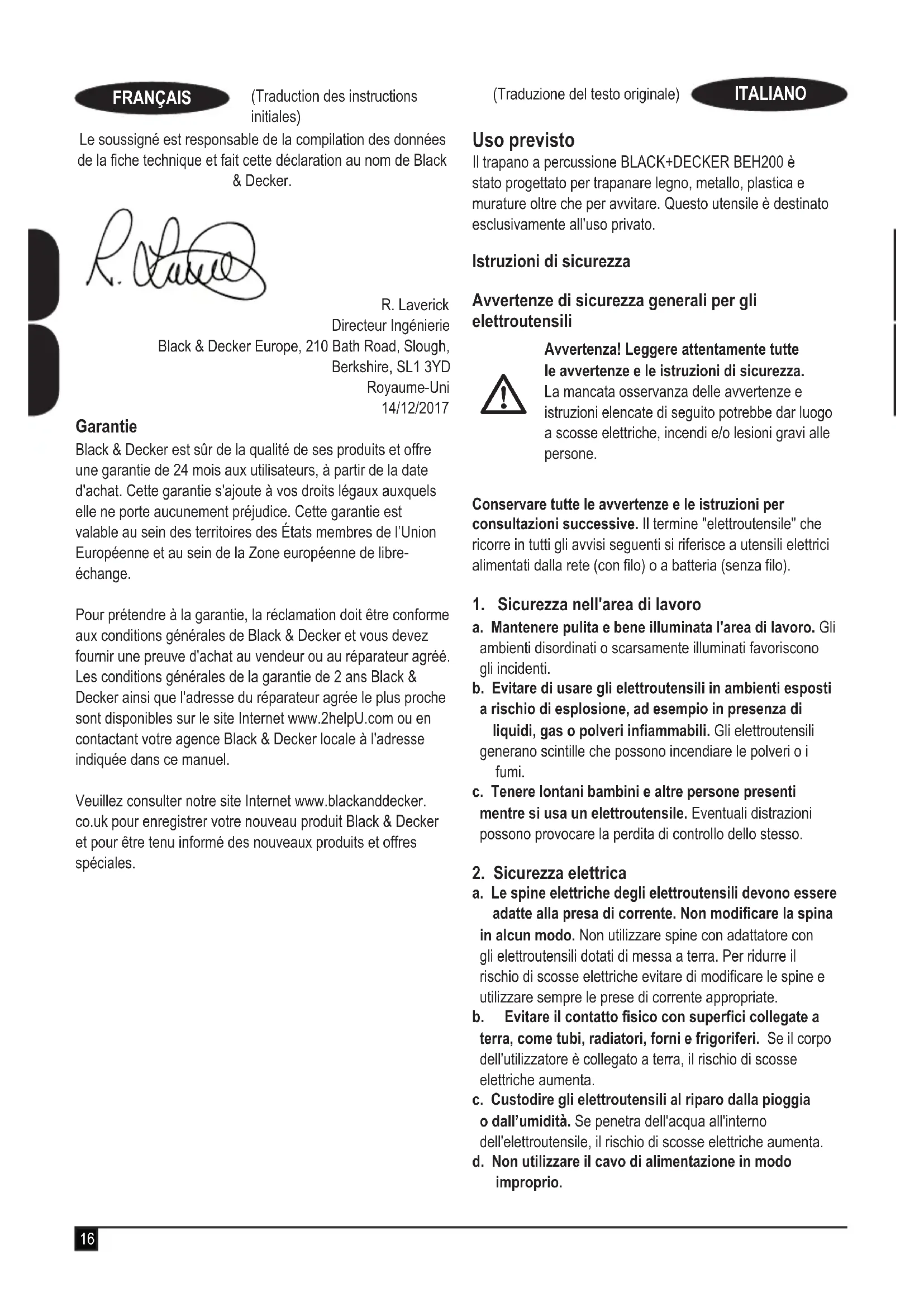 Dichiarazione di conformità CE DIRETTIVA MACCHINE BEH200 Trapano a percussione Black&Decker dichiara che i prodotti descritti al paragrafo "Dati tecnici" sono conformi alle seguenti normative: EN60745-1:2009+A11:2010, EN60745-2-1:2010. Questi prodotti sono conformi alle Direttive 2014/30/UE, 2006/42/CE e 2011/65/UE. Per ulteriori informazioni contattare Black & Decker al seguente indirizzo oppure consultare l'ultima di copertina del manuale.21 (Traduzione del testo originale) ITALIANO (Vertaling van de originele instructies) NEDERLANDS Il sottoscritto è responsabile della redazione del presente documento tecnico ed effettua questa dichiarazione per conto di Black & Decker. R. Laverick Direttore tecnico Black&Decker Europe, 210 Bath Road, Slough, Berkshire, SL1 3YD Regno Unito 14/12/2017 Garanzia Black & Decker è certa della qualità dei propri prodotti e offre ai consumatori una garanzia di 24 mesi dalla data di acquisto. Il presente certicato di garanzia è complementare ai diritti legali e non li pregiudica in alcun modo. La garanzia è valida nei territori degli Stati membri dell'Unione Europea o dell'EFTA (Associazione europea di libero scambio). Per attivare la garanzia, il reclamo deve essere effettuato in accordo con i Termini e Condizioni Black & Decker e sarà necessario presentare la prova di acquisto al venditore o all'agente di riparazione autorizzato. I Termini e condizioni della garanzia Black & Decker di 2 anni e la sede dell'agente di riparazione autorizzato più vicino sono consultabili su Internet all'indirizzo www.2helpU.com oppure è possibile contattare l'ufcio Black & Decker di zona all'indirizzo indicato in questo manuale. Visitare il nostro sito www.blackanddecker.it per registrare il prodotto Black & Decker appena acquistato e ricevere gli aggiornamenti su nuovi prodotti e offerte speciali. Bedoeld gebruik De BLACK+DECKER BEH200-slagboormachine is ontworpen voor het boren in hout, metaal, kunststof en metselwerk, maar kan ook worden gebruikt als schroevendraaier. Dit gereedschap is uitsluitend bestemd voor consumentengebruik. Veiligheidsinstructies Algemene veiligheidswaarschuwingen voor elektrisch gereedschap