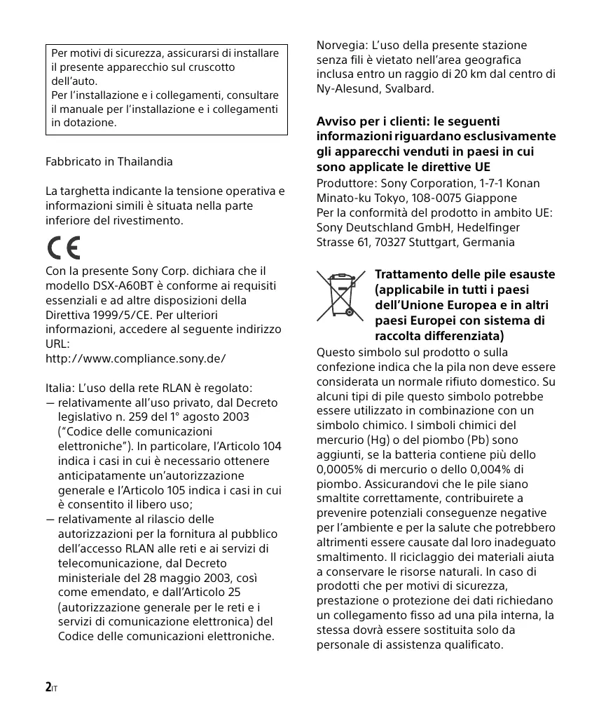 - La funzione di controllo passeggero non è disponibile per iPod nano (1ª generazione). “Made for iPod” e “Made for iPhone” significano che un accessorio elettronico è stato appositamente progettato per il collegamento all’iPod o all’iPhone, rispettivamente, ed è stato certificato dallo sviluppatore per la conformità agli standard Apple. Apple non può essere ritenuta responsabile del funzionamento del presente dispositivo o della relativa conformità agli standard di sicurezza e normativi. Nota: l’utilizzo di questo accessorio con l’iPod o l’iPhone potrebbe influire sulle prestazioni wireless. Informazioni sulla tecnologia BLUETOOTH Cos’è la tecnologia BLUETOOTH? La tecnologia wireless BLUETOOTH è una tecnologia senza fili a breve raggio che consente la comunicazione di dati senza fili tra dispositivi digitali quali un telefono cellulare e un auricolare. La tecnologia wireless BLUETOOTH funziona entro un raggio di circa 10 m. Di solito vengono collegati due dispositivi, sebbene alcuni apparecchi supportino il collegamento di più dispositivi contemporaneamente. Trattandosi di una tecnologia wireless, con la tecnologia BLUETOOTH non occorre utilizzare cavi, né disporre i dispositivi uno di fronte all’altro come con la tecnologia a infrarossi. Ad esempio, è possibile utilizzare questo tipo di dispositivi in una borsa o in una tasca. La tecnologia BLUETOOTH è uno standard internazionale supportato da milioni di aziende che la impiegano in tutto il mondo. Informazioni sulla comunicazione BLUETOOTH La tecnologia wireless BLUETOOTH funziona entro un raggio di circa 10 m. La distanza massima di comunicazione potrebbe variare in base alla presenza di ostacoli (elementi metallici, pareti, persone e così via) o di campi elettromagnetici. Nei casi riportati di seguito, è possibile che la sensibilità di comunicazione della tecnologia BLUETOOTH venga alterata. Tra il presente apparecchio e il dispositivo BLUETOOTH sono presenti ostacoli quali elementi metallici, pareti o persone. 25IT In prossimità del presente apparecchio è in uso un dispositivo che impiega frequenze a 2,4 GHz, ad esempio un dispositivo LAN wireless, un telefono cordless o un forno a microonde. I dispositivi BLUETOOTH e le reti LAN wireless (IEEE802.11b/g) impiegano le stesse frequenze, pertanto, se utilizzati entro brevi distanze, si potrebbero verificare interferenze a microonde che causerebbero alterazioni della velocità di comunicazione, disturbi o connessioni errate. In tal caso, effettuare quanto riportato di seguito. Utilizzare il presente apparecchio ad una distanza minima di 10 m dal dispositivo LAN wireless. Se il presente apparecchio viene utilizzato entro un raggio di 10 m da un dispositivo LAN wireless, spegnere quest’ultimo. Installare il presente apparecchio e il dispositivo BLUETOOTH il più vicino possibile l’uno all’altro. Le microonde trasmesse da un dispositivo BLUETOOTH potrebbero influire sul funzionamento di apparecchiature mediche elettroniche. Disattivare il presente apparecchio e altri dispositivi BLUETOOTH nei seguenti luoghi, onde evitare di causare incidenti. in presenza di gas infiammabili, all’interno di ospedali, treni, aerei o stazioni di rifornimento in prossimità di porte automatiche o allarmi antincendio Sebbene il presente apparecchio supporti funzioni di protezione conformi allo standard BLUETOOTH per garantire la connessione sicura durante l’uso della tecnologia wireless BLUETOOTH, a seconda dell’impostazione la protezione potrebbe risultare insufficiente. Per questo motivo, 26IT prestare attenzione durante le comunicazioni mediante la tecnologia wireless BLUETOOTH. Sony non potrà essere ritenuta responsabile in caso di eventuali fughe di informazioni durante le comunicazioni BLUETOOTH. Non è possibile garantire la connessione con tutti i dispositivi BLUETOOTH. Per la conformità con lo standard BLUETOOTH specificato da BLUETOOTH SIG e per l’autenticazione, occorre disporre di un dispositivo dotato della funzione BLUETOOTH. Anche se il dispositivo connesso è conforme con lo standard BLUETOOTH di cui sopra, potrebbe non essere possibile connettere alcuni dispositivi oppure alcuni di essi potrebbero non funzionare correttamente in base alle relative funzioni o specifiche. Durante le conversazioni telefoniche mediante la funzione vivavoce, a seconda del dispositivo o dell’ambiente di comunicazione, si potrebbero verificare disturbi. A seconda del dispositivo da connettere, l’avvio della comunicazione potrebbe richiedere tempo. Altro A seconda delle condizioni delle onde radio e del luogo in cui l’apparecchio viene utilizzato, potrebbe non essere possibile utilizzare il dispositivo BLUETOOTH con i telefoni cellulari. Se in seguito all’uso del dispositivo BLUETOOTH si avvertono dei fastidi, interrompere immediatamente l’uso. Se il problema persiste, rivolgersi ad un rivenditore Sony. Per eventuali domande o problemi riguardanti l’apparecchio non trattati nel presente manuale, rivolgersi al più vicino rivenditore Sony. Manutenzione Pulizia dei connettori Se i connettori tra l’apparecchio e il pannello anteriore sono sporchi, l’apparecchio potrebbe non funzionare correttamente. Per evitare questo problema, rimuovere il pannello anteriore, (pagina 8), quindi pulire i connettori con un cotton fioc. Non esercitare forza eccessiva. Diversamente, i connettori potrebbero venire danneggiati. Sostituzione della batteria al litio del telecomando Quando la pila si scarica, il raggio d’azione del telecomando risulta ridotto. Sostituire la pila con una batteria al litio CR2025 nuova. L’uso di pile diverse potrebbe comportare il rischio di incendi o esplosioni. Lato + verso l’alto Note Per motivi di sicurezza, spegnere il motore prima di pulire i connettori e rimuovere la chiave dal blocchetto di accensione. Non toccare mai direttamente i connettori con le dita o con oggetti di metallo. Note sulla batteria al litio Tenere la batteria a