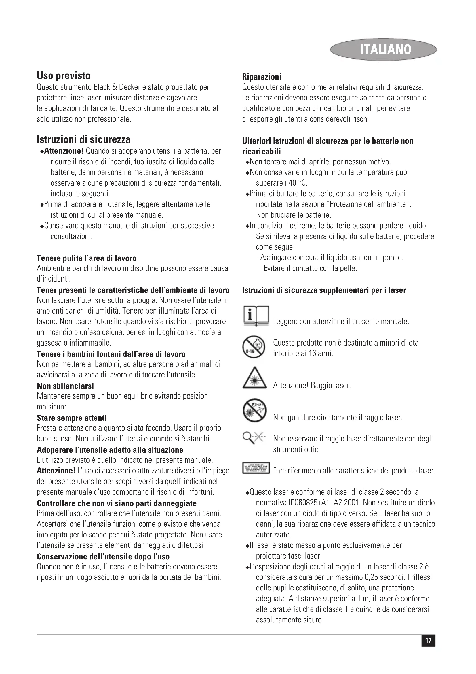 Kevin Hewitt Directeur du Développement Spennymoor, County Durham DL16 6JG, Royaume-Uni 1-2-2006 Garantie Black & Decker est confiant dans la qualité de ses produits et vous offre une garantie très étendue. Ce certificat de garantie est un document supplémentaire et ne peut en aucun cas se substituer à vos droits légaux. La garantie est valable sur tout le territoire des Etats Membres de l’Union Européenne et de la Zone de Libre Echange Européenne. Si un produit Black & Decker s’avère défectueux en raison de matériaux en mauvaises conditions, d’une erreur humaine, ou d’un manque de conformité dans les 24 mois suivant la date d’achat, Black & Decker garantit le remplacement des pièces défectueuses, la réparation des produits usés ou cassés ou remplace ces produits à la convenance du client, sauf dans les circonstances suivantes : ◆ Le produit a été utilisé dans un but commercial, professionnel, ou a été loué. ◆ Le produit a été mal utilisé ou avec négligence. ◆ Le produit a subi des dommages à cause d’objets étrangers, de substances ou à cause d’accidents. ◆ Des réparations ont été tentées par des techniciens ne faisant pas partie du service technique de Black & Decker. Pour avoir recours à la garantie, il est nécessaire de fournir une preuve d’achat au vendeur ou à un réparateur agréé. Pour connaître l’adresse du réparateur agréé le plus proche de chez vous, contactez le bureau Black & Decker à l’adresse indiquée dans ce manuel. Vous pourrez aussi trouver une liste des réparateurs agréés de Black & Decker et de plus amples détails sur notre service après-vente sur le site Internet à l’adresse suivante : www.2helpU.com Visitez notre site Web www.blackanddecker.fr pour enregistrer votre nouveau produit Black & Decker et être informé des nouveaux produits et des offres spéciales. Pour plus d’informations concernant la marque Black & Decker et notre gamme de produits, consultez notre site www.blackanddecker.fr17 ITALIANO Uso previsto Questo strumento Black & Decker è stato progettato per proiettare linee laser, misurare distanze e agevolare le applicazioni di fai da te. Questo strumento è destinato al solo utilizzo non professionale. Istruzioni di sicurezza ◆ Attenzione! Quando si adoperano utensili a batteria, per ridurre il rischio di incendi, fuoriuscita di liquido dalle batterie, danni personali e materiali, è necessario osservare alcune precauzioni di sicurezza fondamentali, incluso le seguenti. ◆ Prima di adoperare l’utensile, leggere attentamente le istruzioni di cui al presente manuale. ◆ Conservare questo manuale di istruzioni per successive consultazioni. Tenere pulita l’area di lavoro Ambienti e banchi di lavoro in disordine possono essere causa d’incidenti. Tener presenti le caratteristiche dell’ambiente di lavoro Non lasciare l’utensile sotto la pioggia. Non usare l’utensile in ambienti carichi di umidità. Tenere ben illuminata l’area di lavoro. Non usare l’utensile quando vi sia rischio di provocare un incendio o un’esplosione, per es. in luoghi con atmosfera gassosa o infiammabile. Tenere i bambini lontani dall’area di lavoro Non permettere ai bambini, ad altre persone o ad animali di avvicinarsi alla zona di lavoro o di toccare l’utensile. Non sbilanciarsi Mantenere sempre un buon equilibrio evitando posizioni malsicure. Stare sempre attenti Prestare attenzione a quanto si sta facendo. Usare il proprio buon senso. Non utilizzare l’utensile quando si è stanchi. Adoperare l’utensile adatto alla situazione L’utilizzo previsto è quello indicato nel presente manuale. Attenzione! L’uso di accessori o attrezzature diversi o l’impiego del presente utensile per scopi diversi da quelli indicati nel presente manuale d’uso comportano il rischio di infortuni. Controllare che non vi siano parti danneggiate Prima dell’uso, controllare che l’utensile non presenti danni. Accertarsi che l’utensile funzioni come previsto e che venga impiegato per lo scopo per cui è stato progettato. Non usate l’utensile se presenta elementi danneggiati o difettosi. Conservazione dell’utensile dopo l’uso Quando non è in uso, l’utensile e le batterie devono essere riposti in un luogo asciutto e fuori dalla portata dei bambini. Riparazioni Questo utensile è conforme ai relativi requisiti di sicurezza. Le riparazioni devono essere eseguite soltanto da personale qualificato e con pezzi di ricambio originali, per evitare di esporre gli utenti a considerevoli rischi. Ulteriori istruzioni di sicurezza per le batterie non ricaricabili ◆ Non tentare mai di aprirle, per nessun motivo. ◆ Non conservarle in luoghi in cui la temperatura può superare i 40 °C. ◆ Prima di buttare le batterie, consultare le istruzioni riportate nella sezione “Protezione dell’ambiente”. Non bruciare le batterie. ◆ In condizioni estreme, le batterie possono perdere liquido. Se si rileva la presenza di liquido sulle batterie, procedere come segue: - Asciugare con cura il liquido usando un panno. Evitare il contatto con la pelle. Istruzioni di sicurezza supplementari per i laser Leggere con attenzione il presente manuale. Questo prodotto non è destinato a minori di età inferiore ai 16 anni. Attenzione! Raggio laser. Non guardare direttamente il raggio laser. Non osservare il raggio laser direttamente con degli strumenti ottici. Fare riferimento alle caratteristiche del prodotto laser. ◆ Questo laser è conforme ai laser di classe 2 secondo la normativa IEC60825+A1+A2:2001. Non sostituire un diodo di laser con un diodo di tipo diverso. Se il laser ha subito danni, la sua riparazione deve essere affidata a un tecnico autorizzato. ◆ Il laser è stato messo a punto esclusivamente per proiettare fasci laser. ◆ L’esposizione degli occhi al raggio di un laser di classe 2 è considerata sicura per un massimo 0,25 secondi. I riflessi delle pupille costituiscono, di solito, una protez