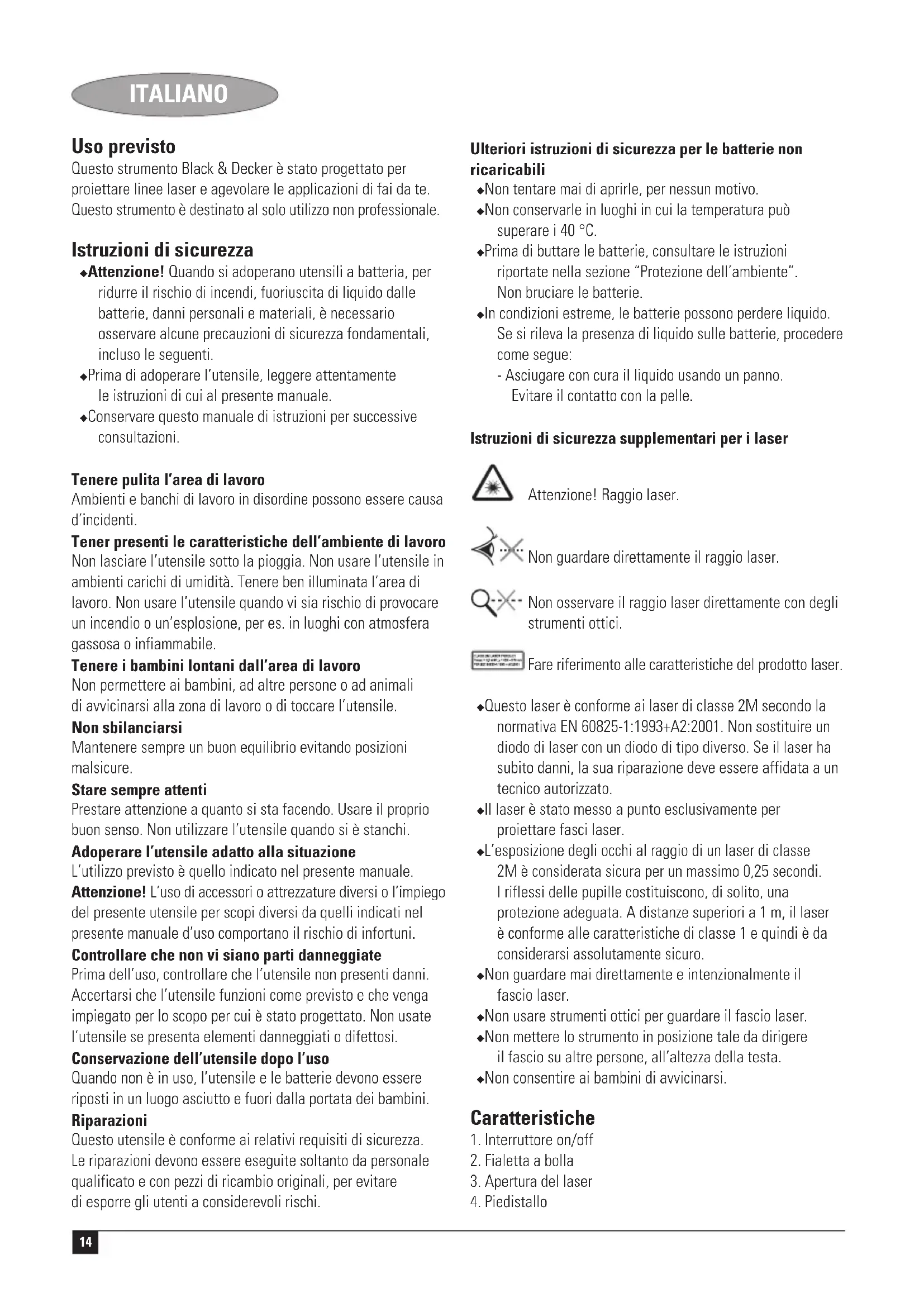Kevin Hewitt Directeur du Développement Spennymoor, County Durham DL16 6JG, Royaume-Uni 1-12-2004 Garantie Black & Decker est confiant dans la qualité de ses produits et vous offre une garantie très étendue. Ce certificat de garantie est un document supplémentaire et ne peut en aucun cas se substituer à vos droits légaux. La garantie est valable sur tout le territoire des Etats Membres de l’Union Européenne et de la Zone de Libre Echange Européenne. Si un produit Black & Decker s’avère défectueux en raison de matériaux en mauvaises conditions, d’une erreur humaine, ou d’un manque de conformité dans les 24 mois suivant la date d’achat, Black & Decker garantit le remplacement des pièces défectueuses, la réparation des produits usés ou cassés ou remplace ces produits à la convenance du client, sauf dans les circonstances suivantes : ◆ Le produit a été utilisé dans un but commercial, professionnel, ou a été loué. ◆ Le produit a été mal utilisé ou avec négligence. ◆ Le produit a subi des dommages à cause d’objets étrangers, de substances ou à cause d’accidents. ◆ Des réparations ont été tentées par des techniciens ne faisant pas partie du service technique de Black & Decker. Pour avoir recours à la garantie, il est nécessaire de fournir une preuve d’achat au vendeur ou à un réparateur agréé. Pour connaître l’adresse du réparateur agréé le plus proche de chez vous, contactez le bureau Black & Decker à l’adresse indiquée dans ce manuel. Vous pourrez aussi trouver une liste des réparateurs agréés de Black & Decker et de plus amples détails sur notre service après-vente sur le site Internet à l’adresse suivante : www.2helpU.com Visitez notre site Web www.blackanddecker.fr pour enregistrer votre nouveau produit Black & Decker et être informé des nouveaux produits et des offres spéciales. Pour plus d’informations concernant la marque Black & Decker et notre gamme de produits, consultez notre site www.blackanddecker.fr14 ITALIANO Uso previsto Questo strumento Black & Decker è stato progettato per proiettare linee laser e agevolare le applicazioni di fai da te. Questo strumento è destinato al solo utilizzo non professionale. Istruzioni di sicurezza ◆ Attenzione! Quando si adoperano utensili a batteria, per ridurre il rischio di incendi, fuoriuscita di liquido dalle batterie, danni personali e materiali, è necessario osservare alcune precauzioni di sicurezza fondamentali, incluso le seguenti. ◆ Prima di adoperare l’utensile, leggere attentamente le istruzioni di cui al presente manuale. ◆ Conservare questo manuale di istruzioni per successive consultazioni. Tenere pulita l’area di lavoro Ambienti e banchi di lavoro in disordine possono essere causa d’incidenti. Tener presenti le caratteristiche dell’ambiente di lavoro Non lasciare l’utensile sotto la pioggia. Non usare l’utensile in ambienti carichi di umidità. Tenere ben illuminata l’area di lavoro. Non usare l’utensile quando vi sia rischio di provocare un incendio o un’esplosione, per es. in luoghi con atmosfera gassosa o infiammabile. Tenere i bambini lontani dall’area di lavoro Non permettere ai bambini, ad altre persone o ad animali di avvicinarsi alla zona di lavoro o di toccare l’utensile. Non sbilanciarsi Mantenere sempre un buon equilibrio evitando posizioni malsicure. Stare sempre attenti Prestare attenzione a quanto si sta facendo. Usare il proprio buon senso. Non utilizzare l’utensile quando si è stanchi. Adoperare l’utensile adatto alla situazione L’utilizzo previsto è quello indicato nel presente manuale. Attenzione! L’uso di accessori o attrezzature diversi o l’impiego del presente utensile per scopi diversi da quelli indicati nel presente manuale d’uso comportano il rischio di infortuni. Controllare che non vi siano parti danneggiate Prima dell’uso, controllare che l’utensile non presenti danni. Accertarsi che l’utensile funzioni come previsto e che venga impiegato per lo scopo per cui è stato progettato. Non usate l’utensile se presenta elementi danneggiati o difettosi. Conservazione dell’utensile dopo l’uso Quando non è in uso, l’utensile e le batterie devono essere riposti in un luogo asciutto e fuori dalla portata dei bambini. Riparazioni Questo utensile è conforme ai relativi requisiti di sicurezza. Le riparazioni devono essere eseguite soltanto da personale qualificato e con pezzi di ricambio originali, per evitare di esporre gli utenti a considerevoli rischi. Ulteriori istruzioni di sicurezza per le batterie non ricaricabili ◆ Non tentare mai di aprirle, per nessun motivo. ◆ Non conservarle in luoghi in cui la temperatura può superare i 40 °C. ◆ Prima di buttare le batterie, consultare le istruzioni riportate nella sezione “Protezione dell’ambiente”. Non bruciare le batterie. ◆ In condizioni estreme, le batterie possono perdere liquido. Se si rileva la presenza di liquido sulle batterie, procedere come segue: - Asciugare con cura il liquido usando un panno. Evitare il contatto con la pelle. Istruzioni di sicurezza supplementari per i laser Attenzione! Raggio laser. Non guardare direttamente il raggio laser. Non osservare il raggio laser direttamente con degli strumenti ottici. Fare riferimento alle caratteristiche del prodotto laser. ◆ Questo laser è conforme ai laser di classe 2M secondo la normativa EN 60825-1:1993+A2:2001. Non sostituire un diodo di laser con un diodo di tipo diverso. Se il laser ha subito danni, la sua riparazione deve essere affidata a un tecnico autorizzato. ◆ Il laser è stato messo a punto esclusivamente per proiettare fasci laser. ◆ L’esposizione degli occhi al raggio di un laser di classe 2M è considerata sicura per un massimo 0,25 secondi. I riflessi delle pupille costituiscono, di solito, una protezione adeguata. A distanze superiori a 1 m, il laser è conforme alle caratteristiche di classe 1 e quindi è da considerarsi ass