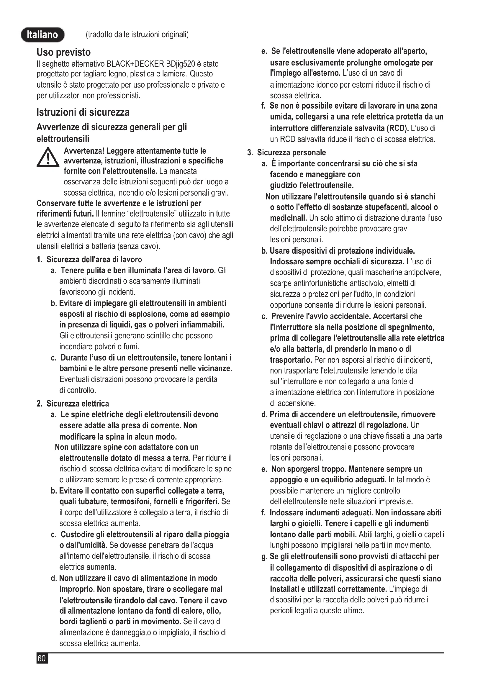 (tradotto dalle istruzioni originali) Italiano (tradotto dalle istruzioni originali) Uso previsto Il seghetto alternativo BLACK+DECKER BDjig520 è stato progettato per tagliare legno, plastica e lamiera. Questo utensile è stato progettato per uso professionale e privato e per utilizzatori non professionisti. Istruzioni di sicurezza Avvertenze di sicurezza generali per gli elettroutensili