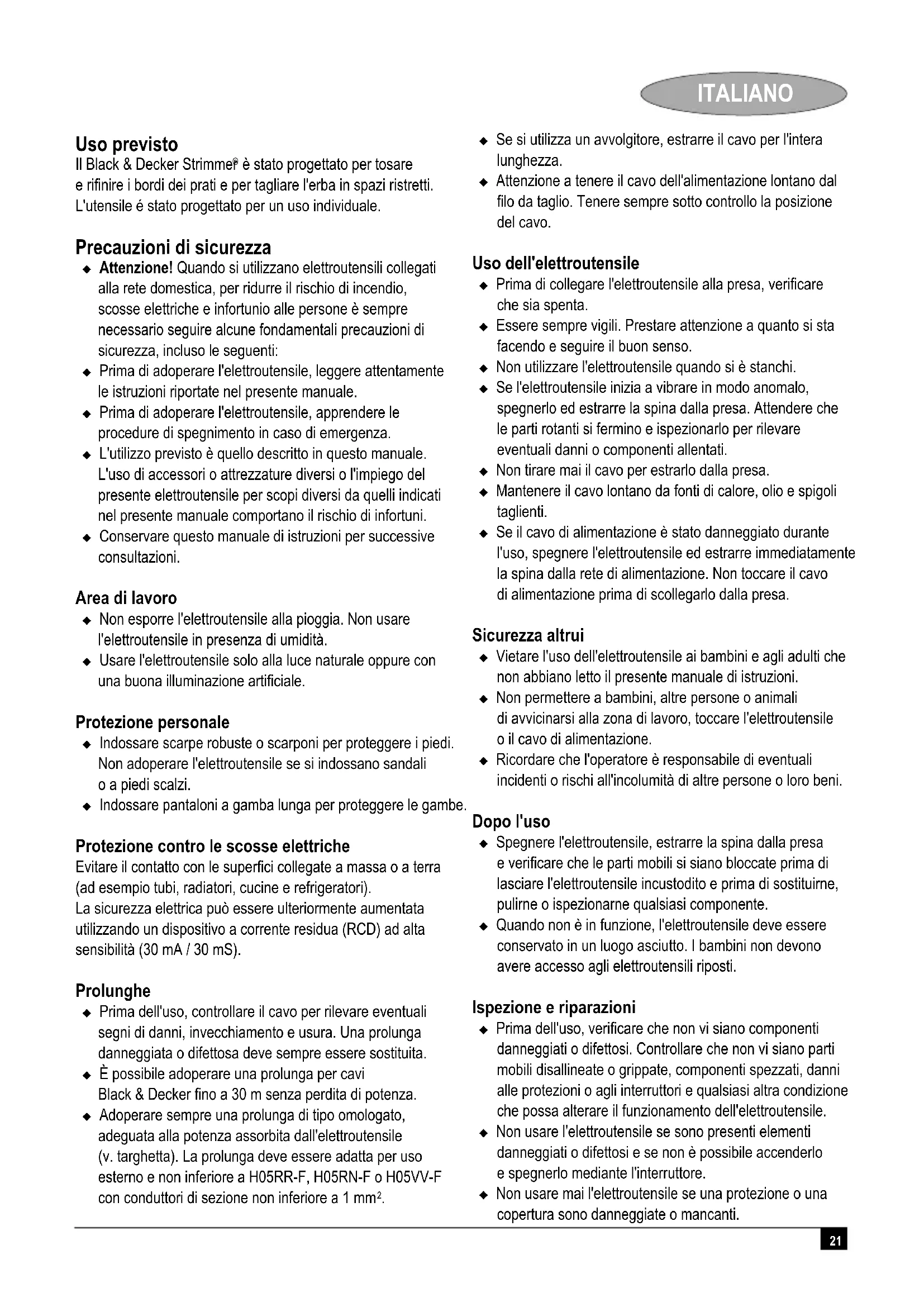 è stato progettato per tosare e rifinire i bordi dei prati e per tagliare l'erba in spazi ristretti. L'utensile é stato progettato per un uso individuale. Precauzioni di sicurezza Attenzione! Quando si utilizzano elettroutensili collegati alla rete domestica, per ridurre il rischio di incendio, scosse elettriche e infortunio alle persone è sempre necessario seguire alcune fondamentali precauzioni di sicurezza, incluso le seguenti: Prima di adoperare l'elettroutensile, leggere attentamente le istruzioni riportate nel presente manuale. Prima di adoperare l'elettroutensile, apprendere le procedure di spegnimento in caso di emergenza. L'utilizzo previsto è quello descritto in questo manuale. L'uso di accessori o attrezzature diversi o l'impiego del presente elettroutensile per scopi diversi da quelli indicati nel presente manuale comportano il rischio di infortuni. Conservare questo manuale di istruzioni per successive consultazioni. Area di lavoro Non esporre l'elettroutensile alla pioggia. Non usare l'elettroutensile in presenza di umidità. Usare l'elettroutensile solo alla luce naturale oppure con una buona illuminazione artificiale. Protezione personale Indossare scarpe robuste o scarponi per proteggere i piedi. Non adoperare l'elettroutensile se si indossano sandali o a piedi scalzi. Indossare pantaloni a gamba lunga per proteggere le gambe. Protezione contro le scosse elettriche Evitare il contatto con le superfici collegate a massa o a terra (ad esempio tubi, radiatori, cucine e refrigeratori). La sicurezza elettrica può essere ulteriormente aumentata utilizzando un dispositivo a corrente residua (RCD) ad alta sensibilità (30 mA / 30 mS). Prolunghe Prima dell'uso, controllare il cavo per rilevare eventuali segni di danni, invecchiamento e usura. Una prolunga danneggiata o difettosa deve sempre essere sostituita. È possibile adoperare una prolunga per cavi Black & Decker fino a 30 m senza perdita di potenza. Adoperare sempre una prolunga di tipo omologato, adeguata alla potenza assorbita dall'elettroutensile (v. targhetta). La prolunga deve essere adatta per uso esterno e non inferiore a H05RR-F, H05RN-F o H05VV-F con conduttori di sezione non inferiore a 1 mm