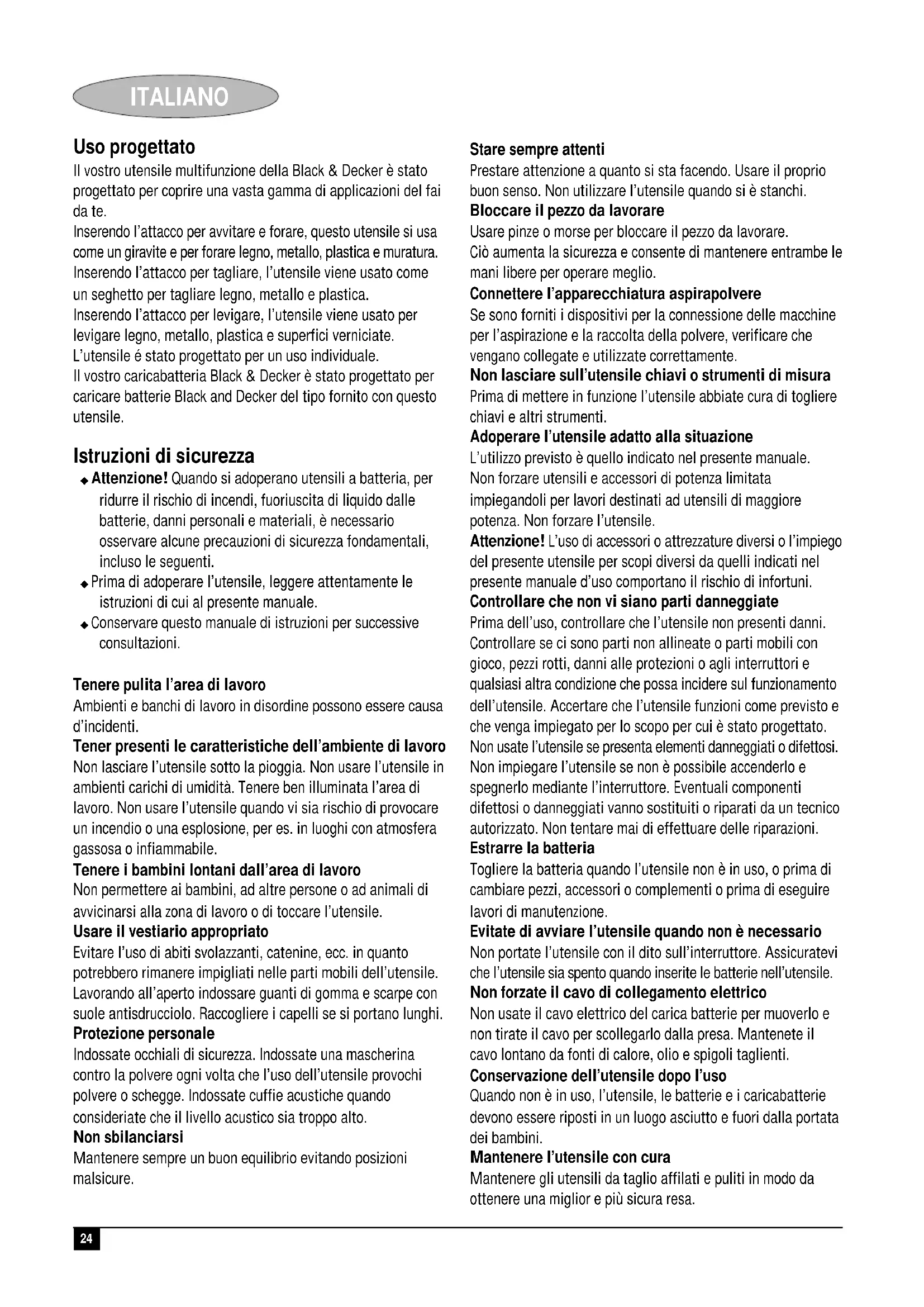 Colin Wills Director of Engineering BDCI, 4/F, 2 Dai Wang Street Tai Po Industrial Estate Tai Po NT, Hong Kong Garantie Black & Decker est confiant dans la qualité de ses produits et vous offre une garantie très étendue. Ce certificat de garantie est un document supplémentaire et ne peut en aucun cas se substituer à vos droits légaux. La garantie est valable sur tout le territoire des Etats Membres de l’Union Européenne et de la Zone de Libre Echange Européenne.23 FRANÇAIS Si un produit Black & Decker s’avère défectueux en raison de matériaux en mauvaises conditions, d’une erreur humaine, ou d’un manque de conformité dans les 24 mois suivant la date d’achat, Black & Decker garantit le remplacement des pièces défectueuses, la réparation des produits usés ou cassés ou remplace ces produits à la convenance du client, sauf dans les circonstances suivantes : ◆ Le produit a été utilisé dans un but commercial, professionnel, ou a été loué. ◆ Le produit a été mal utilisé ou avec négligence. ◆ Le produit a subi des dommages à cause d’objets étrangers, de substances ou à cause d’accidents. ◆ Des réparations ont été tentées par des techniciens ne faisant pas partie du service technique de Black & Decker. Pour avoir recours à la garantie, il est nécessaire de fournir une preuve d’achat au vendeur ou à un réparateur agréé. Pour connaître l’adresse du réparateur agréé le plus proche de chez vous, contactez le bureau Black & Decker à l’adresse indiquée dans ce manuel. Vous pourrez aussi trouver une liste des réparateurs agréés de Black & Decker et de plus amples détails sur notre service après-vente sur le site Internet à l’adresse suivante : www.2helpU.com.24 ITALIANO Uso progettato Il vostro utensile multifunzione della Black & Decker è stato progettato per coprire una vasta gamma di applicazioni del fai da te. Inserendo l’attacco per avvitare e forare, questo utensile si usa come un giravite e per forare legno, metallo, plastica e muratura. Inserendo l’attacco per tagliare, l’utensile viene usato come un seghetto per tagliare legno, metallo e plastica. Inserendo l’attacco per levigare, l’utensile viene usato per levigare legno, metallo, plastica e superfici verniciate. L’utensile é stato progettato per un uso individuale. Il vostro caricabatteria Black & Decker è stato progettato per caricare batterie Black and Decker del tipo fornito con questo utensile. Istruzioni di sicurezza ◆ Attenzione! Quando si adoperano utensili a batteria, per ridurre il rischio di incendi, fuoriuscita di liquido dalle batterie, danni personali e materiali, è necessario osservare alcune precauzioni di sicurezza fondamentali, incluso le seguenti. ◆ Prima di adoperare l’utensile, leggere attentamente le istruzioni di cui al presente manuale. ◆ Conservare questo manuale di istruzioni per successive consultazioni. Tenere pulita l’area di lavoro Ambienti e banchi di lavoro in disordine possono essere causa d’incidenti. Tener presenti le caratteristiche dell’ambiente di lavoro Non lasciare l’utensile sotto la pioggia. Non usare l’utensile in ambienti carichi di umidità. Tenere ben illuminata l’area di lavoro. Non usare l’utensile quando vi sia rischio di provocare un incendio o una esplosione, per es. in luoghi con atmosfera gassosa o infiammabile. Tenere i bambini lontani dall’area di lavoro Non permettere ai bambini, ad altre persone o ad animali di avvicinarsi alla zona di lavoro o di toccare l’utensile. Usare il vestiario appropriato Evitare l’uso di abiti svolazzanti, catenine, ecc. in quanto potrebbero rimanere impigliati nelle parti mobili dell’utensile. Lavorando all’aperto indossare guanti di gomma e scarpe con suole antisdrucciolo. Raccogliere i capelli se si portano lunghi. Protezione personale Indossate occhiali di sicurezza. Indossate una mascherina contro la polvere ogni volta che l’uso dell’utensile provochi polvere o schegge. Indossate cuffie acustiche quando consideriate che il livello acustico sia troppo alto. Non sbilanciarsi Mantenere sempre un buon equilibrio evitando posizioni malsicure. Stare sempre attenti Prestare attenzione a quanto si sta facendo. Usare il proprio buon senso. Non utilizzare l’utensile quando si è stanchi. Bloccare il pezzo da lavorare Usare pinze o morse per bloccare il pezzo da lavorare. Ciò aumenta la sicurezza e consente di mantenere entrambe le mani libere per operare meglio. Connettere l’apparecchiatura aspirapolvere Se sono forniti i dispositivi per la connessione delle macchine per l’aspirazione e la raccolta della polvere, verificare che vengano collegate e utilizzate correttamente. Non lasciare sull’utensile chiavi o strumenti di misura Prima di mettere in funzione l’utensile abbiate cura di togliere chiavi e altri strumenti. Adoperare l’utensile adatto alla situazione L’utilizzo previsto è quello indicato nel presente manuale. Non forzare utensili e accessori di potenza limitata impiegandoli per lavori destinati ad utensili di maggiore potenza. Non forzare l’utensile. Attenzione! L’uso di accessori o attrezzature diversi o l’impiego del presente utensile per scopi diversi da quelli indicati nel presente manuale d’uso comportano il rischio di infortuni. Controllare che non vi siano parti danneggiate Prima dell’uso, controllare che l’utensile non presenti danni. Controllare se ci sono parti non allineate o parti mobili con gioco, pezzi rotti, danni alle protezioni o agli interruttori e qualsiasi altra condizione che possa incidere sul funzionamento dell’utensile. Accertare che l’utensile funzioni come previsto e che venga impiegato per lo scopo per cui è stato progettato. Non usate l’utensile se presenta elementi danneggiati o difettosi. Non impiegare l’utensile se non è possibile accenderlo e spegnerlo mediante l’interruttore. Eventuali componenti difettosi o danneggiati vanno sostituiti o riparati da 