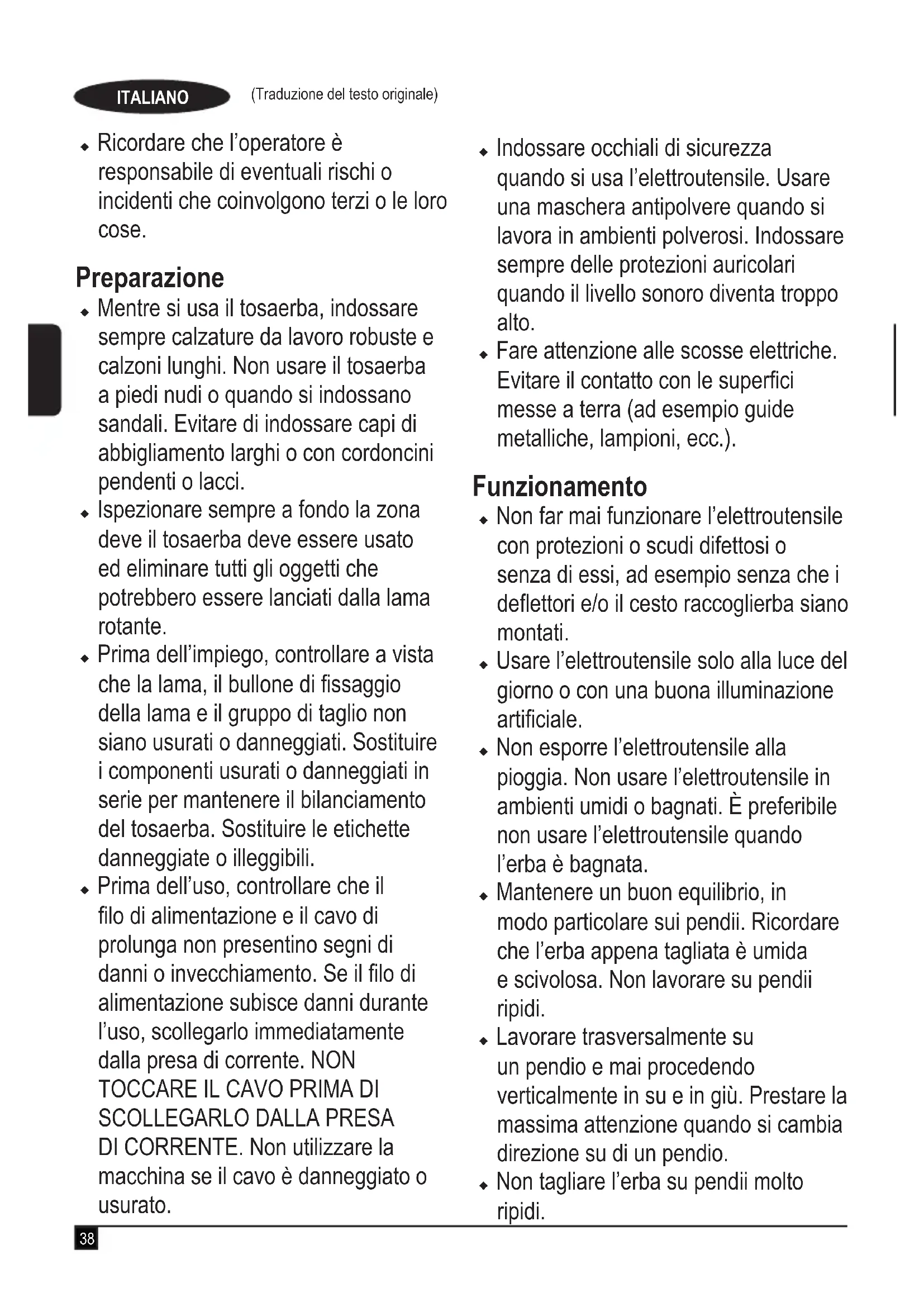 DI CORRENTE. Non utilizzare la macchina se il cavo è danneggiato o usurato. u Indossare occhiali di sicurezza quando si usa l’elettroutensile. Usare una maschera antipolvere quando si lavora in ambienti polverosi. Indossare sempre delle protezioni auricolari quando il livello sonoro diventa troppo alto. u Fare attenzione alle scosse elettriche. Evitare il contatto con le superci messe a terra (ad esempio guide metalliche, lampioni, ecc.). Funzionamento u Non far mai funzionare l’elettroutensile con protezioni o scudi difettosi o senza di essi, ad esempio senza che i deettori e/o il cesto raccoglierba siano montati. u Usare l’elettroutensile solo alla luce del giorno o con una buona illuminazione articiale. u Non esporre l’elettroutensile alla pioggia. Non usare l’elettroutensile in ambienti umidi o bagnati. È preferibile non usare l’elettroutensile quando l’erba è bagnata. u Mantenere un buon equilibrio, in modo particolare sui pendii. Ricordare che l’erba appena tagliata è umida e scivolosa. Non lavorare su pendii ripidi. u Lavorare trasversalmente su un pendio e mai procedendo verticalmente in su e in giù. Prestare la massima attenzione quando si cambia direzione su di un pendio. u Non tagliare l’erba su pendii molto ripidi.39 (Traduzione del testo originale) ITALIANO u Camminare e non correre mai mentre si utilizza l’elettroutensile. Non tirare l’elettroutensile verso di sé e non camminare all’indietro durante l’uso. u Accendere l’elettroutensile seguendo le istruzioni e tenendo i piedi sempre ben lontani dalla lama. u Non far funzionare il tosaerba posizionandosi direttamente davanti all’apertura di scarico. u Non inclinare l’elettroutensile quando lo si accende, ad eccezione di quando deve essere inclinato per l’avviamento. In tali casi, non inclinare l’elettroutensile più di quanto sia assolutamente necessario e sollevare solo la parte lontana dall’operatore. Accertarsi sempre che entrambe le mani siano nella posizione operativa prima di riportare a terra l’elettroutensile. u Spegnere l’elettroutensile e lasciare che la lama si fermi se è necessario inclinare l’elettroutensile per trasportarlo quando si attraversano superci non erbose e quando lo si sposta da una zona da tagliare all’altra. u Non sollevare né trasportare l’elettroutensile no a quando la lama non si è arrestata completamente. u Tenere sempre piedi e mani ben lontani dalla lama. u Non inlare mani o piedi vicino o sotto alle parti in movimento. u Tenersi sempre lontani dalle aperture di scarico. u Spegnere l’elettroutensile, scollegare la spina dalla presa di corrente e accertarsi che le parti in movimento siano ferme prima di lasciarlo incustodito e prima di cambiare, pulire o ispezionare qualsiasi parte o di eliminare un’ostruzione. Dopo aver colpito un oggetto estraneo. Vericare che il tosaerba non sia danneggiato ed effettuare le riparazioni richieste prima di riaccenderlo e di usarlo; u Se l’elettroutensile comincia a vibrare in modo anomalo o se si colpisce un oggetto estraneo, spegnerlo e scollegare la spina dalla presa di corrente. Controllare se l’elettroutensile presenta danni, sostituire o riparare le parti danneggiate, vericare che non vi siano parti allentate ed eventualmente serrarle. u Prestare attenzione a tenere sempre lontano il cavo di alimentazione dalla lama. Essere sempre consapevoli di dove si trova il cavo di alimentazione. u Il motore continua a funzionare per alcuni secondi dopo lo spegnimento dell’elettroutensile. Non tentare mai di fermare a forza la lama. Manutenzione e conservazione u Prima dell’uso, controllare che l’elettroutensile non sia danneggiato e non presenti parti difettose.40 (Traduzione del testo originale) ITALIANO Controllare che le parti in movimento non siano allineate male, inceppate o rotte, che protezioni e interruttori non siano danneggiati e che non sussistano altre condizioni che potrebbero compromettere il funzionamento. Accertarsi che l’elettroutensile funzioni correttamente ed esegua il proprio lavoro. Non usare mai l’elettroutensile se le protezioni o la scocca sono danneggiate o non sono montate. Non usare l’elettroutensile se alcune parti sono danneggiate o difettose. Non usare l’elettroutensile se l’interruttore di accensione non funziona correttamente. Far riparare o sostituire le parti danneggiate o difettose da un tecnico autorizzato. u Controllare di frequente che il cavo non sia danneggiato. Se il cavo è danneggiato, farlo sostituire da un tecnico autorizzato per evitare pericoli. Ispezionare periodicamente le prolunghe. Sostituire immediatamente le prolunghe danneggiate. u Vericare che dadi, bulloni e viti dell’elettroutensile siano sempre ben saldi per garantire delle condizioni di lavoro sicure. u Controllare che il cesto raccoglierba non sia usurato o danneggiato e sostituirlo se necessario. Non usare mai l’elettroutensile senza il cesto raccoglierba montato. u Prestare attenzione durante la regolazione del tosaerba per evitare di schiacciarsi le dita tra le lame in movimento e le parti sse del tosaerba. u Quando si esegue la manutenzione delle lame tenere presente che, anche con l’alimentazione elettrica scollegata, le lame potrebbero comunque ruotare. u Quando non viene usato, l’elettroutensile deve essere conservato in un luogo asciutto. L’elettroutensile non deve essere riposto alla portata dei bambini. u Lasciare che il tosaerba si raffreddi prima di riporlo. u Usare solo lame di ricambio di tipo corretto. u Usare solo ricambi e accessori raccomandati da BLACK+DECKER. Altre precauzioni di sicurezza per i tosaerba u Usare sempre un cavo di prolunga di tipo omologato, idoneo all’assorbimento di corrente di questo elettroutensile (vedere i Dati tecnici). Il cavo di prolunga deve essere idoneo per l’impiego all’esterno e deve essere opportunamente contrassegnato. È possibile usare un cavo di prolunga lungo no a 30 m con diametro di 1,5 mm² HO5VV-F sen