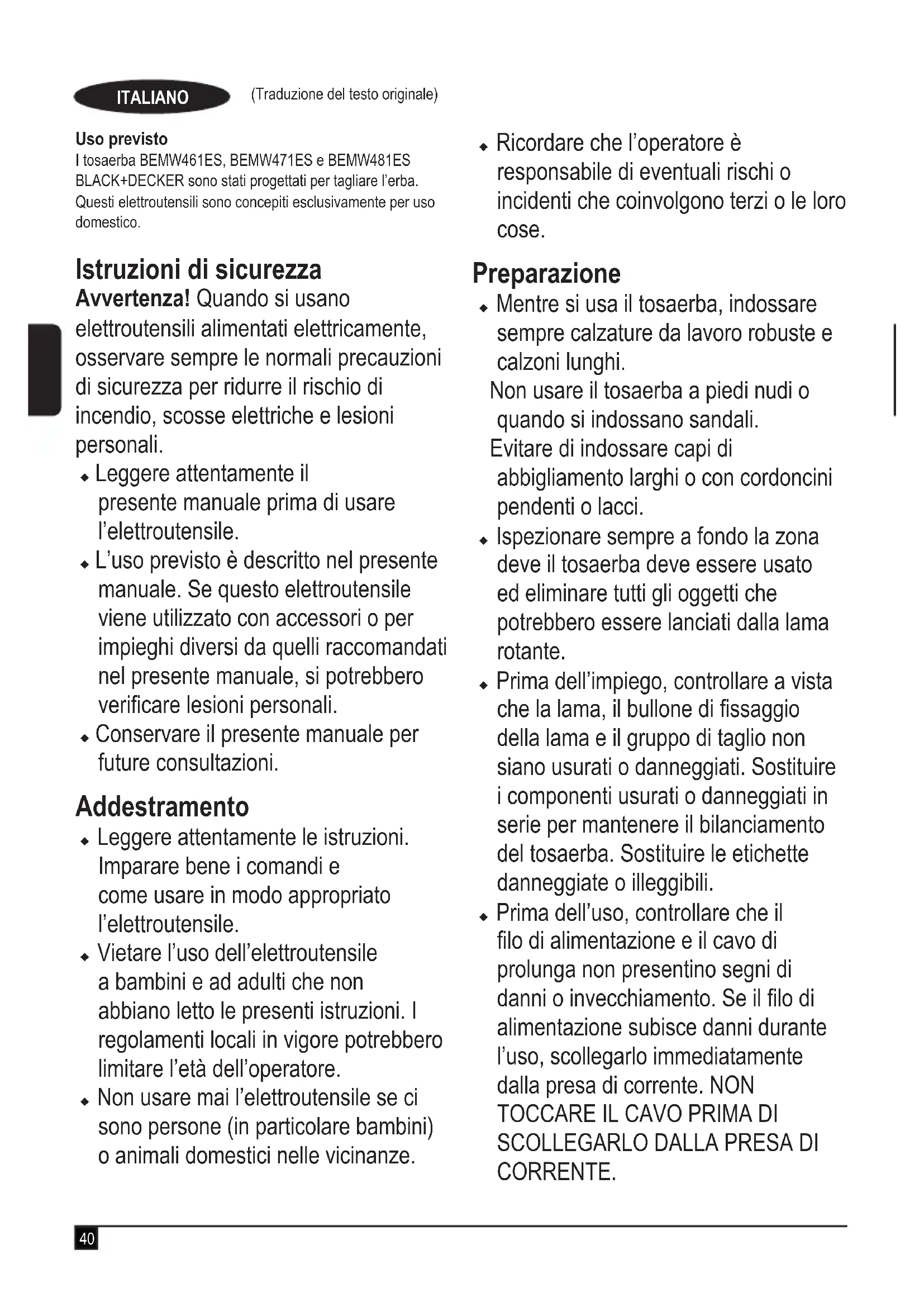 CORRENTE.41 (Traduzione del testo originale) ITALIANO Non utilizzare la macchina se il cavo è danneggiato o usurato. u Indossare occhiali di sicurezza quando si usa l’elettroutensile. Usare una maschera antipolvere quando si lavora in ambienti polverosi. Indossare sempre delle protezioni auricolari quando il livello sonoro diventa troppo alto. u Fare attenzione alle scosse elettriche. Evitare il contatto con le superci messe a terra (ad esempio guide metalliche, lampioni, ecc.). Funzionamento u Non far mai funzionare l’elettroutensile con protezioni o scudi difettosi o senza di essi, ad esempio senza che i deettori e/o il cesto raccoglierba siano montati. u Usare l’elettroutensile solo alla luce del giorno o con una buona illuminazione articiale. u Non esporre l’elettroutensile alla pioggia. Non usare l’elettroutensile in ambienti umidi o bagnati. È preferibile non usare l’elettroutensile quando l’erba è bagnata. u Mantenere un buon equilibrio, in modo particolare sui pendii. Ricordare che l’erba appena tagliata è umida e scivolosa. Non lavorare su pendii ripidi. u Lavorare trasversalmente su un pendio e mai procedendo verticalmente in su e in giù. Prestare la massima attenzione quando si cambia direzione su di un pendio. u Non tagliare l’erba su pendii molto ripidi. u Camminare e non correre mai mentre si utilizza l’elettroutensile. Non tirare l’elettroutensile verso di sé e non camminare all’indietro durante l’uso. u Accendere l’elettroutensile seguendo le istruzioni e tenendo i piedi sempre ben lontani dalla lama. u Non far funzionare il tosaerba posizionandosi direttamente davanti all’apertura di scarico. u Non inclinare l’elettroutensile quando lo si accende, ad eccezione di quando deve essere inclinato per l’avviamento. In tali casi, non inclinare l’elettroutensile più di quanto sia assolutamente necessario e sollevare solo la parte lontana dall’operatore. Accertarsi sempre che entrambe le mani siano nella posizione operativa prima di riportare a terra l’elettroutensile. u Spegnere l’elettroutensile e lasciare che la lama si fermi se è necessario inclinare l’elettroutensile per trasportarlo quando si attraversano superci non erbose e quando lo si sposta da una zona da tagliare all’altra. u Non sollevare né trasportare l’elettroutensile no a quando la lama non si è arrestata completamente. u Tenere sempre piedi e mani ben lontani dalla lama. u Non inlare mani o piedi vicino o sotto alle parti in movimento.42 (Traduzione del testo originale) ITALIANO u Tenersi sempre lontani dalle aperture di scarico. u Spegnere l’elettroutensile, scollegare la spina dalla presa di corrente e accertarsi che le parti in movimento siano ferme prima di lasciarlo incustodito e prima di cambiare, pulire o ispezionare qualsiasi parte o di eliminare un’ostruzione. Dopo aver colpito un oggetto estraneo. Vericare che il tosaerba non sia danneggiato ed effettuare le riparazioni richieste prima di riaccenderlo e di usarlo; u Se l’elettroutensile comincia a vibrare in modo anomalo o se si colpisce un oggetto estraneo, spegnerlo e scollegare la spina dalla presa di corrente. Controllare se l’elettroutensile presenta danni, sostituire o riparare le parti danneggiate, vericare che non vi siano parti allentate ed eventualmente serrarle. u Prestare attenzione a tenere sempre lontano il cavo di alimentazione dalla lama. Essere sempre consapevoli di dove si trova il cavo di alimentazione. u Il motore continua a funzionare per alcuni secondi dopo lo spegnimento dell’elettroutensile. Non tentare mai di fermare a forza la lama. Manutenzione e conservazione u Prima dell’uso, controllare che l’elettroutensile non sia danneggiato e non presenti parti difettose. Controllare che le parti in movimento non siano allineate male, inceppate o rotte, che protezioni e interruttori non siano danneggiati e che non sussistano altre condizioni che potrebbero compromettere il funzionamento. Accertarsi che l’elettroutensile funzioni correttamente ed esegua il proprio lavoro. Non usare mai l’elettroutensile se le protezioni o la scocca sono danneggiate o non sono montate. Non usare l’elettroutensile se alcune parti sono danneggiate o difettose. Non usare l’elettroutensile se l’interruttore di accensione non funziona correttamente. Far riparare o sostituire le parti danneggiate o difettose da un tecnico autorizzato. u Controllare di frequente che il cavo non sia danneggiato. Se il cavo è danneggiato, farlo sostituire da un tecnico autorizzato per evitare pericoli. Ispezionare periodicamente le prolunghe. Sostituire immediatamente le prolunghe danneggiate. u Vericare che dadi, bulloni e viti dell’elettroutensile siano sempre ben saldi per garantire delle condizioni di lavoro sicure. u Controllare che il cesto raccoglierba non sia usurato o danneggiato e sostituirlo se necessario. Non usare mai l’elettroutensile senza il cesto raccoglierba montato.43 (Traduzione del testo originale) ITALIANO u Prestare attenzione durante la regolazione del tosaerba per evitare di schiacciarsi le dita tra le lame in movimento e le parti sse del tosaerba. u Quando si esegue la manutenzione delle lame tenere presente che, anche con l’alimentazione elettrica scollegata, le lame potrebbero comunque ruotare. u Quando non viene usato, l’elettroutensile deve essere conservato in un luogo asciutto. L’elettroutensile non deve essere riposto alla portata dei bambini. u Lasciare che il tosaerba si raffreddi prima di riporlo. u Usare solo lame di ricambio di tipo corretto. u Usare solo ricambi e accessori raccomandati da BLACK+DECKER. Altre precauzioni di sicurezza per i tosaerba u Usare sempre un cavo di prolunga di tipo omologato, idoneo all’assorbimento di corrente di questo elettroutensile (vedere i Dati tecnici). Il cavo di prolunga deve essere idoneo per l’impiego all’esterno e deve essere opportunamente contrassegnato. È possibile usare un cavo di prolunga lungo no a 