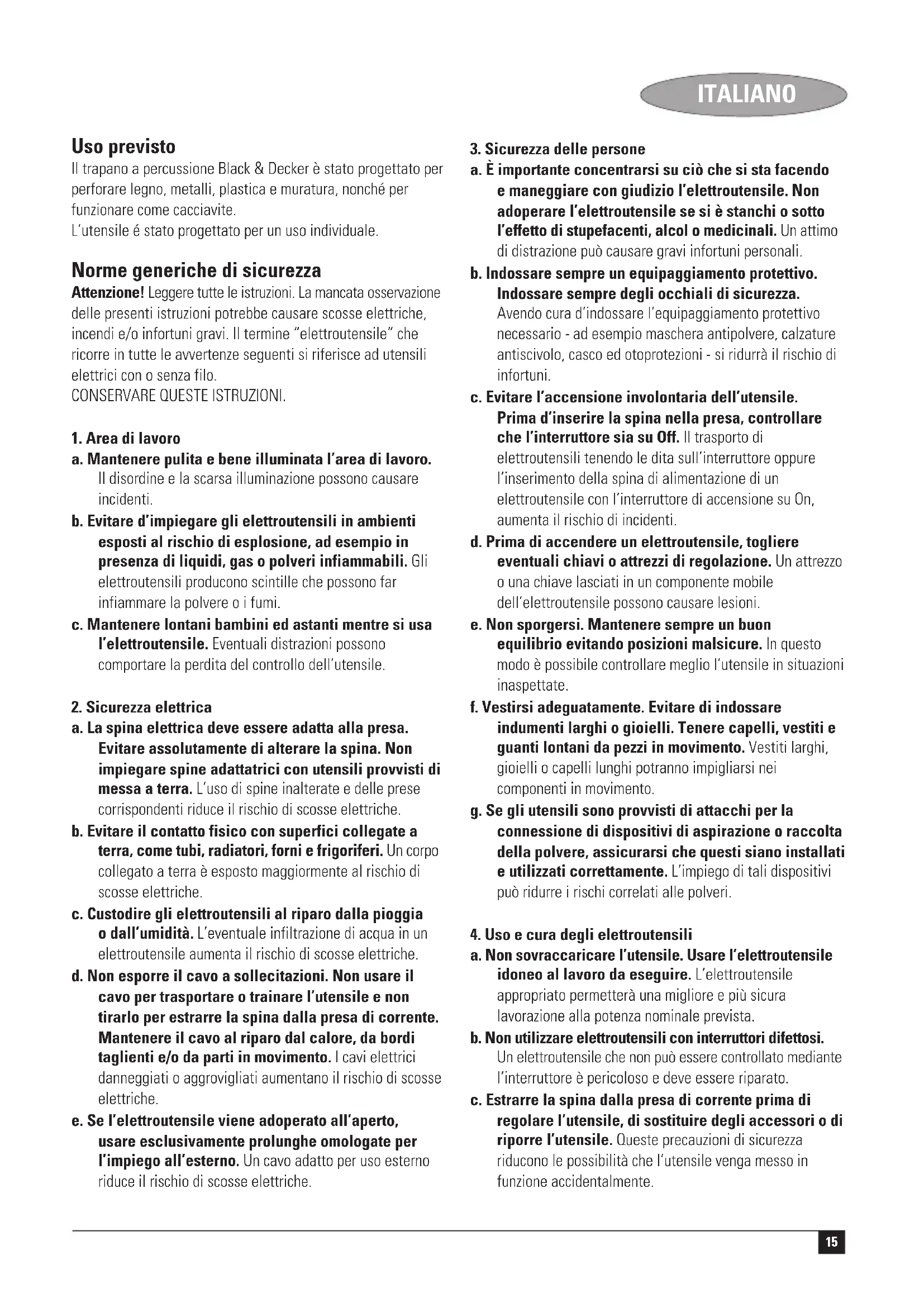 a. Fare riparare l’utensile solo ed esclusivamente da personale specializzato e solo impiegando pezzi di ricambio originali, per conservare le condizioni di sicurezza dell’elettroutensile. Ulteriori istruzioni di sicurezza per trapani a percussione ◆ Indossare protezioni acustiche per utilizzare i trapani a percussione. L’esposizione al rumore può causare la perdita dell’udito. ◆ Utilizzare le impugnature ausiliarie fornite con l’elettroutensile. La perdita di controllo può causare lesioni. Sicurezza elettrica Il doppio isolamento di cui è provvisto l’utensile rende superfluo il filo di terra. Controllare sempre che l’alimentazione corrisponda alla tensione indicata sulla targhetta delle caratteristiche. ◆ L’elettroutensile non deve essere utilizzato da ragazzi o persone inabili senza la supervisione di un adulto. Controllare i bambini per evitare che giochino con l’elettroutensile. ◆ Se il cavo elettrico in dotazione risulta danneggiato, deve essere sostituito dal produttore o da un Centro di assistenza autorizzato Black & Decker, onde evitare rischi. Funzioni Quest’utensile ha alcune o tutte le caratteristiche elencate di seguito.
