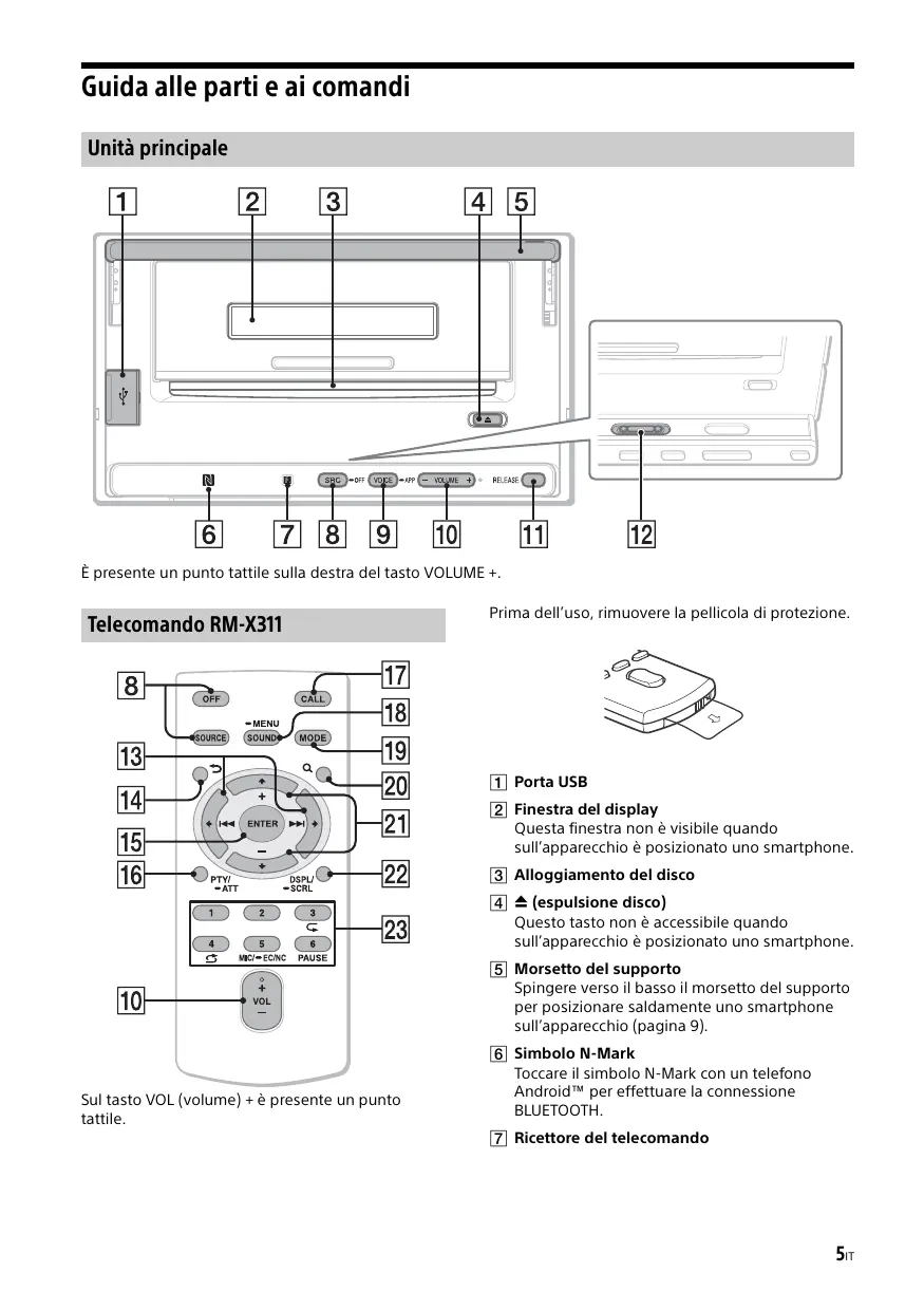 Guida alle parti e ai comandi Unità principale È presente un punto tattile sulla destra del tasto VOLUME +. Telecomando RM-X311 Prima dell’uso, rimuovere la pellicola di protezione. Porta USB Finestra del display Questa finestra non è visibile quando sull’apparecchio è posizionato uno smartphone. Alloggiamento del disco (espulsione disco) Questo tasto non è accessibile quando sull’apparecchio è posizionato uno smartphone. Morsetto del supporto Spingere verso il basso il morsetto del supporto per posizionare saldamente uno smartphone sull’apparecchio (pagina 9). Sul tasto VOL (volume) + è presente un punto tattile. Simbolo N-Mark Toccare il simbolo N-Mark con un telefono Android™ per effettuare la connessione BLUETOOTH. Ricettore del telecomando 5IT SRC (sorgente)(sull’unità principale)/SOURCE (sul telecomando) Per accendere l’apparecchio. Per cambiare la sorgente. -OFF (sull’unità principale)/OFF (sul telecomando) Tenere premuto OFF sull’unità principale per 1 secondo per spegnere l’apparecchio. Premere OFF sul telecomando per spegnere l’apparecchio. Tenere premuto per più di 2 secondi per spegnere l’apparecchio e disattivare il display. Se l’apparecchio viene spento e il display disattivato, non sarà possibile utilizzarlo mediante il telecomando. VOICE (pagina 15) Per attivare la chiamata vocale. Quando è attiva la funzione App Remote, anche il riconoscimento vocale è attivo (solo telefono Android). -APP Tenere premuto per più di 2 secondi per eseguire la funzione App Remote (connessione). VOLUME (VOL) +/– RELEASE Il morsetto del supporto si solleva e diventa possibile rimuovere lo smartphone dall’apparecchio. Connettore di ricarica magnetico È possibile caricare uno smartphone Sony Xperia con connettore di ricarica magnetico posizionandolo sull’apparecchio (pagina 10).