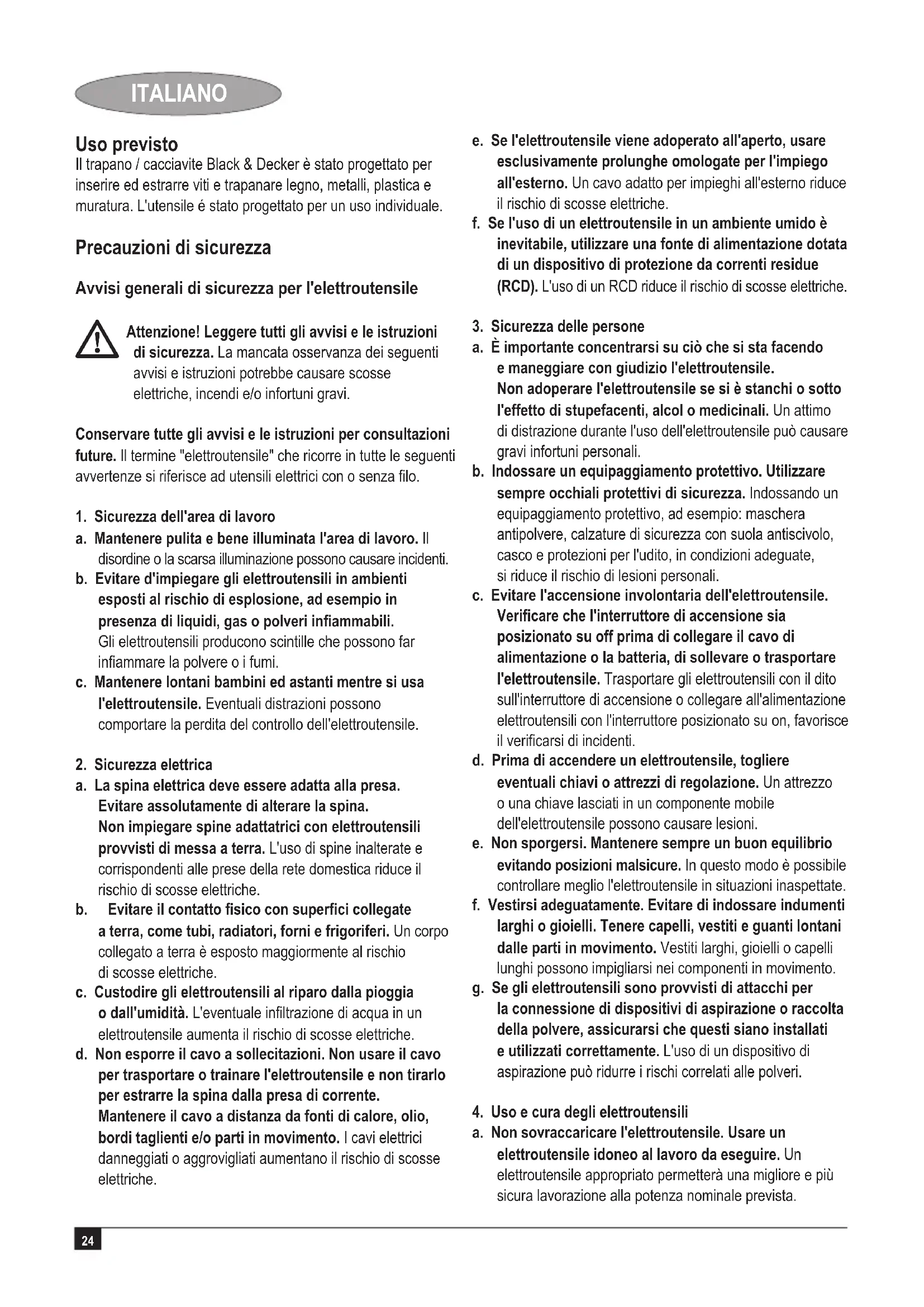 Attenzione! Per ridurre il rischio di lesioni, l'utente è tenuto a leggere il presente manuale di istruzioni. Istruzioni supplementari sulla sicurezza per batterie e caricatori Batterie u Non tentare mai di aprire le batterie, per nessuna ragione.u Non esporre la batteria all'acqua.u Non conservarle in ambienti in cui la temperatura possa superare i 40 °C. u Caricarle solo a temperatura ambiente compresa tra 10 °C e 40 °C. u Caricare la batteria solo usando il caricabatterie fornito con l'elettroutensile. u Per smaltire le batterie seguire le istruzioni riportate nel capitolo "Protezione dell'ambiente". Caricabatterie u Usare il caricabatterie Black & Decker soltanto per caricare le batterie fornite con l'elettrodomestico. Batterie di altro tipo possono esplodere, provocando danni a persone e cose. u Non tentare mai di ricaricare una batteria non ricaricabile.u Sostituire immediatamente i cavi difettosi.u Non esporre il caricabatterie all'acqua.u Non aprire il caricabatterie.u Non applicare i puntali di un multimetro sul caricabatterie.