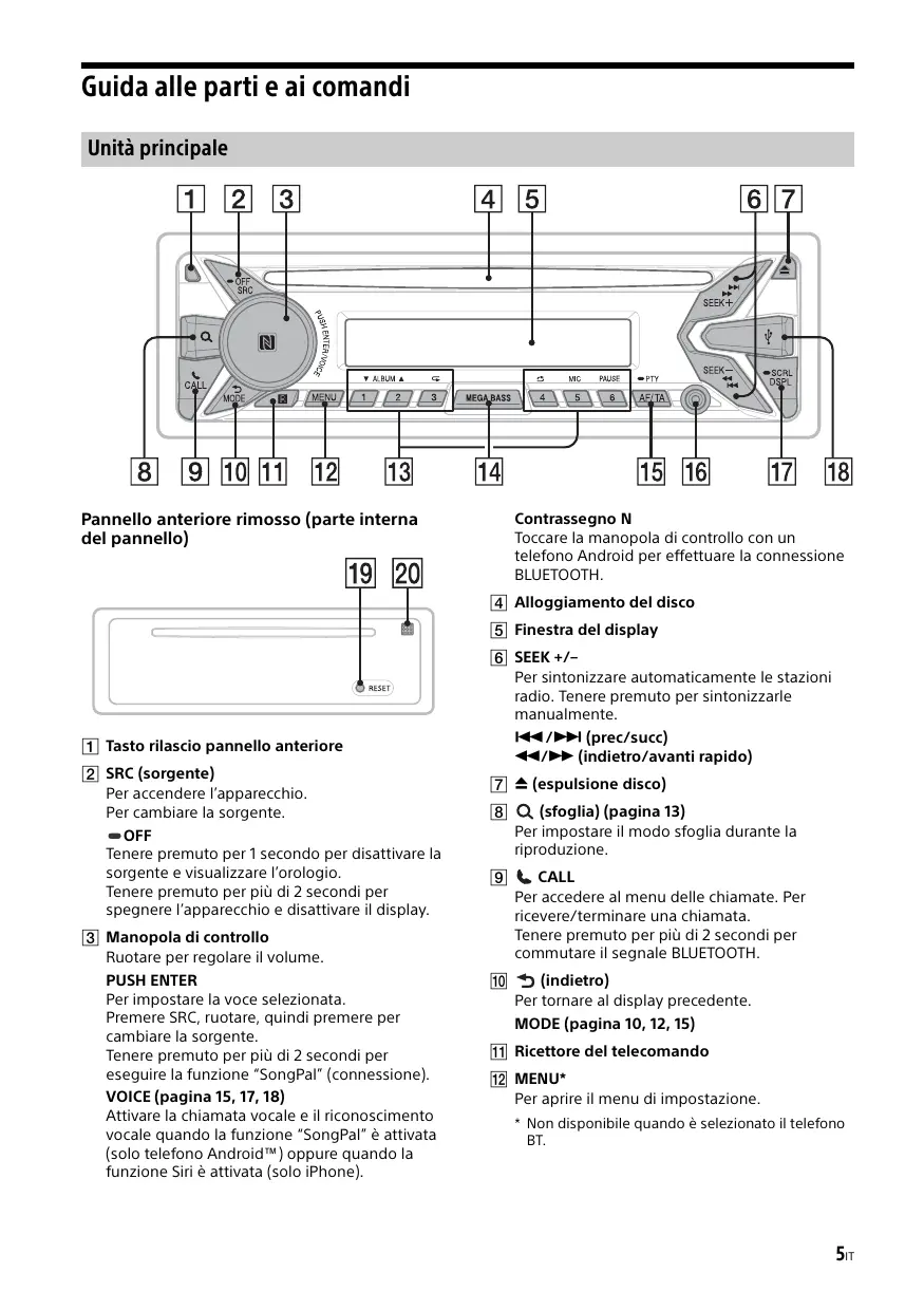 Manopola di controllo Ruotare per regolare il volume. PUSH ENTER Per impostare la voce selezionata. Premere SRC, ruotare, quindi premere per cambiare la sorgente. Tenere premuto per più di 2 secondi per eseguire la funzione “SongPal” (connessione). VOICE (pagina 15, 17, 18) Attivare la chiamata vocale e il riconoscimento vocale quando la funzione “SongPal” è attivata (solo telefono Android™) oppure quando la funzione Siri è attivata (solo iPhone).