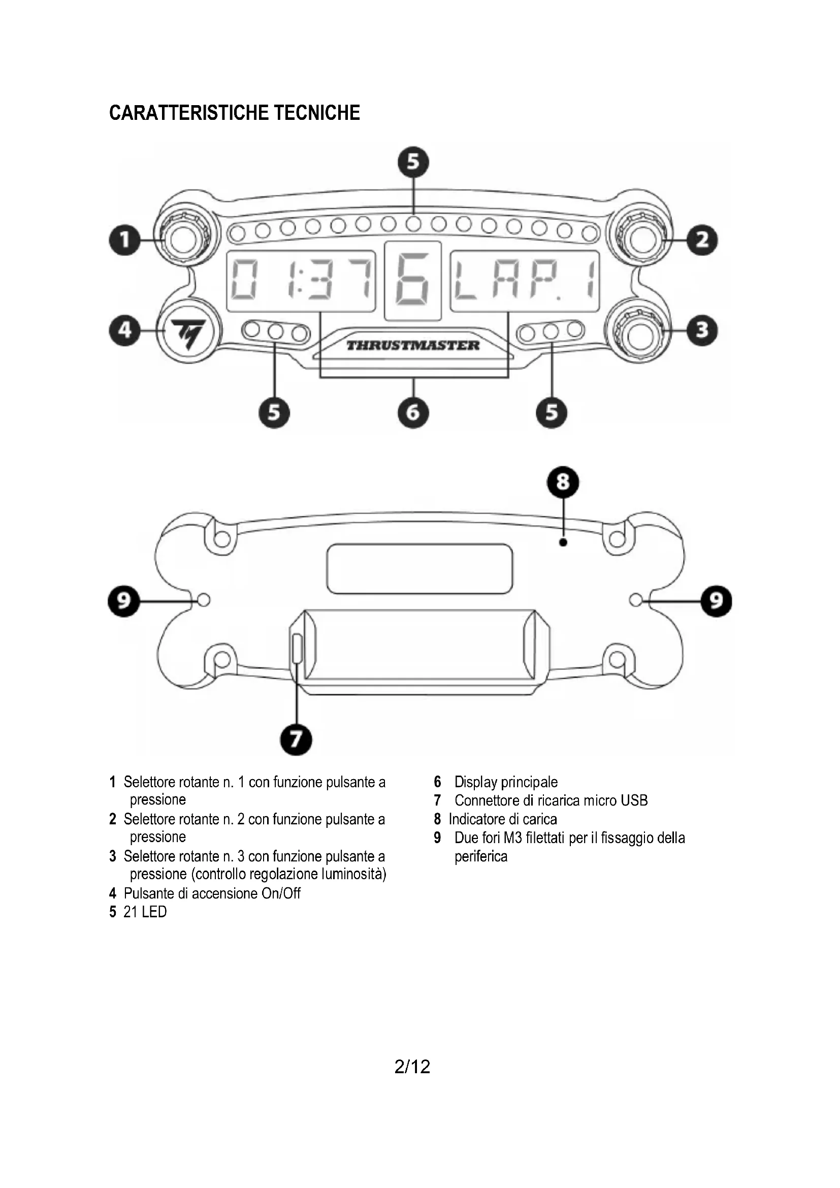 Visita il sito http://support.thrustmaster.com. Seleziona Volanti / BT LED DISPLAY, quindi Manuale d’uso o FAQ.10/12 Informazioni sulla garanzia al consumatore A livello mondiale, Guillemot Corporation S.A., avente sede legale in Place du Granier, B.P. 97143, 35571 Chantepie, Francia (d’ora in avanti “Guillemot”) garantisce al consumatore che il presente prodotto Thrustmaster sarà privo di difetti relativi ai materiali e alla fabbricazione, per un periodo di garanzia corrispondente al limite temporale stabilito per la presentazione di un reclamo riguardante la conformità del prodotto in questione. Nei paesi della Comunità Europea, tale periodo equivale a due (2) anni a partire dalla consegna del prodotto Thrustmaster. In altri paesi, la durata della garanzia corrisponde al limite temporale stabilito per la presentazione di un reclamo riguardante la conformità del prodotto Thrustmaster in base alle leggi applicabili nel paese in cui il consumatore risiedeva alla data di acquisto del prodotto Thrustmaster (qualora nel paese in questione non esistesse alcuna norma a riguardo, il periodo di garanzia corrisponderà a un (1) anno a partire dalla data originale di acquisto del prodotto Thrustmaster). Qualora, durante il periodo di garanzia, il prodotto dovesse apparire difettoso, contatti immediatamente l’Assistenza Tecnica, che le indicherà la procedura da seguire. Qualora il difetto dovesse essere confermato, il prodotto dovrà essere riportato al luogo di acquisto (o qualsiasi altro luogo indicato dall’Assistenza Tecnica). Nel contesto della presente garanzia, il prodotto difettoso di proprietà del consumatore potrà essere sostituito o reso nuovamente funzionante, a discrezione dell’Assistenza Tecnica. Se, durante il periodo coperto dalla garanzia, il prodotto Thrustmaster fosse oggetto di tale rimessa in operatività, alla rimanente durata della garanzia dovrà essere aggiunto un periodo di almeno sette (7) giorni, durante il quale il prodotto risulta non utilizzabile (tale periodo intercorre dalla data della richiesta di intervento da parte del consumatore o dalla data in cui il prodotto in questione è reso disponibile per la rimessa in operatività, questo nel caso in cui tale data sia successiva alla data di richiesta di intervento). Qualora le leggi applicabili in materia lo consentano, la totale responsabilità di Guillemot e delle sue controllate (compresi i danni conseguenti) si limita alla rimessa in operatività o alla sostituzione del prodotto Thrustmaster. Qualora le leggi applicabili in materia lo consentano, Guillemot declina ogni garanzia sulla commerciabilità o la conformità a finalità particolari. La presente garanzia non potrà essere applicata: (1) se il prodotto è stato modificato, aperto, alterato o ha subito danni derivanti da un uso inappropriato o non autorizzato, da negligenza, da un incidente, dalla semplice usura, o da qualsiasi altra causa non riconducibile a difetti nei materiali o nell'assemblaggio (compresi, ma non i soli, prodotti Thrustmaster combinati con elementi inadatti, tra cui, in particolare, batterie ricaricabili, caricatori o qualsiasi altro elemento non fornito da Guillemot per questo prodotto); (2) nel caso in cui il prodotto sia stato utilizzato per qualsiasi altro scopo al di fuori dell’uso domestico, comprese finalità professionali o commerciali (esempio: sale giochi, allenamenti, concorsi); (3) in caso di mancato rispetto delle istruzioni fornite dall'Assistenza Tecnica; (4) in caso di software, ovvero software soggetto a una specifica garanzia; (5) ai materiali di consumo (elementi che richiedono la loro sostituzione al termine della loro durata di esercizio come, ad esempio, batterie di tipo convenzionale o cuscinetti protettivi per auricolari o cuffie); (6) agli accessori (ad esempio, cavi, custodie, borsette, borse, cinturini); (7) se il prodotto è stato venduto ad un'asta pubblica. La presente garanzia non è trasferibile. I diritti legali del consumatore, stabiliti dalle leggi vigenti in materia di vendita di beni di consumo nel relativo paese, non vengono intaccati dalla presente garanzia.11/12 Disposizioni addizionali sulla garanzia Per tutta la durata della garanzia, in linea di principio, Guillemot non fornirà alcuna parte di ricambio, in quanto la sola Assistenza Tecnica è la parte autorizzata ad aprire e/o rimettere in funzionamento tutti i prodotti Thrustmaster (fatta eccezione per eventuali procedure di rimessa in operatività che l’Assistenza Tecnica potrebbe richiedere al consumatore, attraverso istruzioni scritte – viste, ad esempio, la semplicità e la mancanza di riservatezza della procedura di rimessa in operatività – e fornendo al consumatore le necessarie parti di ricambio, se ve ne fosse l’esigenza). Considerando i propri cicli di innovazione e per proteggere il proprio know-how e i propri segreti commerciali, in linea di principio, Guillemot non fornirà alcuna notifica o parte di ricambio finalizzata alla rimessa in attività di un qualunque prodotto Thrustmaster il cui periodo di garanzia risultasse scaduto. Responsabilità Qualora le leggi applicabili in materia lo consentano, Guillemot Corporation S.A. (d'ora in avanti “Guillemot”) e le sue controllate declinano ogni responsabilità per qualsiasi danno derivante da almeno una delle seguenti condizioni: (1) il prodotto è stato modificato, aperto o alterato; (2) mancato rispetto delle istruzioni di installazione; (3) uso inappropriato o non permesso, negligenza, incidente (come, ad esempio, un impatto); (4) semplice usura; (5) utilizzo del prodotto per qualsiasi altro scopo al di fuori dell’uso domestico, comprese finalità professionali o commerciali (esempio: sale giochi, allenamenti, concorsi). Qualora le leggi applicabili in materia lo consentano, Guillemot e le sue controllate declinano ogni responsabilità per qualsiasi danno non riconducibile a difetti nei materiali o nella fabbricazione del prodotto (compresi, ma 