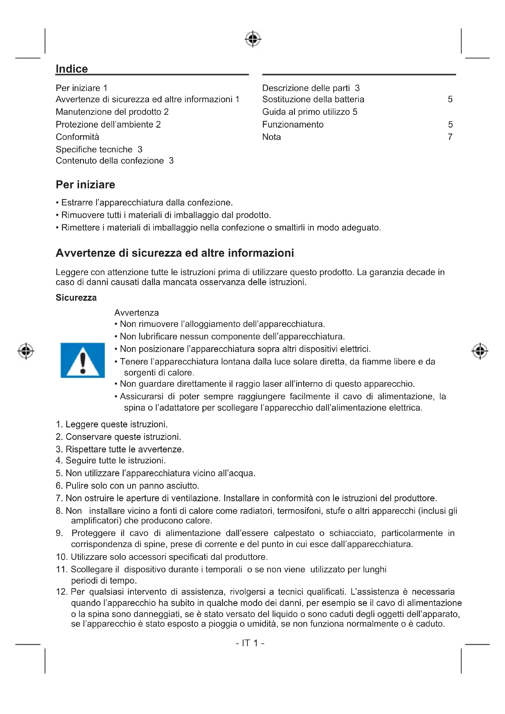 vvertenze di sicurezza ed altre informazioni 1 Manutenzione del prodotto 2 Protezione dell’ambiente 2 Conformità Speciche tecniche 3 Contenuto della confezione 3 Descrizione delle parti 3 Sostituzione della batteria Guida al primo utilizzo 5 Funzionamento 5 Nota Per iniziare