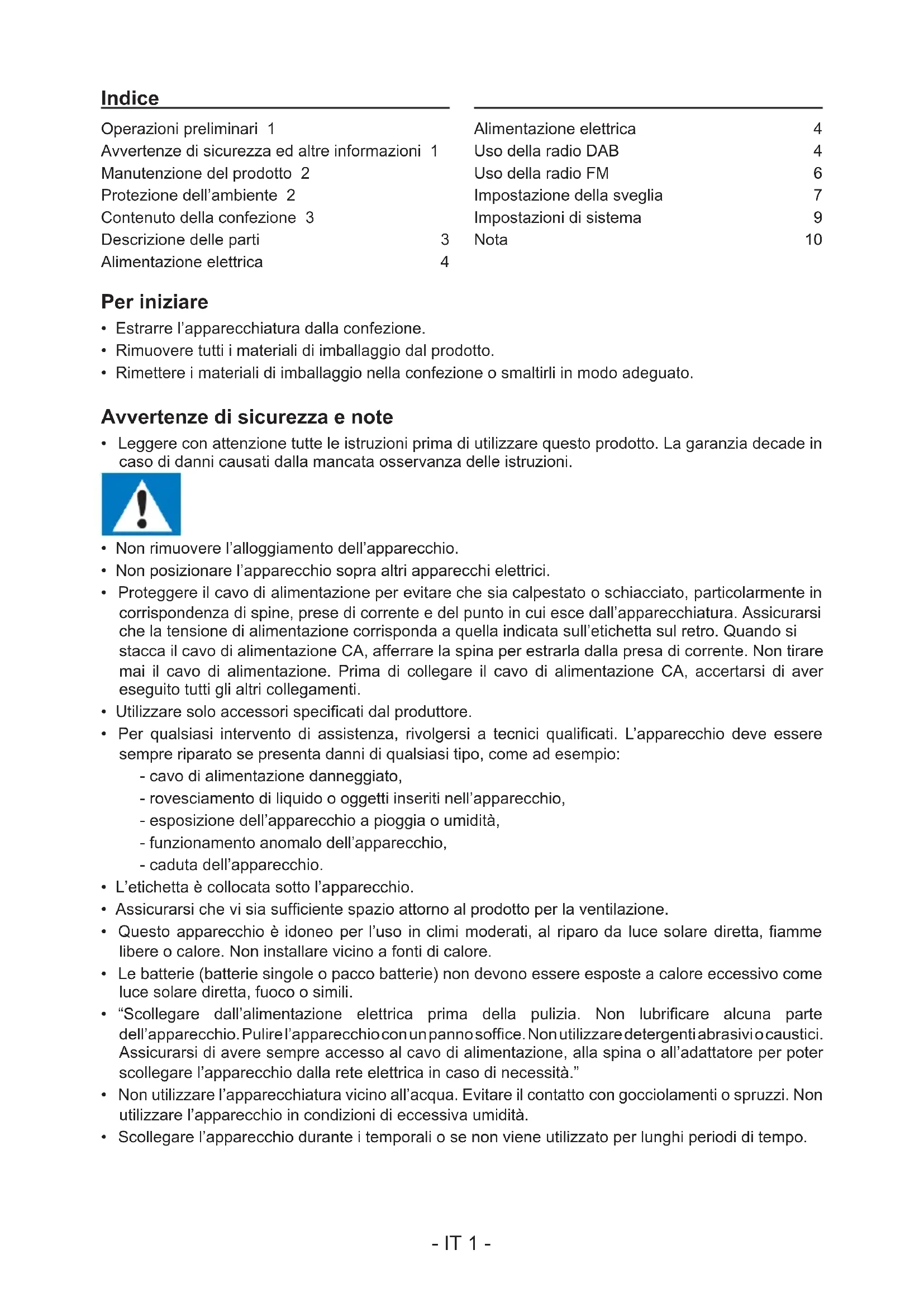 - Scollegare l’apparecchio durante i temporali o se non viene utilizzato per lunghi periodi di tempo. Operazioni preliminari 1 Avvertenze di sicurezza ed altre informazioni 1 Manutenzione del prodotto 2 Protezione dell’ambiente 2 Contenuto della confezione 3 Descrizione delle parti 3 Alimentazione elettrica 4 Alimentazione elettrica 4 Uso della radio DAB 4 Uso della radio FM 6 Impostazione della sveglia 7 Impostazioni di sistema 9 Nota: 10