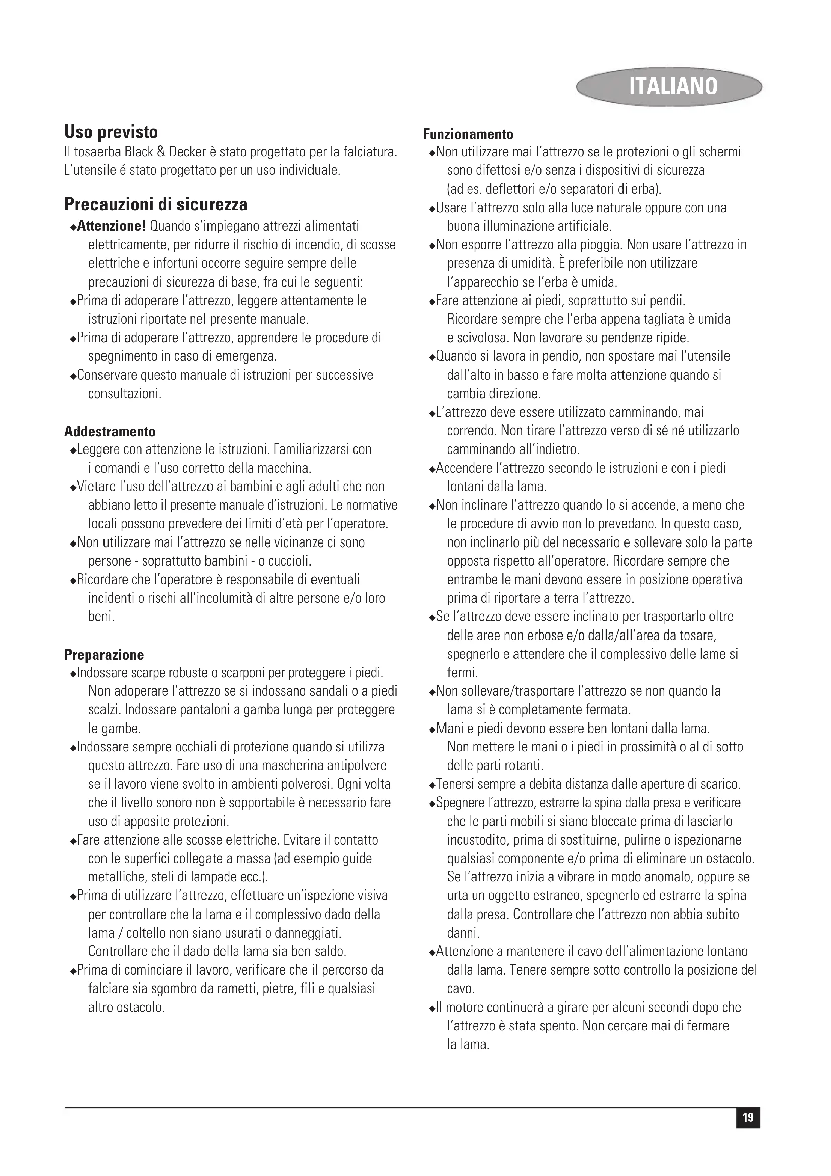 Kevin Hewitt Director of Consumer Engineering Spennymoor, County Durham DL16 6JG, United Kingdom 1-10-2003 Garantie Black & Decker est confiant dans la qualité de ses produits et vous offre une garantie très étendue. Ce certificat de garantie est un document supplémentaire et ne peut en aucun cas se substituer à vos droits légaux. La garantie est valable sur tout le territoire des Etats Membres de l’Union Européenne et de la Zone de Libre Echange Européenne.18 FRANÇAIS Si un produit Black & Decker s’avère défectueux en raison de matériaux en mauvaises conditions, d’une erreur humaine, ou d’un manque de conformité dans les 24 mois suivant la date d’achat, Black & Decker garantit le remplacement des pièces défectueuses, la réparation des produits usés ou cassés ou remplace ces produits à la convenance du client, sauf dans les circonstances suivantes : ◆ Le produit a été utilisé dans un but commercial, professionnel, ou a été loué. ◆ Le produit a été mal utilisé ou avec négligence. ◆ Le produit a subi des dommages à cause d’objets étrangers, de substances ou à cause d’accidents. ◆ Des réparations ont été tentées par des techniciens ne faisant pas partie du service technique de Black & Decker. Pour avoir recours à la garantie, il est nécessaire de fournir une preuve d’achat au vendeur ou à un réparateur agréé. Pour connaître l’adresse du réparateur agréé le plus proche de chez vous, contactez le bureau Black & Decker à l’adresse indiquée dans ce manuel. Vous pourrez aussi trouver une liste des réparateurs agréés de Black & Decker et de plus amples détails sur notre service après-vente sur le site Internet à l’adresse suivante : www.2helpU.com. Visitez notre site Web www.blackanddecker.com pour enregistrer votre nouveau produit Black & Decker et être informé des nouveaux produits et des offres spéciales. Pour plus d’informations concernant la marque Black & Decker et notre gamme de produits, consultez notre site www.blackanddecker.com.19 ITALIANO Uso previsto Il tosaerba Black & Decker è stato progettato per la falciatura. L’utensile é stato progettato per un uso individuale. Precauzioni di sicurezza ◆ Attenzione! Quando s’impiegano attrezzi alimentati elettricamente, per ridurre il rischio di incendio, di scosse elettriche e infortuni occorre seguire sempre delle precauzioni di sicurezza di base, fra cui le seguenti: ◆ Prima di adoperare l’attrezzo, leggere attentamente le istruzioni riportate nel presente manuale. ◆ Prima di adoperare l’attrezzo, apprendere le procedure di spegnimento in caso di emergenza. ◆ Conservare questo manuale di istruzioni per successive consultazioni. Addestramento ◆ Leggere con attenzione le istruzioni. Familiarizzarsi con i comandi e l’uso corretto della macchina. ◆ Vietare l’uso dell’attrezzo ai bambini e agli adulti che non abbiano letto il presente manuale d’istruzioni. Le normative locali possono prevedere dei limiti d’età per l’operatore. ◆ Non utilizzare mai l’attrezzo se nelle vicinanze ci sono persone - soprattutto bambini - o cuccioli. ◆ Ricordare che l’operatore è responsabile di eventuali incidenti o rischi all’incolumità di altre persone e/o loro beni. Preparazione ◆ Indossare scarpe robuste o scarponi per proteggere i piedi. Non adoperare l’attrezzo se si indossano sandali o a piedi scalzi. Indossare pantaloni a gamba lunga per proteggere le gambe. ◆ Indossare sempre occhiali di protezione quando si utilizza questo attrezzo. Fare uso di una mascherina antipolvere se il lavoro viene svolto in ambienti polverosi. Ogni volta che il livello sonoro non è sopportabile è necessario fare uso di apposite protezioni. ◆ Fare attenzione alle scosse elettriche. Evitare il contatto con le superfici collegate a massa (ad esempio guide metalliche, steli di lampade ecc.). ◆ Prima di utilizzare l’attrezzo, effettuare un’ispezione visiva per controllare che la lama e il complessivo dado della lama / coltello non siano usurati o danneggiati. Controllare che il dado della lama sia ben saldo. ◆ Prima di cominciare il lavoro, verificare che il percorso da falciare sia sgombro da rametti, pietre, fili e qualsiasi altro ostacolo. Funzionamento ◆ Non utilizzare mai l’attrezzo se le protezioni o gli schermi sono difettosi e/o senza i dispositivi di sicurezza (ad es. deflettori e/o separatori di erba). ◆ Usare l’attrezzo solo alla luce naturale oppure con una buona illuminazione artificiale. ◆ Non esporre l’attrezzo alla pioggia. Non usare l’attrezzo in presenza di umidità. È preferibile non utilizzare l’apparecchio se l’erba è umida. ◆ Fare attenzione ai piedi, soprattutto sui pendii. Ricordare sempre che l’erba appena tagliata è umida e scivolosa. Non lavorare su pendenze ripide. ◆ Quando si lavora in pendio, non spostare mai l’utensile dall’alto in basso e fare molta attenzione quando si cambia direzione. ◆ L’attrezzo deve essere utilizzato camminando, mai correndo. Non tirare l’attrezzo verso di sé né utilizzarlo camminando all’indietro. ◆ Accendere l’attrezzo secondo le istruzioni e con i piedi lontani dalla lama. ◆ Non inclinare l’attrezzo quando lo si accende, a meno che le procedure di avvio non lo prevedano. In questo caso, non inclinarlo più del necessario e sollevare solo la parte opposta rispetto all’operatore. Ricordare sempre che entrambe le mani devono essere in posizione operativa prima di riportare a terra l’attrezzo. ◆ Se l’attrezzo deve essere inclinato per trasportarlo oltre delle aree non erbose e/o dalla/all’area da tosare, spegnerlo e attendere che il complessivo delle lame si fermi. ◆ Non sollevare/trasportare l’attrezzo se non quando la lama si è completamente fermata. ◆ Mani e piedi devono essere ben lontani dalla lama. Non mettere le mani o i piedi in prossimità o al di sotto delle parti rotanti. ◆ Tenersi sempre a debita distanza