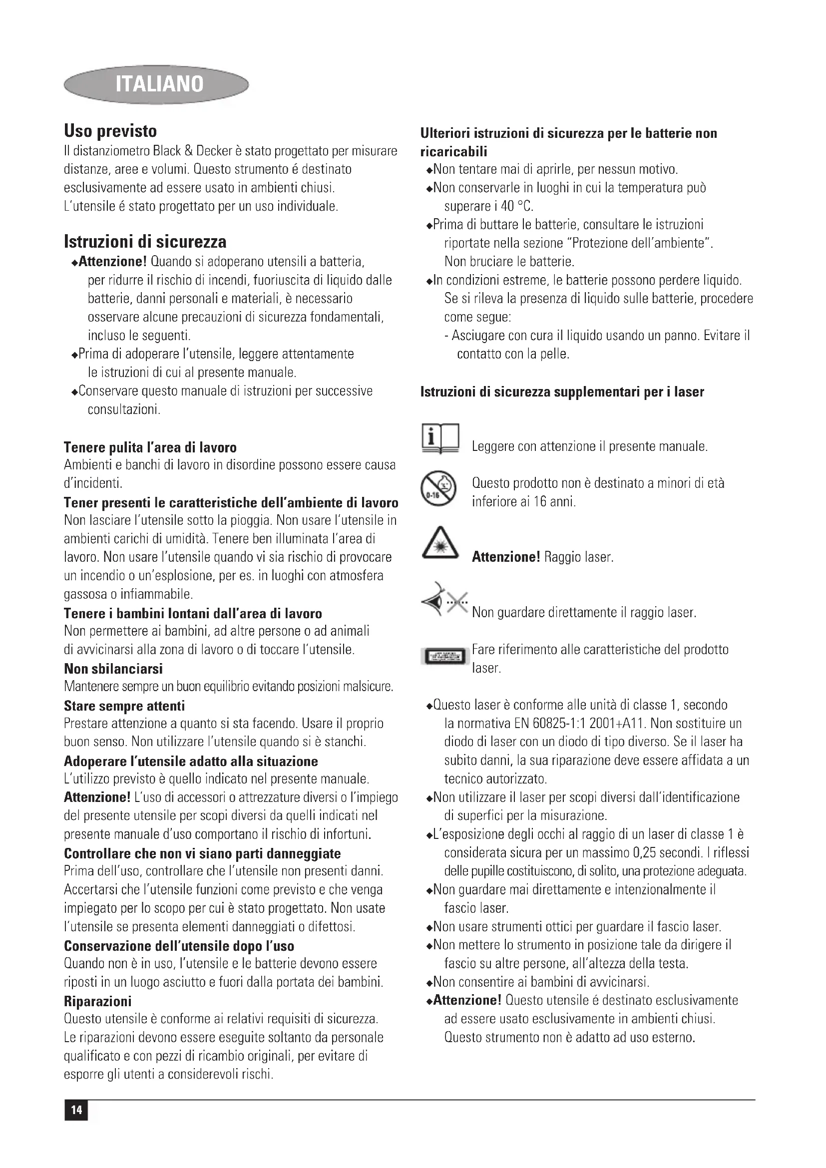 Kevin Hewitt Directeur du Développement Spennymoor, County Durham DL16 6JG, Royaume-Uni 1-11-2004 Garantie Black & Decker est confiant dans la qualité de ses produits et vous offre une garantie très étendue. Ce certificat de garantie est un document supplémentaire et ne peut en aucun cas se substituer à vos droits légaux. La garantie est valable sur tout le territoire des Etats Membres de l’Union Européenne et de la Zone de Libre Echange Européenne. Si un produit Black & Decker s’avère défectueux en raison de matériaux en mauvaises conditions, d’une erreur humaine, ou d’un manque de conformité dans les 24 mois suivant la date d’achat, Black & Decker garantit le remplacement des pièces défectueuses, la réparation des produits usés ou cassés ou remplace ces produits à la convenance du client, sauf dans les circonstances suivantes : ◆ Le produit a été utilisé dans un but commercial, professionnel, ou a été loué. ◆ Le produit a été mal utilisé ou avec négligence. ◆ Le produit a subi des dommages à cause d’objets étrangers, de substances ou à cause d’accidents. ◆ Des réparations ont été tentées par des techniciens ne faisant pas partie du service technique de Black & Decker.13 FRANÇAIS Pour avoir recours à la garantie, il est nécessaire de fournir une preuve d’achat au vendeur ou à un réparateur agréé. Pour connaître l’adresse du réparateur agréé le plus proche de chez vous, contactez le bureau Black & Decker à l’adresse indiquée dans ce manuel. Vous pourrez aussi trouver une liste des réparateurs agréés de Black & Decker et de plus amples détails sur notre service après-vente sur le site Internet à l’adresse suivante : www.2helpU.com Visitez notre site Web www.blackanddecker.fr pour enregistrer votre nouveau produit Black & Decker et être informé des nouveaux produits et des offres spéciales. Pour plus d’informations concernant la marque Black & Decker et notre gamme de produits, consultez notre site www.blackanddecker.fr14 ITALIANO Uso previsto Il distanziometro Black & Decker è stato progettato per misurare distanze, aree e volumi. Questo strumento é destinato esclusivamente ad essere usato in ambienti chiusi. L’utensile é stato progettato per un uso individuale. Istruzioni di sicurezza ◆ Attenzione! Quando si adoperano utensili a batteria, per ridurre il rischio di incendi, fuoriuscita di liquido dalle batterie, danni personali e materiali, è necessario osservare alcune precauzioni di sicurezza fondamentali, incluso le seguenti. ◆ Prima di adoperare l’utensile, leggere attentamente le istruzioni di cui al presente manuale. ◆ Conservare questo manuale di istruzioni per successive consultazioni. Tenere pulita l’area di lavoro Ambienti e banchi di lavoro in disordine possono essere causa d’incidenti. Tener presenti le caratteristiche dell’ambiente di lavoro Non lasciare l’utensile sotto la pioggia. Non usare l’utensile in ambienti carichi di umidità. Tenere ben illuminata l’area di lavoro. Non usare l’utensile quando vi sia rischio di provocare un incendio o un’esplosione, per es. in luoghi con atmosfera gassosa o infiammabile. Tenere i bambini lontani dall’area di lavoro Non permettere ai bambini, ad altre persone o ad animali di avvicinarsi alla zona di lavoro o di toccare l’utensile. Non sbilanciarsi Mantenere sempre un buon equilibrio evitando posizioni malsicure. Stare sempre attenti Prestare attenzione a quanto si sta facendo. Usare il proprio buon senso. Non utilizzare l’utensile quando si è stanchi. Adoperare l’utensile adatto alla situazione L’utilizzo previsto è quello indicato nel presente manuale. Attenzione! L’uso di accessori o attrezzature diversi o l’impiego del presente utensile per scopi diversi da quelli indicati nel presente manuale d’uso comportano il rischio di infortuni. Controllare che non vi siano parti danneggiate Prima dell’uso, controllare che l’utensile non presenti danni. Accertarsi che l’utensile funzioni come previsto e che venga impiegato per lo scopo per cui è stato progettato. Non usate l’utensile se presenta elementi danneggiati o difettosi. Conservazione dell’utensile dopo l’uso Quando non è in uso, l’utensile e le batterie devono essere riposti in un luogo asciutto e fuori dalla portata dei bambini. Riparazioni Questo utensile è conforme ai relativi requisiti di sicurezza. Le riparazioni devono essere eseguite soltanto da personale qualificato e con pezzi di ricambio originali, per evitare di esporre gli utenti a considerevoli rischi. Ulteriori istruzioni di sicurezza per le batterie non ricaricabili ◆ Non tentare mai di aprirle, per nessun motivo. ◆ Non conservarle in luoghi in cui la temperatura può superare i 40 °C. ◆ Prima di buttare le batterie, consultare le istruzioni riportate nella sezione “Protezione dell’ambiente”. Non bruciare le batterie. ◆ In condizioni estreme, le batterie possono perdere liquido. Se si rileva la presenza di liquido sulle batterie, procedere come segue: - Asciugare con cura il liquido usando un panno. Evitare il contatto con la pelle. Istruzioni di sicurezza supplementari per i laser Leggere con attenzione il presente manuale. Questo prodotto non è destinato a minori di età inferiore ai 16 anni. Attenzione! Raggio laser. Non guardare direttamente il raggio laser. Fare riferimento alle caratteristiche del prodotto laser. ◆ Questo laser è conforme alle unità di classe 1, secondo la normativa EN 60825-1:1 2001+A11. Non sostituire un diodo di laser con un diodo di tipo diverso. Se il laser ha subito danni, la sua riparazione deve essere affidata a un tecnico autorizzato. ◆ Non utilizzare il laser per scopi diversi dall’identificazione di superfici per la misurazione. ◆ L’esposizione degli occhi al raggio di un laser di classe 1 è considerata sicura per un massimo 0,25 secondi. I riflessi delle pupille costituiscono, di solito, una protezione a