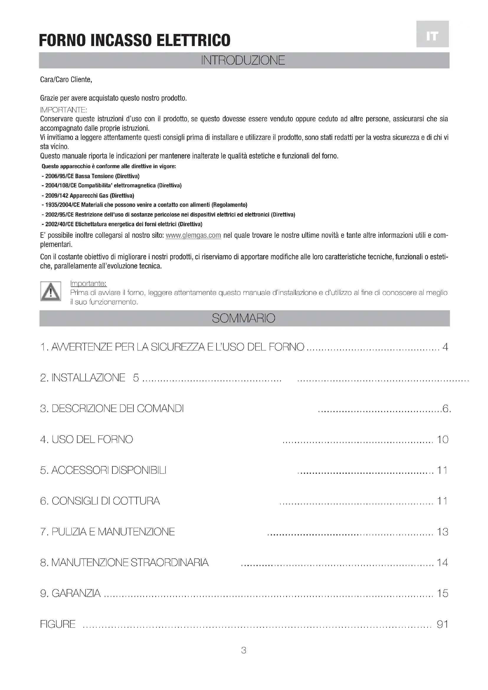 Cara/Caro Cliente, Grazie per avere acquistato questo nostro prodotto. IMPORTANTE: Conservare queste istruzioni d’uso con il prodotto, se questo dovesse essere venduto oppure ceduto ad altre persone, assicurarsi che sia accompagnato dalle proprie istruzioni. Vi invitiamo a leggere attentamente questi consigli prima di installare e utilizzare il prodotto, sono stati redatti per la vostra sicurezza e di chi vi sta vicino. Questo manuale riporta le indicazioni per mantenere inalterate le qualità estetiche e funzionali del forno. E’ possibile inoltre collegarsi al nostro sito: www.glemgas.com nel quale trovare le nostre ultime novità e tante altre informazioni utili e com- plementari. Con il costante obiettivo di migliorare i nostri prodotti, ci riserviamo di apportare modifiche alle loro caratteristiche tecniche, funzionali o esteti- che, parallelamente all’evoluzione tecnica. Importante: Prima di avviare il forno, leggere attentamente questo manuale d’installazione e d’utilizzo al fine di conoscere al meglio il suo funzionamento. INTRODUZIONE