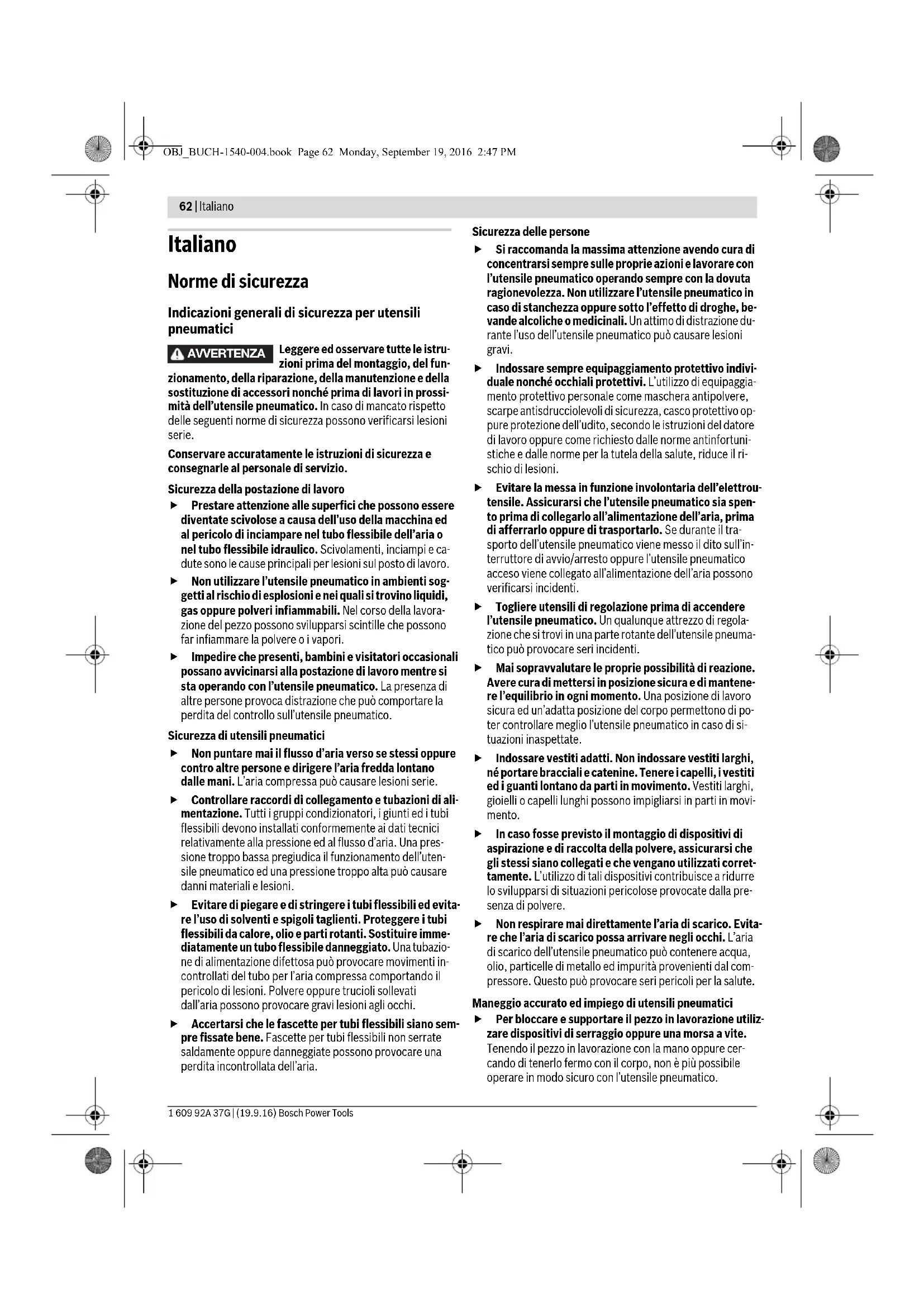 Rotazioni o movimenti al minuto Numero di giri a vuoto bar psi bar pounds per square inch Pressione dell’aria l/s cfm Litri al secondo cubic feet/minute Consumo d’aria OBJ_BUCH-1540-004.book Page 64 Monday, September 19, 2016 2:47 PMItaliano | 65 Bosch Power Tools 1 609 92A 37G | (19.9.16) Descrizione del prodotto e caratteri- stiche Leggere tutte le avvertenze di pericolo e le istruzioni operative. In caso di mancato ri- spetto delle avvertenze di pericolo e delle istru- zioni operative si potrà creare il pericolo di scosse elettriche, incendi e/o incidenti gravi. Alzare il lato apribile con l’illustrazione dell’utensile pneumati- co e lasciare aperto questo lato durante la lettura delle istru- zioni d’uso. Uso conforme alle norme L’utensile pneumatico è idoneo per forare nel legno, nel me- tallo, nella ceramica e nella plastica. Componenti illustrati La numerazione dei componenti rappresentati si riferisce alle illustrazioni riportate sulle pagina con la rappresentazione grafica. Le illustrazioni sono riportate in parte in modo sche- matico e possono essere differenti dal Vostro utensile pneu- matico. 1 Alberino filettato 2 Campo di serraggio(ad es. per un’impugnatura suplementare) 3 Interruttore di avvio/arresto (leva) 4 Staffa di sospensione 5 Raccordo per tubo 6 Superficie per chiave sull’alberino filettato 7 Interruttore di avvio/arresto 8 Uscita aria con silenziatore 9 Impugnatura supplementare* 10 Intagli di fissaggio per staffa di sospensione 11 Fascetta per tubi flessibili 12 Tubo flessibile aria di scarico 13 Vite di fissaggio per coperchio della carcassa 14 Coperchio della carcassa 15 Scarico dell’aria con dado esagonale 16 Anello di tenuta 17 Set aria di scarico (decentrale) 18 Raccordo di collegamento sul set aria di scarico 19 Silenziatore sul set aria di scarico 20 Raccordo alla bocca di entrata dell’aria 21 Tubo dell’aria di alimentazione 22 Tubo flessibile aria di scarico centrale 23 Mandrino a cremagliera 24 Mandrino autoserrante 25 Chiave di serraggio per mandrini 26 Mandrino portautensile 27 Boccola posteriore 28 Boccola anteriore 29 Commutatore del senso di rotazione *L’accessorio illustrato oppure descritto non è compreso nel volu- me di fornitura standard. L’accessorio completo è contenuto nel nostro programma accessori. Dichiarazione di conformità Dichiariamo sotto la nostra piena responsabilità che il prodot- to descritto nella sezione «Dati tecnici» è conforme a tutte le disposizioni pertinenti della Direttiva 2006/42/CE e alle rela- tive modifiche, nonché alle seguenti Normative: EN ISO 11148-3. Fascicolo tecnico (2006/42/CE) presso: Robert Bosch Power Tools GmbH, PT/ETM9, 70538 Stuttgart, GERMANY Robert Bosch Power Tools GmbH70538 Stuttgart, GERMANYStuttgart, 01.01.2017 Dati tecnici dB Decibel Unità di misura del volume acustico relativo QC Mandrino a cambio rapido Mandrino portautensile Simbolo per esagono cavo