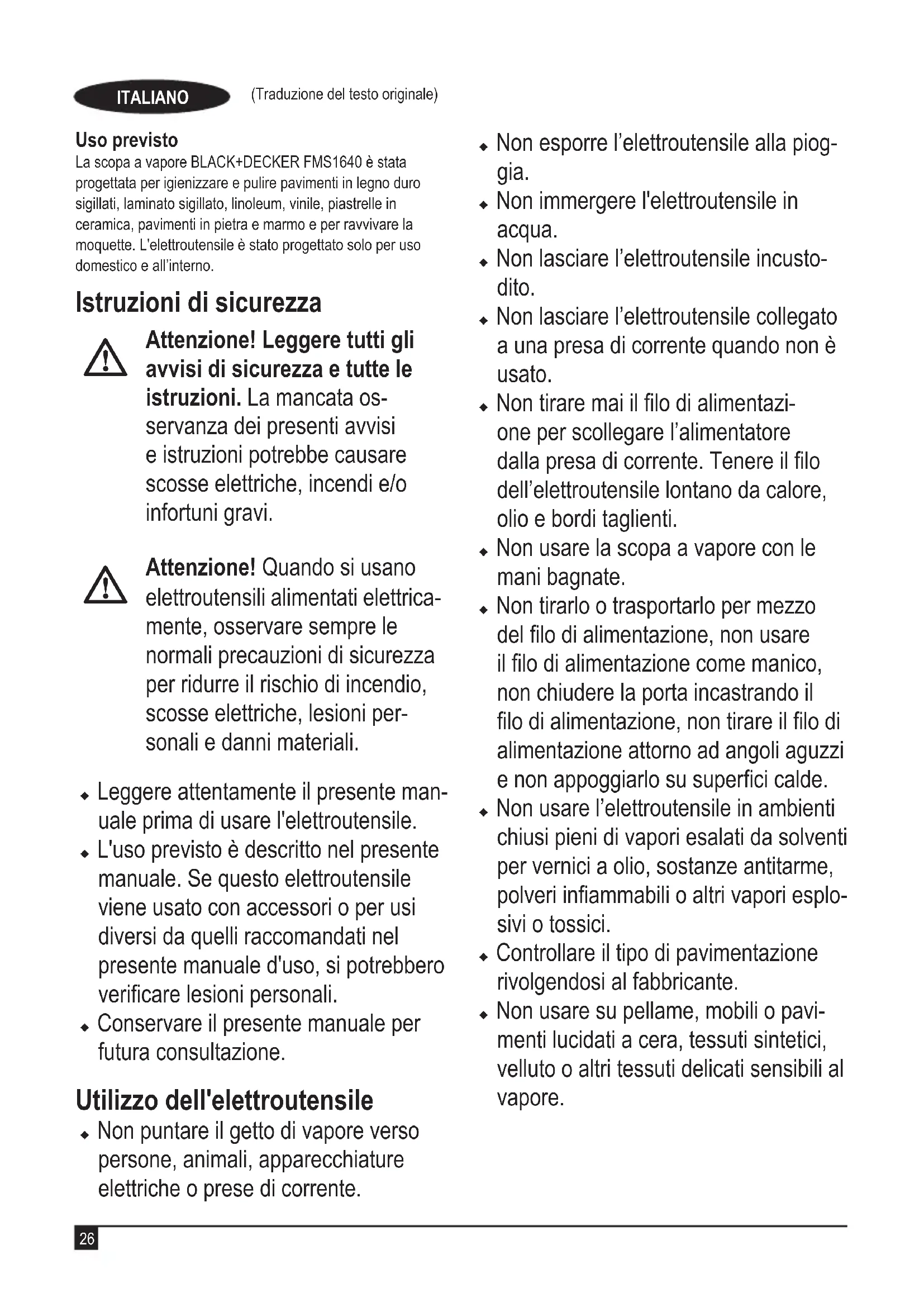 (2) sulla regolazione per Legno/laminato. u Tirando indietro il manico (4) si attiva la pompa del vapore. Dopo alcuni secondi il vapore comincia a fuoriuscire dalla testa a vapore. u Spingere e tirare lentamente la scopa a vapore sulla moquette per ravvivare ogni sezione.32 (Traduzione del testo originale) ITALIANO Nota: Durante l’impiego è possibile spegnere la pompa del vapore riportando il manico (4) in posizione verticale; questo comodo accorgimento consente di appoggiare la scopa a vapore sulla base di appoggio (8) per un breve periodo in modo da poter spostare i mobili e quindi continuare a pulire senza dover spegnere l’elettroutensile. u Dopo aver nito di usare la scopa a vapore, riportare il manico (4) in posizione verticale, spegnerla, appoggiarla sulla base di appoggio (8) e attendere no a quando si raffredda (cinque minuti circa). Avvertenza! è importante controllare il livello dell’acqua nel serbatoio dell’acqua. Per rifornire il serbatoio dell’acqua e continuare a igienizzare/pulire, riportare il manico (4) in posizione verticale e spegnere la scopa a vapore. Scollegare l’elettroutensile dalla presa di corrente a parete, rimuovere e rifornire il serbatoio dell’acqua (3). Avvertenza! Non lasciare mai la scopa a vapore a lungo nel medesimo punto di una qualsiasi pavimentazione. Appoggiare sempre la scopa a vapore sull’apposita base di appoggio (8) con il manico (4) in posizione verticale quando è ferma e accertarsi che sia spenta quando non è usata. Dopo l'impiego (g. J e K) u Riportare il manico (4) in posizione verticale e spegnere la scopa a vapore. u Appoggiare la scopa a vapore sulla base di appoggio (8) e attendere no a quando si raffredda (cinque minuti circa). u Scollegare la scopa a vapore dalla presa di corrente a parete. u Svuotare il serbatoio dell’acqua (3). u Rimuovere il tampone di pulitura (6 o 7) e lavarlo lasciandolo pronto per l’impiego successivo. (Accertarsi di seguire le istruzioni di lavaggio stampate sul tampone di pulitura.) u Avvolgere il lo di alimentazione attorno ai ganci ssa lo (10 e 11). Nota: Il gancio ssa lo superiore (11) ruota per rilasciare facilmente il lo di alimentazione pronto per l’impiego succes- sivo. u Agganciare il lo di alimentazione su sé stesso usando il gancio ssa lo (22) vicino alla spina. u Appoggiare la scopa a vapore sulla base di appoggio (8) per riporla. Nota: Quando il manico (4) è in posizione verticale, il lo di alimentazione è avvolto in modo ordinato attorno ai ganci ssa lo (10 e 11) ed è ssato con l’apposito fermo (22), la scopa a vapore sta in piedi da sola per essere riposta. Altrimenti, vi è una staffa per appenderla (23) incorporata nell’impugnatura (24) che consentirà di appendere la scopa a vapore a un gancio idoneo a parete. Accertarsi sempre che il gancio a parete sia in grado di sorreggere in modo sicuro il peso della scopa a vapore. Pulizia e manutenzione Questo elettroutensile BLACK+DECKER con lo di alimen- tazione è stato progettato per funzionare a lungo con una manutenzione minima. Per ottenere prestazioni sempre sod- disfacenti occorre avere cura dell'elettroutensile e sottoporlo a manutenzione periodica. Avvertenza! Prima di eseguire la manutenzione o di pulire elettroutensili con lo di alimentazione, scollegarli dalla presa di corrente. u Stronare l’elettroutensile con un panno umido e morbido. u Per le macchie ostinate è possibile usare una soluzione di acqua e sapone neutro in cui inumidire lo straccio. Cura dei tamponi di pulitura Istruzioni di lavaggio - Non usare ammorbidenti - Lasciare che sia completamente asciutto prima di riutilizzarlo. Avvertenza! Seguire le istruzioni di lavaggio stampate sull’etichetta del tampone di pulitura. Sostituzione della spina (solo Regno Unito e Irlanda) Se è necessario montare una nuova spina: u smaltire in tutta sicurezza quella vecchia. u Collegare il lo marrone al morsetto sotto tensione della nuova spina. u Collegare il lo blu al morsetto neutro. u Collegare il conduttore verde/giallo al morsetto di terra. Avvertenza! Seguire le istruzioni fornite con le spine di buona qualità. Fusibile consigliato: 13 A. Protezione dell'ambiente