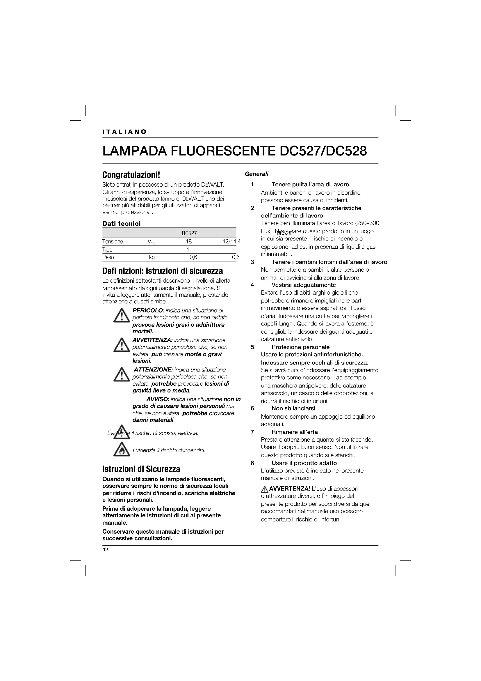 18 12/14,4 Tipo 1 1 Peso kg 0,6 0,6 Defi nizioni: istruzioni di sicurezza Le definizioni sottostanti descrivono il livello di allerta rappresentato da ogni parola di segnalazione. Si invita a leggere attentamente il manuale, prestando attenzione a questi simboli. PERICOLO: indica una situazione di pericolo imminente che, se non evitata, provoca lesioni gravi o addirittura mortali. AVVERTENZA: indica una situazione potenzialmente pericolosa che, se non evitata, può causare morte o gravi lesioni. ATTENZIONE: indica una situazione potenzialmente pericolosa che, se non evitata, potrebbe provocare lesioni di gravità lieve o media. AVVISO: indica una situazione non in grado di causare lesioni personali ma che, se non evitata, potrebbe provocare danni materiali. Evidenzia il rischio di scossa elettrica. Evidenzia il rischio d’incendio. Istruzioni di Sicurezza Quando si utilizzano le lampade fluorescenti, osservare sempre le norme di sicurezza locali per ridurre i rischi d'incendio, scariche elettriche e lesioni personali. Prima di adoperare la lampada, leggere attentamente le istruzioni di cui al presente manuale. Conservare questo manuale di istruzioni per successive consultazioni. Generali 1 Tenere pulita l’area di lavoro Ambienti e banchi di lavoro in disordine possono essere causa di incidenti. 2 Tenere presenti le caratteristiche dell’ambiente di lavoro Tenere ben illuminata l’area di lavoro (250–300 Lux). Non usare questo prodotto in un luogo in cui sia presente il rischio di incendio o esplosione, ad es. in presenza di liquidi e gas infi ammabili. 3 Tenere i bambini lontani dall’area di lavoro Non permettere a bambini, altre persone o animali di avvicinarsi alla zona di lavoro. 4 Vestirsi adeguatamente Evitare l’uso di abiti larghi o gioielli che potrebbero rimanere impigliati nelle parti in movimento o essere aspirati dal fl usso d’aria. Indossare una cuffi a per raccogliere i capelli lunghi. Quando si lavora all’esterno, è consigliabile indossare dei guanti adeguati e calzature antiscivolo. 5 Protezione personale Usare le protezioni antinfortunistiche. Indossare sempre occhiali di sicurezza. Se si avrà cura d’indossare l’equipaggiamento protettivo come necessario – ad esempio una maschera antipolvere, delle calzature antiscivolo, un casco o delle otoprotezioni, si ridurrà il rischio di infortuni. 6 Non sbilanciarsi Mantenere sempre un appoggio ed equilibrio adeguati. 7 Rimanere all’erta Prestare attenzione a quanto si sta facendo. Usare il proprio buon senso. Non utilizzare questo prodotto quando si è stanchi. 8 Usare il prodotto adatto L’utilizzo previsto è indicato nel presente manuale di istruzioni. AVVERTENZA! L’uso di accessori o attrezzature diversi, o l’impiego del presente prodotto per scopi diversi da quelli raccomandati nel manuale uso possono comportare il rischio di infortuni.43 9 Controllare che non vi siano parti danneggiate Prima dell’uso, ispezionare accuratamente il prodotto. Controllare se sono presenti pezzi rotti, danni alle protezioni o agli interruttori e qualsiasi altra condizione che possa infl uenzare il funzionamento dell’apparato. Verifi care che il prodotto funzioni come previsto e che venga impiegato per lo scopo per cui è stato progettato. Non usare il prodotto se presenta elementi danneggiati o difettosi. Non impiegare il prodotto se non è possibile accenderlo e spegnerlo mediante l’interruttore. Eventuali componenti difettosi o danneggiati devono essere sostituiti o riparati da un tecnico autorizzato D EWALT. Non tentare mai di effettuare delle riparazioni. 10 Rimuovere il gruppo batterie Estrarre il gruppo batterie quando non è in uso, prima di cambiare pezzi, accessori o complementi o prima di eseguire interventi di manutenzione. 11 Conservazione Quando questo prodotto non viene utilizzato, si consiglia di conservarlo in un luogo asciutto e di ritirarlo lontano dalla portata dei bambini. 12 Trattare il prodotto con cura Tenere il prodotto in buone condizioni e pulito per prestazioni migliori e più sicure. Osservare le istruzioni per la lubrifi cazione e la sostituzione degli accessori. Mantenere le impugnature e gli interruttori asciutti, puliti e senza tracce di olio o grassi. 13 Riparazioni Questo prodotto è conforme alle principali norme di sicurezza vigenti. Per le riparazioni del prodotto, rivolgersi a un centro autorizzato