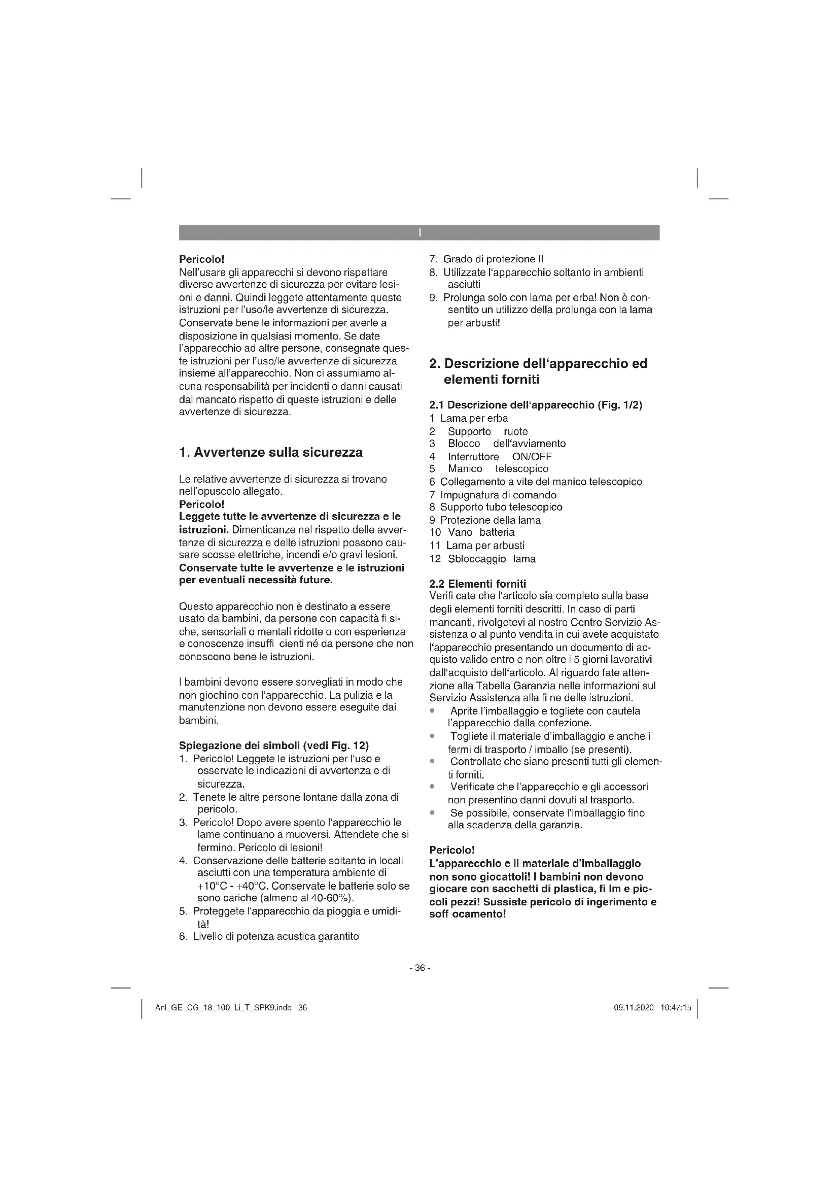Se possibile, conservate l’imballaggio fino alla scadenza della garanzia. Pericolo! L’apparecchio e il materiale d’imballaggio non sono giocattoli! I bambini non devono giocare con sacchetti di plastica, fi lm e pic- coli pezzi! Sussiste pericolo di ingerimento e soff ocamento! Anl_GE_CG_18_100_Li_T_SPK9.indb 36Anl_GE_CG_18_100_Li_T_SPK9.indb 36 09.11.2020 10:47:1509.11.2020 10:47:15I