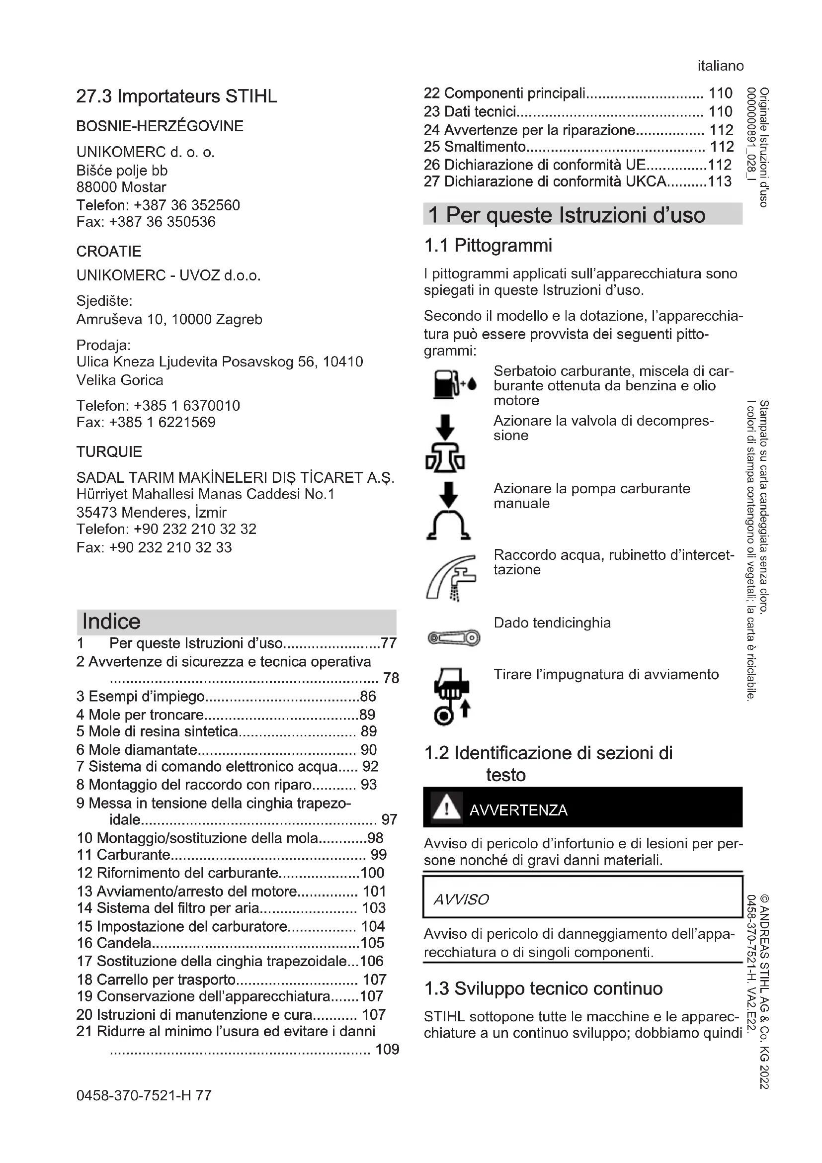STIHL sottopone tutte le macchine e le apparec‐ chiature a un continuo sviluppo; dobbiamo quindi italiano 0458-370-7521-H 77 © ANDREAS STIHL AG & Co. KG 2022 0458-370-7521-H. VA2.E22. Stampato su carta candeggiata senza cloro. I colori di stampa contengono oli vegetali; la carta è riciclabile. Originale Istruzioni d'uso 0000000891_028_Iriservarci modifiche di fornitura per quanto riguarda forma, tecnica e dotazione. Non potranno perciò derivare diritti dai dati e dalle illustrazioni di queste Istruzioni d’uso. 2 Avvertenze di sicurezza e tecnica operativa Nell‘uso della troncatrice occorrono particolari misure di sicurezza, perché il lavoro si svolge con un‘altissima velocità rotatoria della mola. Non mettere in funzione per la prima volta senza avere letto attentamente e per intero le Istruzioni d’uso; con‐ servarle con cura per la successiva consultazione. L’inosservanza delle Istruzioni d’uso può comportare rischi mortali. Rispettare le avvertenze di sicurezza specifiche per Paese, stabilite ad es. da sindacati, casse di previdenza, ispettorato del lavoro e altre autorità. Per i datori di lavoro dell’Unione Europea è obbli‐ gatoria la direttiva CE/2009/104 – Sicurezza e protezione della salute durante il lavoro nell’uso di macchine e apparecchiature da parte dei lavo‐ ratori. Per chi lavora per la prima volta con l’apparec‐ chiatura: Farsi istruire dal venditore o da un altro esperto su come operare in modo sicuro – o par‐ tecipare a un corso di addestramento. L’uso dell’apparecchiatura non è consentito ai minorenni – eccetto i giovani oltre i 16 anni adde‐ strati sotto vigilanza. Tenere lontani bambini, animali e terze persone. Se non si usa l’apparecchiatura a motore, riporla in modo che nessuno venga esposto a pericoli. Metterla al sicuro dall’uso non autorizzato. L'utente è responsabile per gli incidenti o i rischi nei confronti delle altre persone o di altre pro‐ prietà. Affidare o prestare l’apparecchiatura solo a per‐ sone che conoscono e sanno maneggiare que‐ sto modello, dando loro sempre anche le Istru‐ zioni per l’uso. L’impiego di apparecchiature a motore che pro‐ ducono rumore può essere limitato in certe ore da disposizioni nazionali o locali. Chi lavora con l’apparecchiatura a motore deve essere riposato, in buona salute e in buone con‐ dizioni psicofisiche. Chi, per motivi di salute, non deve affaticarsi, deve chiedere al proprio medico se gli è consen‐ tito di lavorare con un’apparecchiatura a motore. Solo per portatori di pacemaker: l'impianto di accensione di questa apparecchiatura emette un campo elettromagnetico molto esiguo. Non è possibile escludere del tutto un'interferenza con alcuni tipi di pacemaker. Per evitare rischi sani‐ tari, STIHL consiglia di consultare il medico curante e il costruttore del pacemaker. Non si deve usare l’apparecchiatura a motore dopo avere assunto bevande alcoliche, medicine che pregiudicano la prontezza di riflessi, o dro‐ ghe. In caso di tempo sfavorevole (neve, ghiaccio, bufera) rimandare il lavoro – elevato pericolo d’infortunio! L’apparecchiatura è prevista solo per troncare. Non è adatta per sezionare legno od oggetti di legno. La polvere di amianto è estremamente nociva alla salute – non tagliare mai amianto! Non è consentito l’uso dell’apparecchiatura a motore per altri scopi; può causare infortuni o danni all’apparecchiatura stessa. Non alterare l'apparecchiatura – sussiste il rischio di comprometterne la sicurezza. STIHL declina ogni responsabilità per i danni a persone e materiali derivanti dall'uso di componenti appli‐ cati non consentiti. Montare solo mole per troncare o accessori auto‐ rizzati da STIHL per questa apparecchiatura o parti tecnicamente equivalenti. Per ulteriori chia‐ rimenti a questo proposito, rivolgersi a un riven‐ ditore specializzato. Usare solo attrezzi o acces‐ sori di prima qualità. Diversamente ci può essere il pericolo di infortuni o di danni all’apparecchia‐ tura. STIHL consiglia di usare mole per troncare e accessori originali STIHL. in quanto hanno carat‐ teristiche ottimali per l'uso in combinazione con il prodotto e rispondono alle esigenze dell'utente. Per la pulizia dell'apparecchiatura, non utilizzare idropulitrici. Il getto d'acqua compatto può dan‐ neggiare componenti dell'apparecchiatura. Non spruzzare acqua sull’apparecchiatura. Non usare mai seghe circolari, attrezzi di metallo duro, per ricupero, per taglio di legno o altri attrezzi con dentatura– pericolo di lesioni mortali! Contrariamente all’asportazione uni‐ italiano 2 Avvertenze di sicurezza e tecnica operativa 78 0458-370-7521-Hforme di particelle nell’uso delle mole per troncare, i denti di una sega circo‐ lare possono agganciare il materiale durante il taglio. Questo produce un effetto di taglio aggressivo e può cau‐ sare reazioni incontrollate e pericolo‐ sissime (rimbalzo) dell’apparecchia‐ tura.