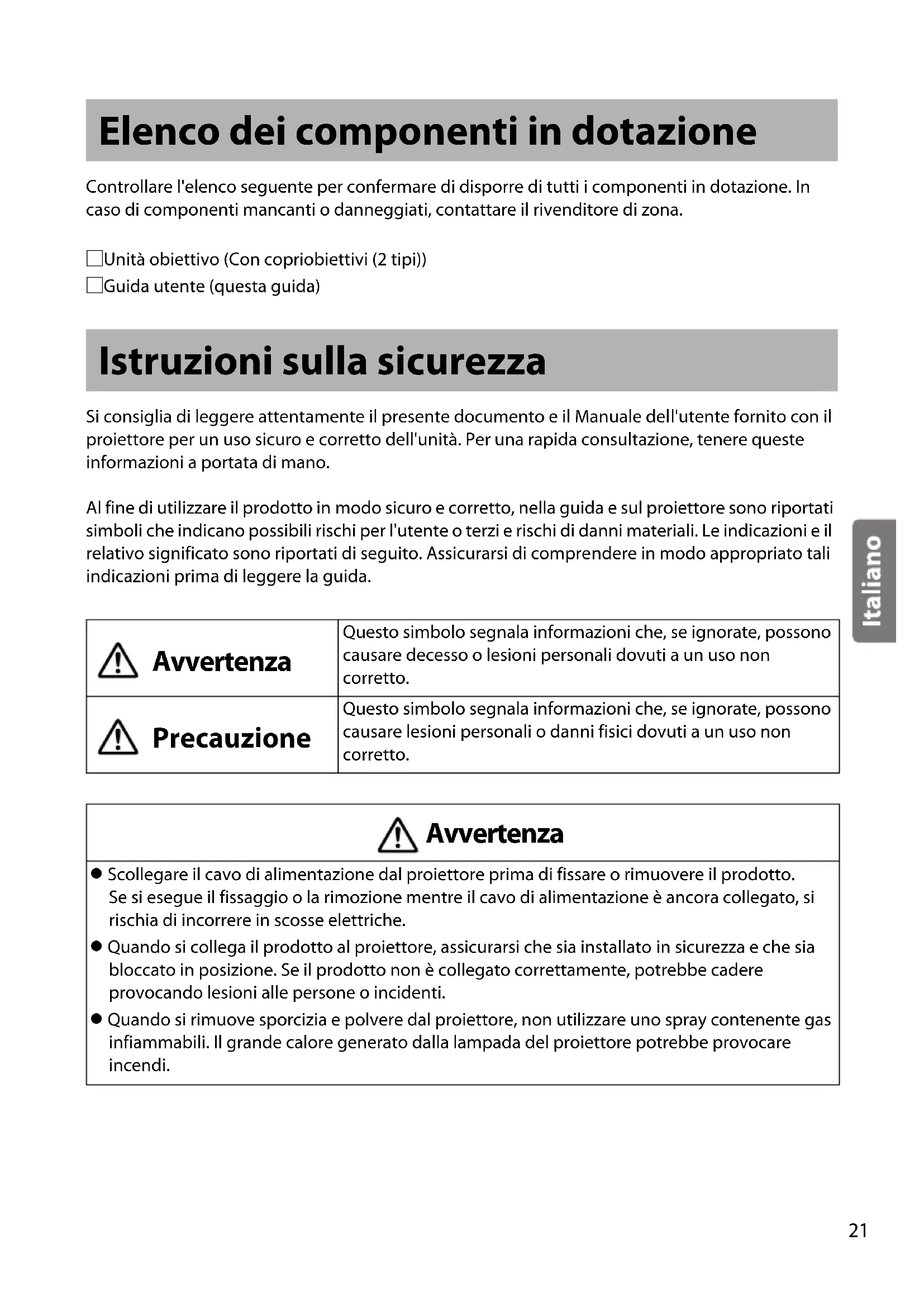 - Dieses Produkt ist ein Fixfokusobjektiv. Die Zoomfunktion wird nicht unterstützt. Die Bedienungsanleitung ist auf der folgenden Website verfügbar. epson.sn Es gibt auch Werkzeuge zur Durchführung detaillierter Projektionssimulationen. http://www.epson.com/ Produktbezeichnung: ELPLX01S/ELPLX01WS Brennweite: 5,8 mm Blendenzahl: 1,9 Betriebstemperatur : 0 bis +45°C (keine Kondensation) Lagerungstemperatur : -10 bis +60°C (keine Kondensation) Gewicht: ca. 3500 g Wenden Sie sich an Ihren Händler oder den nächstgelegenen Service, den Sie über die mit dem Projektor mitgelieferte Dokumentation ermitteln können. Bild anpassen Technische Daten21 Controllare l'elenco seguente per confermare di disporre di tutti i componenti in dotazione. In caso di componenti mancanti o danneggiati, contattare il rivenditore di zona. Y Unità obiettivo (Con copriobiettivi (2 tipi)) Y Guida utente (questa guida) Si consiglia di leggere attentamente il presente documento e il Manuale dell'utente fornito con il proiettore per un uso sicuro e corretto dell'unità. Per una rapida consultazione, tenere queste informazioni a portata di mano. Al fine di utilizzare il prodotto in modo sicuro e corretto, nella guida e sul proiettore sono riportati simboli che indicano possibili rischi per l'utente o terzi e rischi di danni materiali. Le indicazioni e il relativo significato sono riportati di seguito. Assicurarsi di comprendere in modo appropriato tali indicazioni prima di leggere la guida. Elenco dei componenti in dotazione Istruzioni sulla sicurezza Avvertenza Questo simbolo segnala informazioni che, se ignorate, possono causare decesso o lesioni personali dovuti a un uso non corretto. Precauzione Questo simbolo segnala informazioni che, se ignorate, possono causare lesioni personali o danni fisici dovuti a un uso non corretto. Avvertenza v Scollegare il cavo di alimentazione dal proiettore prima di fissare o rimuovere il prodotto. Se si esegue il fissaggio o la rimozione mentre il cavo di alimentazione è ancora collegato, si rischia di incorrere in scosse elettriche. v Quando si collega il prodotto al proiettore, assicurarsi che sia installato in sicurezza e che sia bloccato in posizione. Se il prodotto non è collegato correttamente, potrebbe cadere provocando lesioni alle persone o incidenti. v Quando si rimuove sporcizia e polvere dal proiettore, non utilizzare uno spray contenente gas infiammabili. Il grande calore generato dalla lampada del proiettore potrebbe provocare incendi.22 Precauzione v Durante la proiezione, rimuovere il copriobiettivo dalla parte anteriore dell'obiettivo. v Prima di montare l'unità obiettivo, verificare il numero di modello del proiettore. Se questa unità obiettivo viene montata su un proiettore diverso dal proiettore specificato, l'unità obiettivo o il proiettore può venire danneggiata. v Quando il proiettore è installato a soffitto, disinstallare il proiettore e quindi montare l'unità obiettivo o rimuoverla ponendola in un luogo sicuro. v Prestare attenzione a non inserire le dita nelle fessure durante il fissaggio del prodotto al proiettore poiché ciò potrebbe causare ferite. v Non smontare o rimodellare l'unità. v Non utilizzate o conservate il proiettore in luoghi soggetti a temperature eccessivamente alte o basse. v Non utilizzate o conservate il proiettore in luoghi in cui è presente fumo prodotto da olio o sigarette, in quanto la qualità della proiezione potrebbe risentirne. v Non lasciare che si bagni. v Non farla cadere e non sottoporla a colpi bruschi. Quando si colloca il prodotto a terra, accertarsi di posizionarlo su una superficie piana e stabile. v Quando si sposta il proiettore, non tenere l'unità obiettivo, in quanto potrebbe fuoriuscire e il proiettore potrebbe cadere, causando lesioni. v Rimuovere l'unità obiettivo quando si trasporta il proiettore. Se il proiettore viene trasportato con l'unità obiettivo montata, l'unità obiettivo o il proiettore può venire danneggiata. v Spegnere il proiettore e quindi attendere qualche tempo (circa 30 minuti) prima di rimuovere l'unità obiettivo. Se si tocca l'unità obiettivo durante la proiezione o immediatamente dopo lo spegnimento del proiettore, vi sono rischi di ustioni. v Se è stato effettuato lo spostamento dell'obiettivo, spostare l'obiettivo nella posizione iniziale prima di sostituire l'unità obiettivo. v Non toccare o tirare la parte del connettore o il cavo poiché si possono causare guasti. v Per la pulizia del prodotto, non utilizzare un panno bagnato o solventi come alcool, benzene o diluenti perché si possono subire scosse elettriche o causare guasti.23 A seconda del proiettore utilizzato, le procedure e le illustrazioni potrebbero variare da quelle indicate. Assicurarsi di leggere il Manuale dell'utente fornito con il proiettore. Fissaggio vQuando si fissa l'unità obiettivo, rimuovere prima la spina di alimentazione dalla presa di corrente. vNon fissare l'unità obiettivo se la sezione di inserimento del l'obiettivo del proiettore è rivolta verso l'alto. Polvere o sporco potrebbero penetrare nel proiettore. vNon toccare la sezione dell'obiettivo con la mano o le dita. Se sulla superficie dell'obiettivo si lasciano impronte o grasso, la qualità della proiezione risulterà peggiorata.