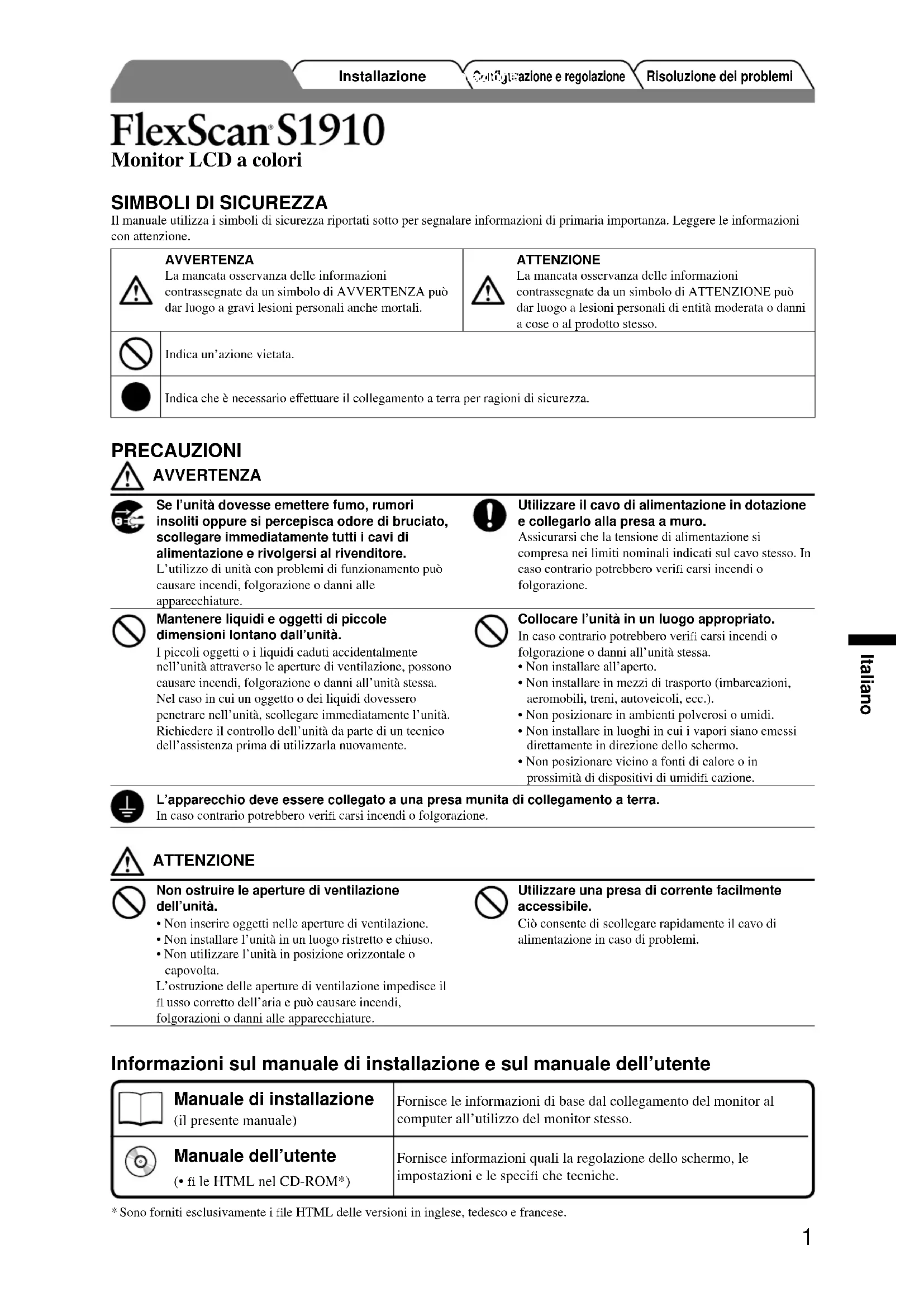 Il manuale utilizza i simboli di sicurezza riportati sotto per segnalare informazioni di primaria importanza. Leggere le informazioni con attenzione.AVVERTENZALa mancata osservanza delle informazioni contrassegnate da un simbolo di AVVERTENZA può dar luogo a gravi lesioni personali anche mortali.ATTENZIONELa mancata osservanza delle informazioni contrassegnate da un simbolo di ATTENZIONE può dar luogo a lesioni personali di entità moderata o danni a cose o al prodotto stesso.Indica un’azione vietata.Indica che è necessario effettuare il collegamento a terra per ragioni di sicurezza. PRECAUZIONI AVVERTENZA Se l’unità dovesse emettere fumo, rumori insoliti oppure si percepisca odore di bruciato, scollegare immediatamente tutti i cavi di alimentazione e rivolgersi al rivenditore.L’utilizzo di unità con problemi di funzionamento può causare incendi, folgorazione o danni alle apparecchiature.Utilizzare il cavo di alimentazione in dotazione e collegarlo alla presa a muro.Assicurarsi che la tensione di alimentazione si compresa nei limiti nominali indicati sul cavo stesso. In caso contrario potrebbero verifi carsi incendi o folgorazione.Mantenere liquidi e oggetti di piccole dimensioni lontano dall’unità.I piccoli oggetti o i liquidi caduti accidentalmente nell’unità attraverso le aperture di ventilazione, possono causare incendi, folgorazione o danni all’unità stessa. Nel caso in cui un oggetto o dei liquidi dovessero penetrare nell’unità, scollegare immediatamente l’unità. Richiedere il controllo dell’unità da parte di un tecnico dell’assistenza prima di utilizzarla nuovamente.Collocare l’unità in un luogo appropriato.In caso contrario potrebbero verifi carsi incendi o folgorazione o danni all’unità stessa.• Non installare all’aperto.• Non installare in mezzi di trasporto (imbarcazioni, aeromobili, treni, autoveicoli, ecc.).• Non posizionare in ambienti polverosi o umidi.• Non installare in luoghi in cui i vapori siano emessi direttamente in direzione dello schermo.• Non posizionare vicino a fonti di calore o in prossimità di dispositivi di umidifi cazione.L’apparecchio deve essere collegato a una presa munita di collegamento a terra.In caso contrario potrebbero verifi carsi incendi o folgorazione. ATTENZIONE Non ostruire le aperture di ventilazione dell’unità.• Non inserire oggetti nelle aperture di ventilazione.• Non installare l’unità in un luogo ristretto e chiuso.• Non utilizzare l’unità in posizione orizzontale o capovolta.L’ostruzione delle aperture di ventilazione impedisce il fl usso corretto dell’aria e può causare incendi, folgorazioni o danni alle apparecchiature.Utilizzare una presa di corrente facilmente accessibile.Ciò consente di scollegare rapidamente il cavo di alimentazione in caso di problemi. Monitor LCD a colori Risoluzione dei problemiConfigurazione e regolazioneInstallazionePreparazione Informazioni sul manuale di installazione e sul manuale dell’utente Manuale di installazione (il presente manuale)Fornisce le informazioni di base dal collegamento del monitor al computer all’utilizzo del monitor stesso. Manuale dell’utente (• fi le HTML nel CD-ROM*)Fornisce informazioni quali la regolazione dello schermo, le impostazioni e le specifi che tecniche.