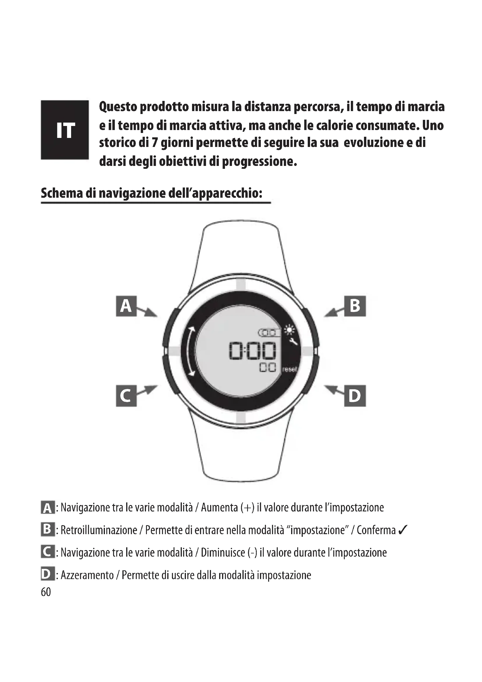 Questo prodotto misura la distanza percorsa, il tempo di marcia e il tempo di marcia attiva, ma anche le calorie consumate. Uno storico di 7 giorni permette di seguire la sua evoluzione e di darsi degli obiettivi di progressione. A B C D