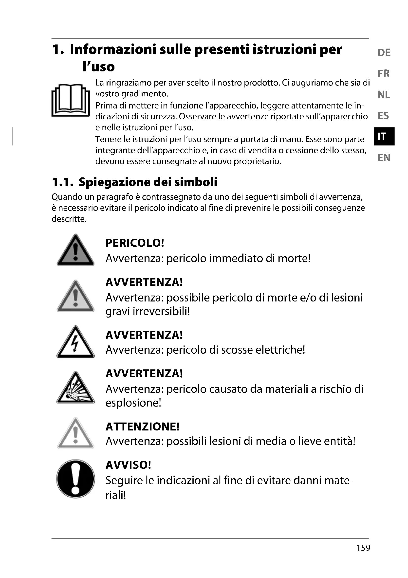 l’uso La ringraziamo per aver scelto il nostro prodotto. Ci auguriamo che sia di vostro gradimento. Prima di mettere in funzione l’apparecchio, leggere attentamente le in- dicazioni di sicurezza. Osservare le avvertenze riportate sull’apparecchio e nelle istruzioni per l’uso. Tenere le istruzioni per l’uso sempre a portata di mano. Esse sono parte integrante dell’apparecchio e, in caso di vendita o cessione dello stesso, devono essere consegnate al nuovo proprietario. 1.1. Spiegazione dei simboli Quando un paragrafo è contrassegnato da uno dei seguenti simboli di avvertenza, è necessario evitare il pericolo indicato al fine di prevenire le possibili conseguenze descritte. PERICOLO! Avvertenza: pericolo immediato di morte! AVVERTENZA! Avvertenza: possibile pericolo di morte e/o di lesioni gravi irreversibili! AVVERTENZA! Avvertenza: pericolo di scosse elettriche! AVVERTENZA! Avvertenza: pericolo causato da materiali a rischio di esplosione! ATTENZIONE! Avvertenza: possibili lesioni di media o lieve entità! AVVISO! Seguire le indicazioni al fine di evitare danni mate- riali!160 Ulteriori informazioni sull’utilizzo dell’apparecchio! AVVISO! Osservare le indicazioni contenute nelle istruzioni per l’uso!