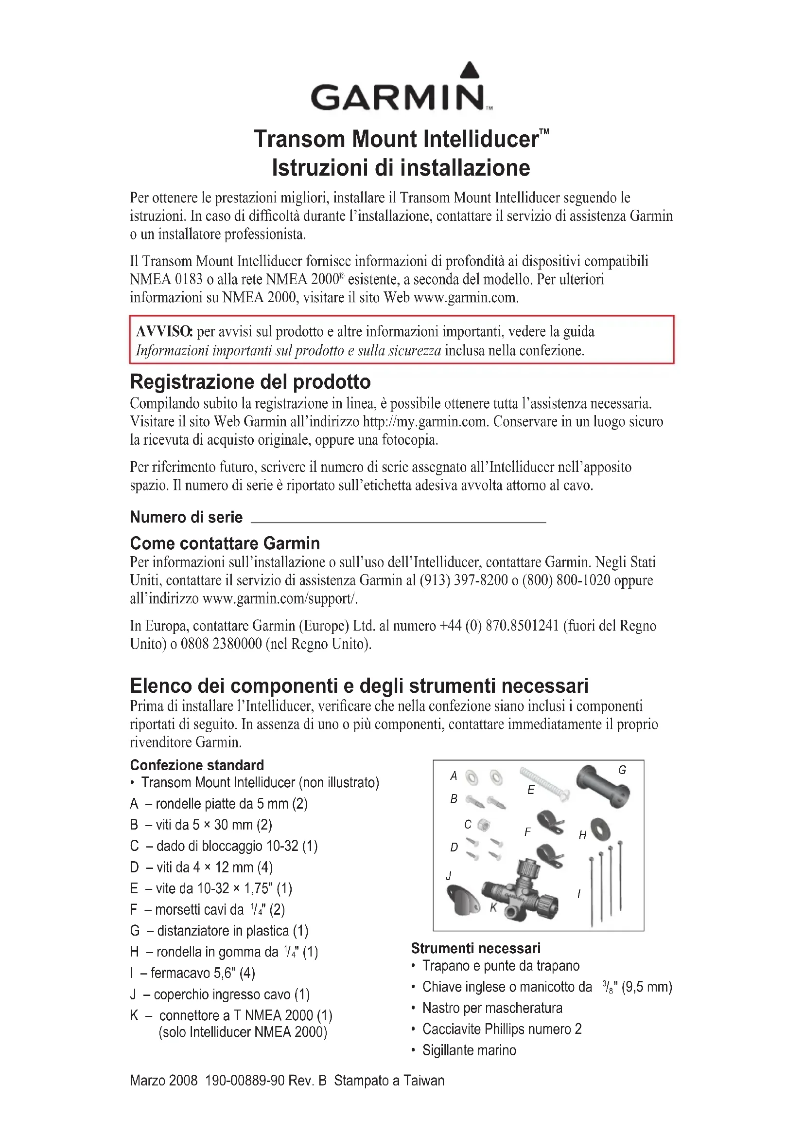 esistente, a seconda del modello. Per ulteriori informazioni su NMEA 2000, visitare il sito Web www.garmin.com. AVVISo : per avvisi sul prodotto e altre informazioni importanti, vedere la guida Informazioni importanti sul prodotto e sulla sicurezza inclusa nella confezione. Registrazione del prodotto Compilando subito la registrazione in linea, è possibile ottenere tutta l’assistenza necessaria. Visitare il sito Web Garmin all’indirizzo http://my.garmin.com. Conservare in un luogo sicuro la ricevuta di acquisto originale, oppure una fotocopia. Per riferimento futuro, scrivere il numero di serie assegnato all’Intelliducer nell’apposito spazio. Il numero di serie è riportato sull’etichetta adesiva avvolta attorno al cavo. Numero di serie Come contattare Garmin Per informazioni sull’installazione o sull’uso dell’Intelliducer, contattare Garmin. Negli Stati Uniti, contattare il servizio di assistenza Garmin al (913) 397-8200 o (800) 800-1020 oppure all’indirizzo www.garmin.com/support/. In Europa, contattare Garmin (Europe) Ltd. al numero +44 (0) 870.8501241 (fuori del Regno Unito) o 0808 2380000 (nel Regno Unito). Elenco dei componenti e degli strumenti necessari Prima di installare l’Intelliducer, vericare che nella confezione siano inclusi i componenti riportati di seguito. In assenza di uno o più componenti, contattare immediatamente il proprio rivenditore Garmin. Confezione standard