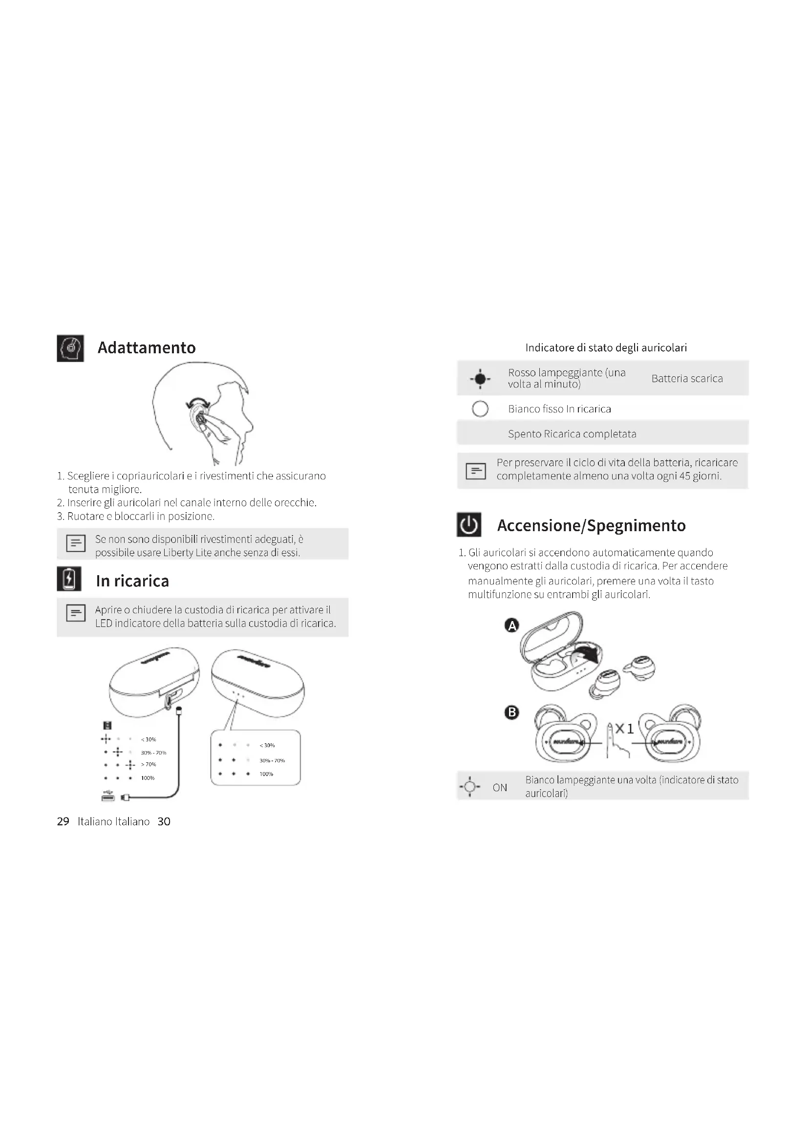 Se non sono disponibili rivestimenti adeguati, è possibile usare Liberty Lite anche senza di essi. In ricarica Aprire o chiudere la custodia di ricarica per attivare il LED indicatore della batteria sulla custodia di ricarica. < 30% 30% - 70% > 70% 100% < 30%30% - 70% 100% Indicatore di stato degli auricolari Rosso lampeggiante (una volta al minuto) Batteria scarica Bianco fisso In ricarica Spento Ricarica completata Per preservare il ciclo di vita della batteria, ricaricare completamente almeno una volta ogni 45 giorni. Accensione/Spegnimento