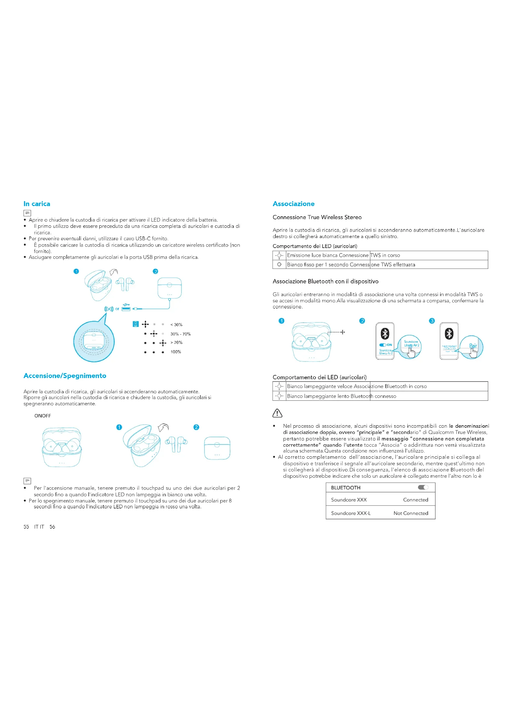 - Al corretto completamento dell’associazione, l’auricolare principale si collega al dispositivo e trasferisce il segnale all’auricolare secondario, mentre quest’ultimo non si collegherà al dispositivo.Di conseguenza, l’elenco di associazione Bluetooth del dispositivo potrebbe indicare che solo un auricolare è collegato mentre l’altro non lo è57 IT IT 58 Per l'associazione con un altro dispositivo Bluetooth, riporre gli auricolari nella custodia di ricarica e assicurarsi che vengano caricati, tenere il coperchio aperto, quindi tenere premuto il pulsante sulla parte inferiore della custodia di ricarica per 3 secondi no a quando gli indicatori LED sugli auricolari non lampeggiano velocemente in bianco.