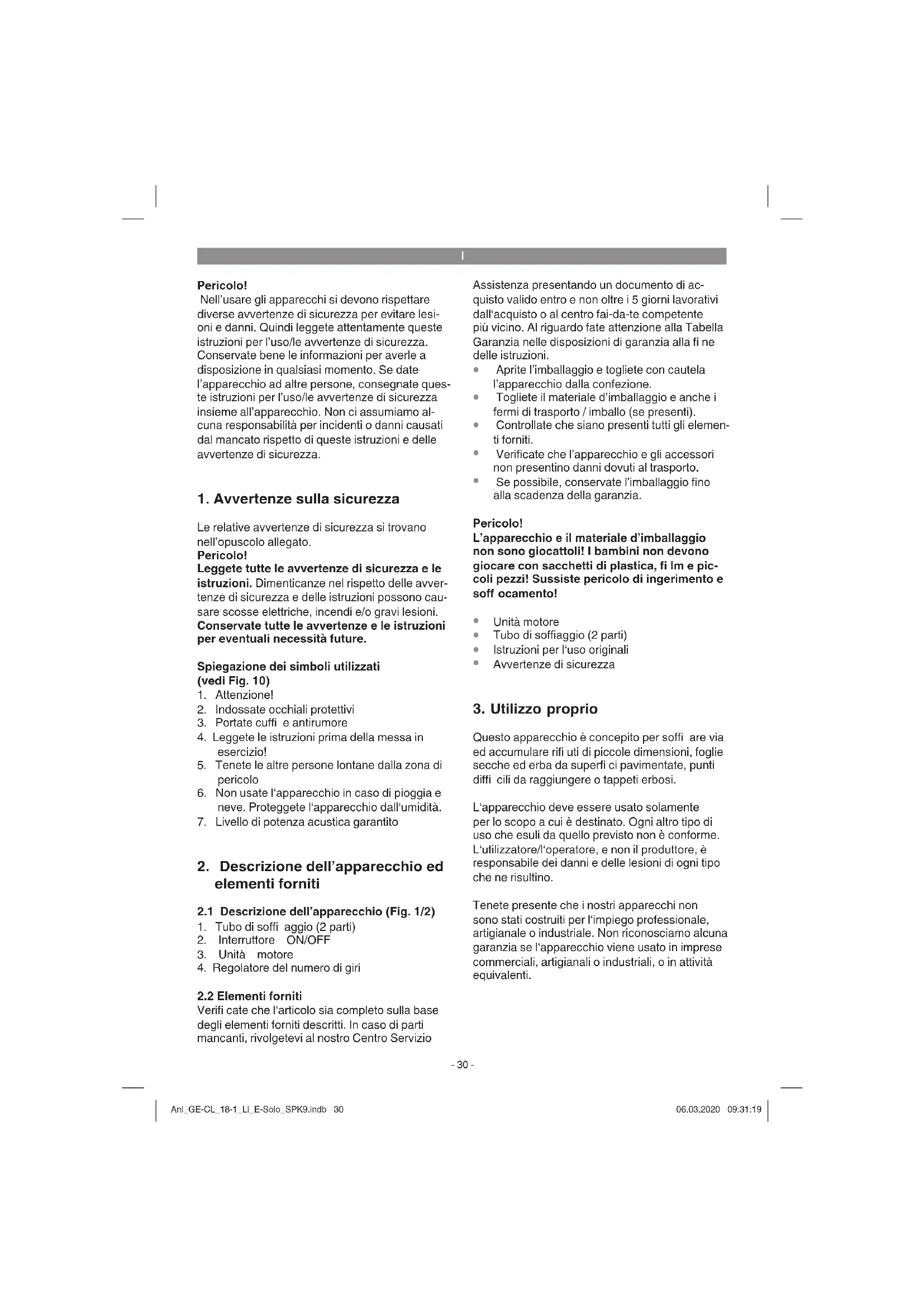 Questo apparecchio è concepito per soffi are via ed accumulare rifi uti di piccole dimensioni, foglie secche ed erba da superfi ci pavimentate, punti diffi cili da raggiungere o tappeti erbosi. L‘apparecchio deve essere usato solamente per lo scopo a cui è destinato. Ogni altro tipo di uso che esuli da quello previsto non è conforme. L‘utilizzatore/l‘operatore, e non il produttore, è responsabile dei danni e delle lesioni di ogni tipo che ne risultino. Tenete presente che i nostri apparecchi non sono stati costruiti per l‘impiego professionale, artigianale o industriale. Non riconosciamo alcuna garanzia se l‘apparecchio viene usato in imprese commerciali, artigianali o industriali, o in attività equivalenti. Anl_GE-CL_18-1_Li_E-Solo_SPK9.indb 30Anl_GE-CL_18-1_Li_E-Solo_SPK9.indb 30 06.03.2020 09:31:1906.03.2020 09:31:19I